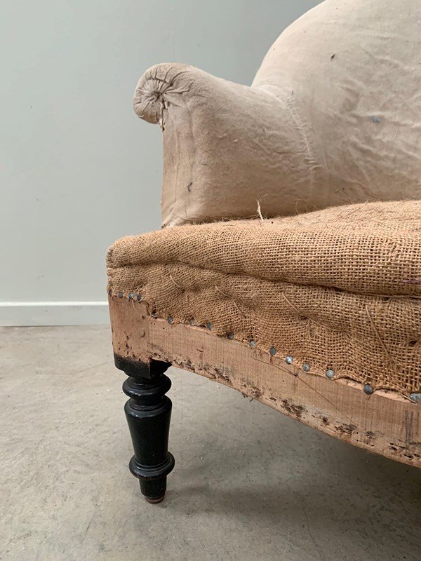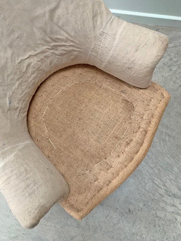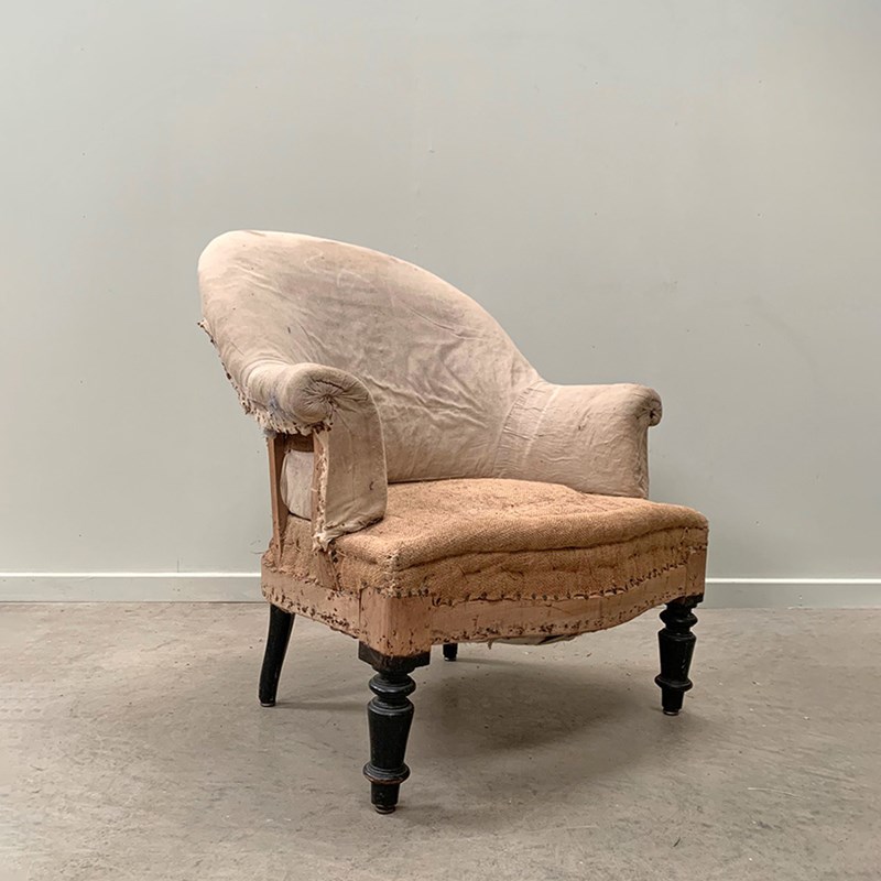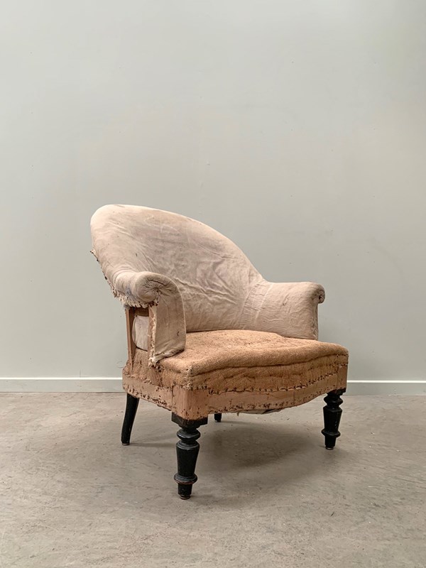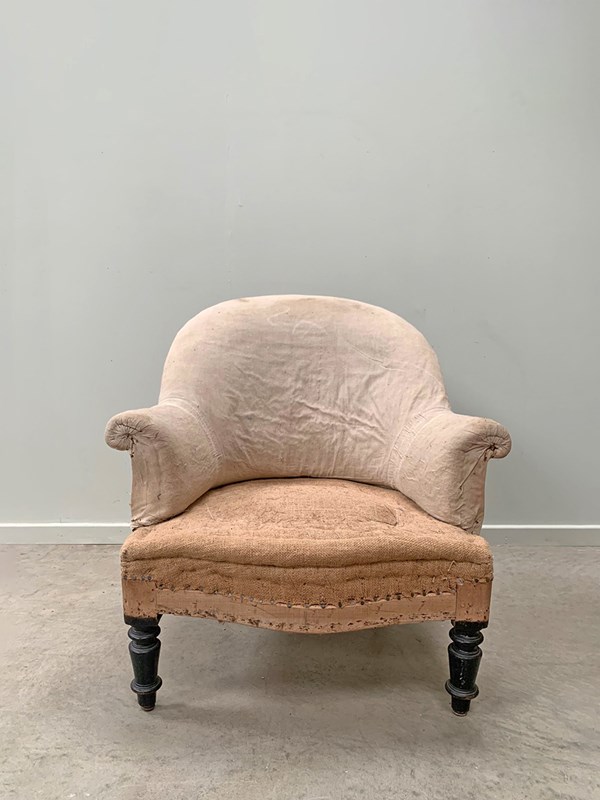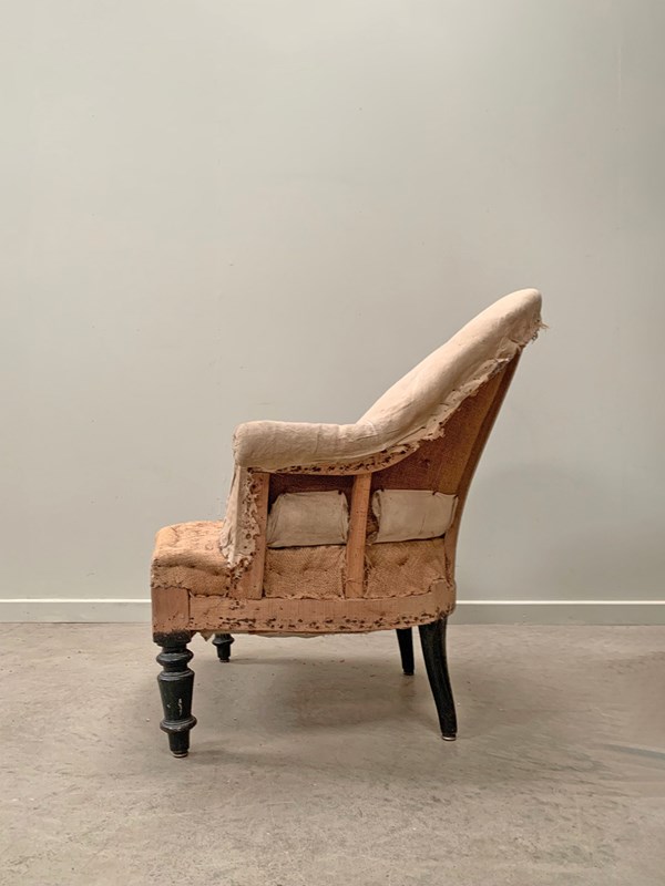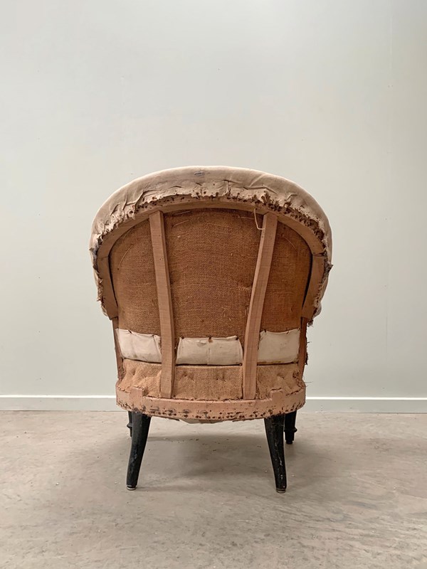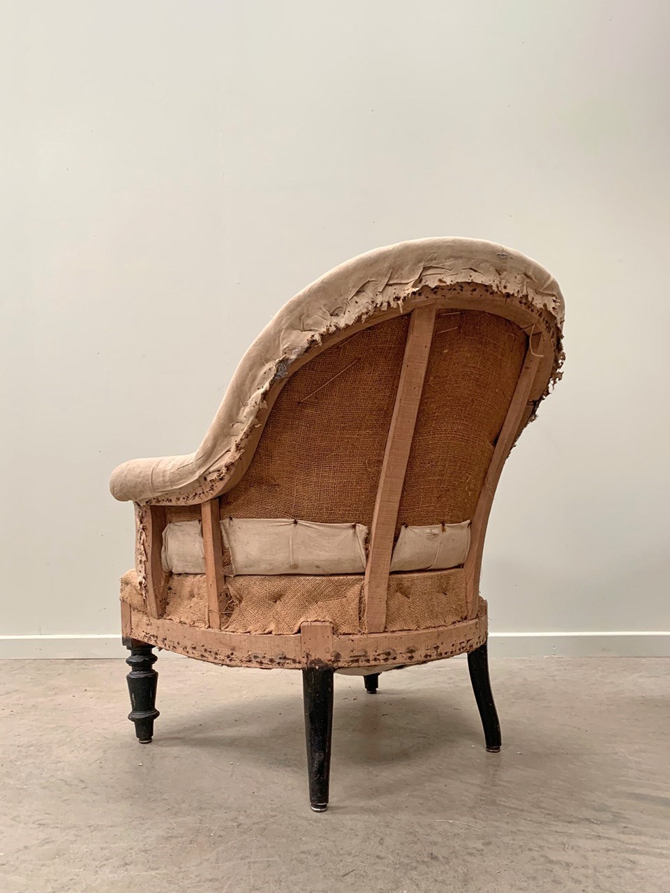 Napoleon III crapaud armchair, with scroll arms and set on turned ebonised legs.