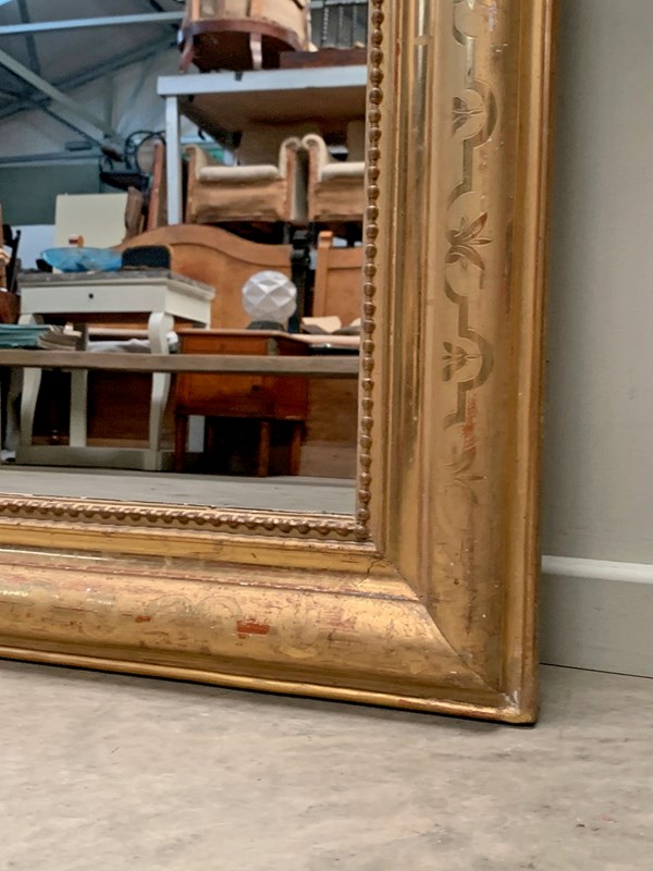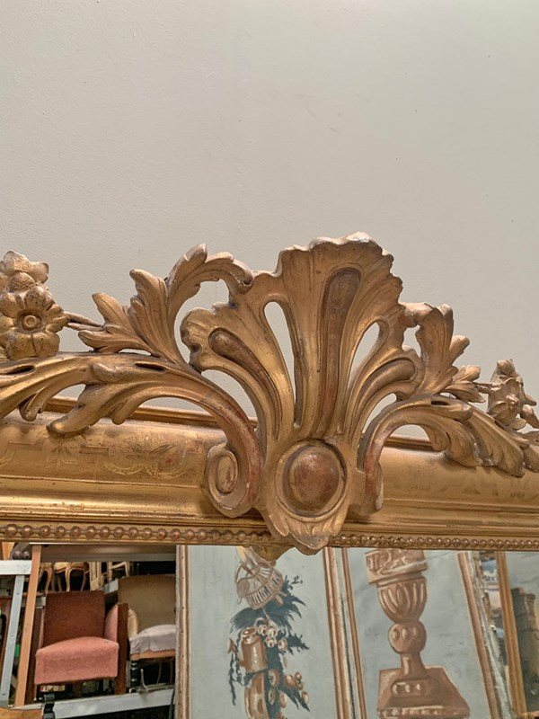 Beautiful mid 1800's mirror. With an ornate crest with red boule showing through the gilding.