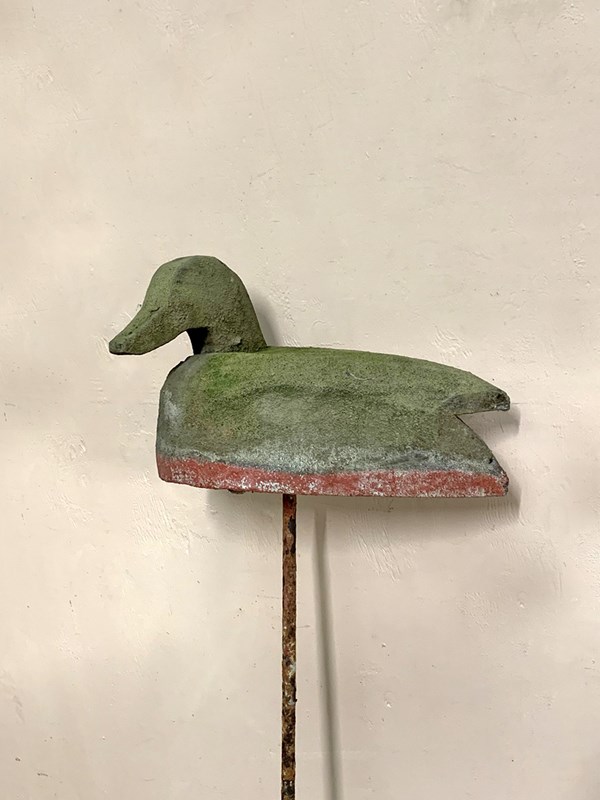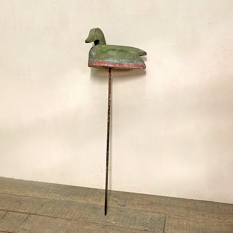 Mounted on a sturdy metal spike and with a red painted stripe around the bottom of the duck.
