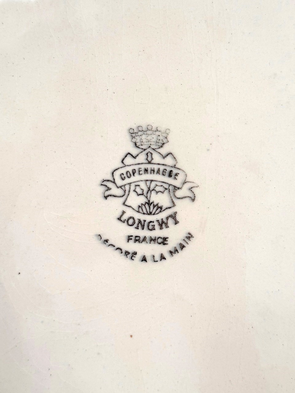 Stamped on the reverse "Longwy, France" a pottery town which is almost on the French/Luxembourg border. The series is "Copenhague" and is made from ceramic. The set dates around the 1940's.