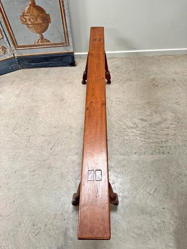 Circa 1800's fruitwood bench with turned and stretchered legs.