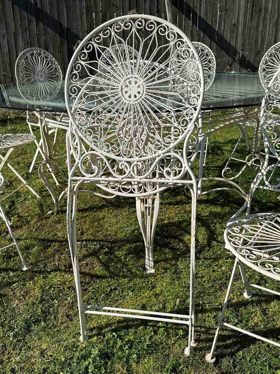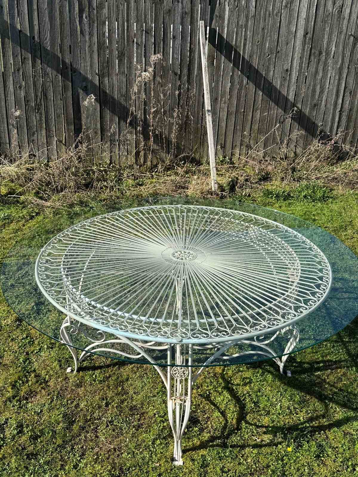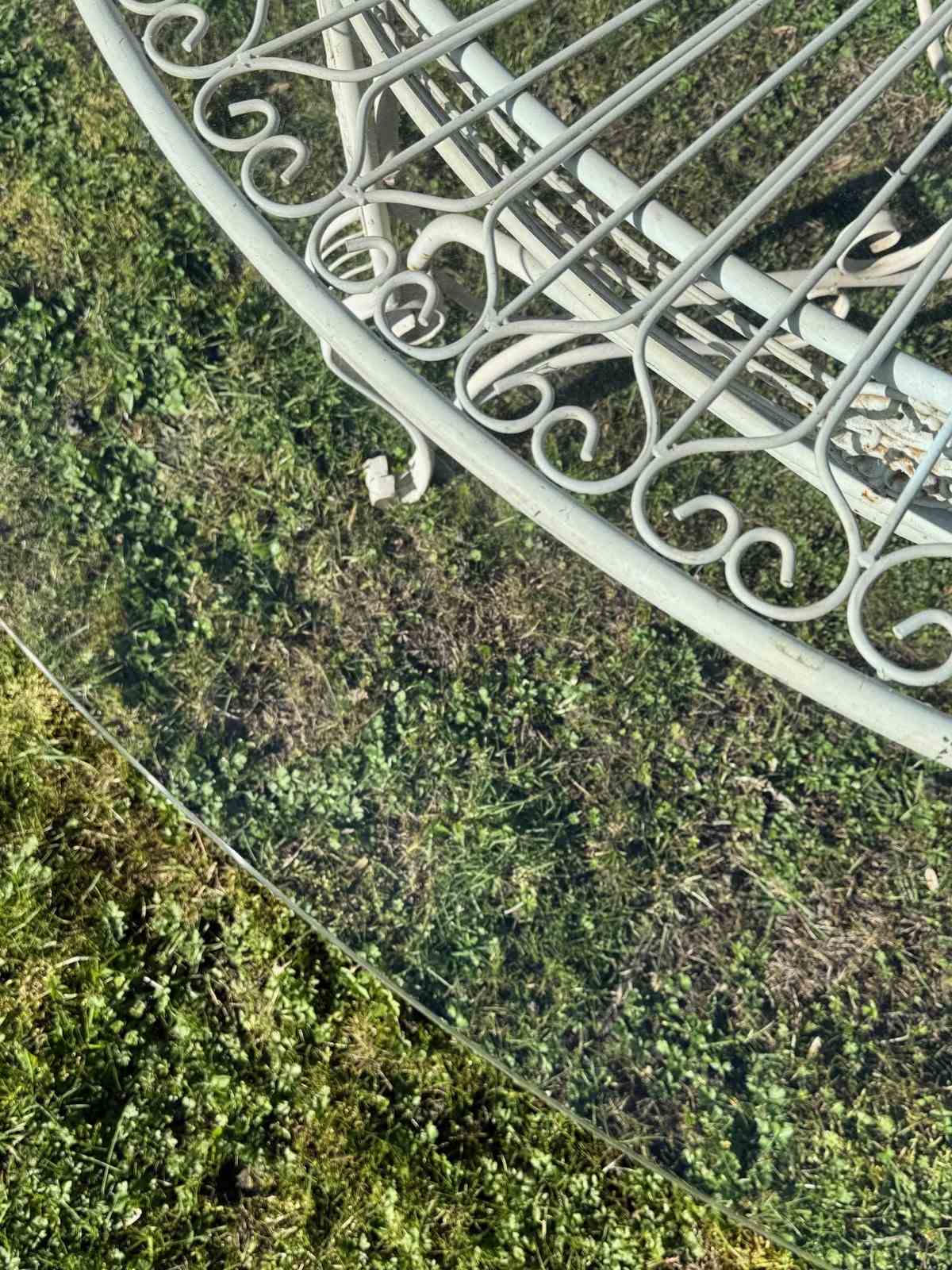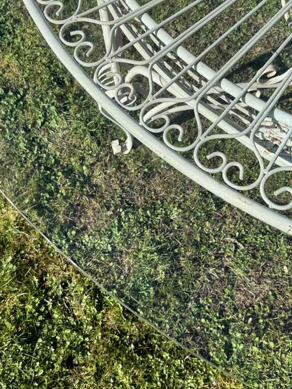 The heavy and thick glass top rests on top of the scrolled metalwork base.