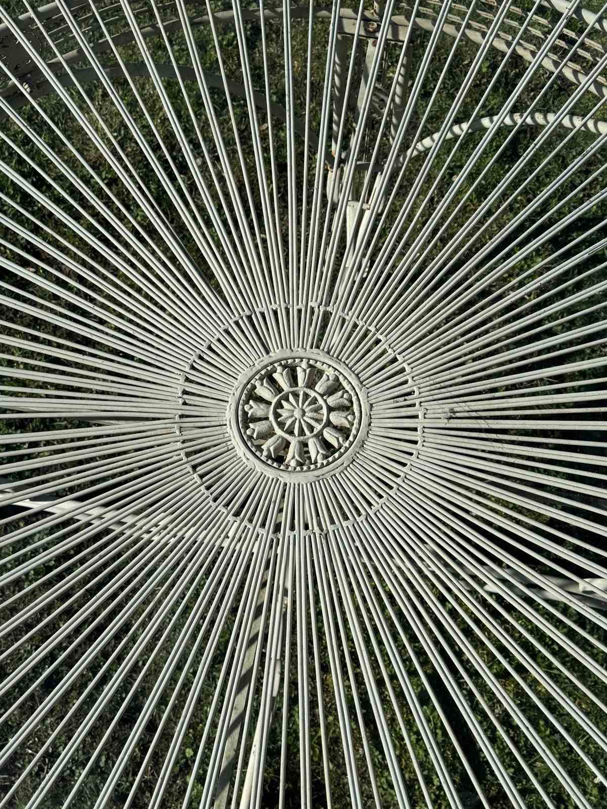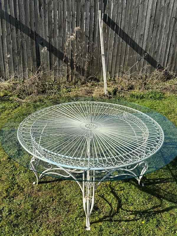 A very large 1960/70s circular garden table and a set of 10 folding chairs.