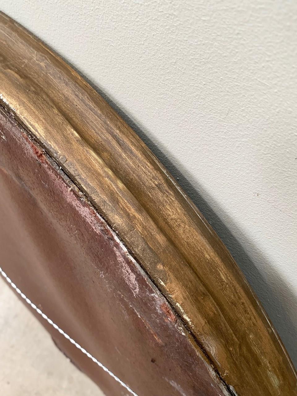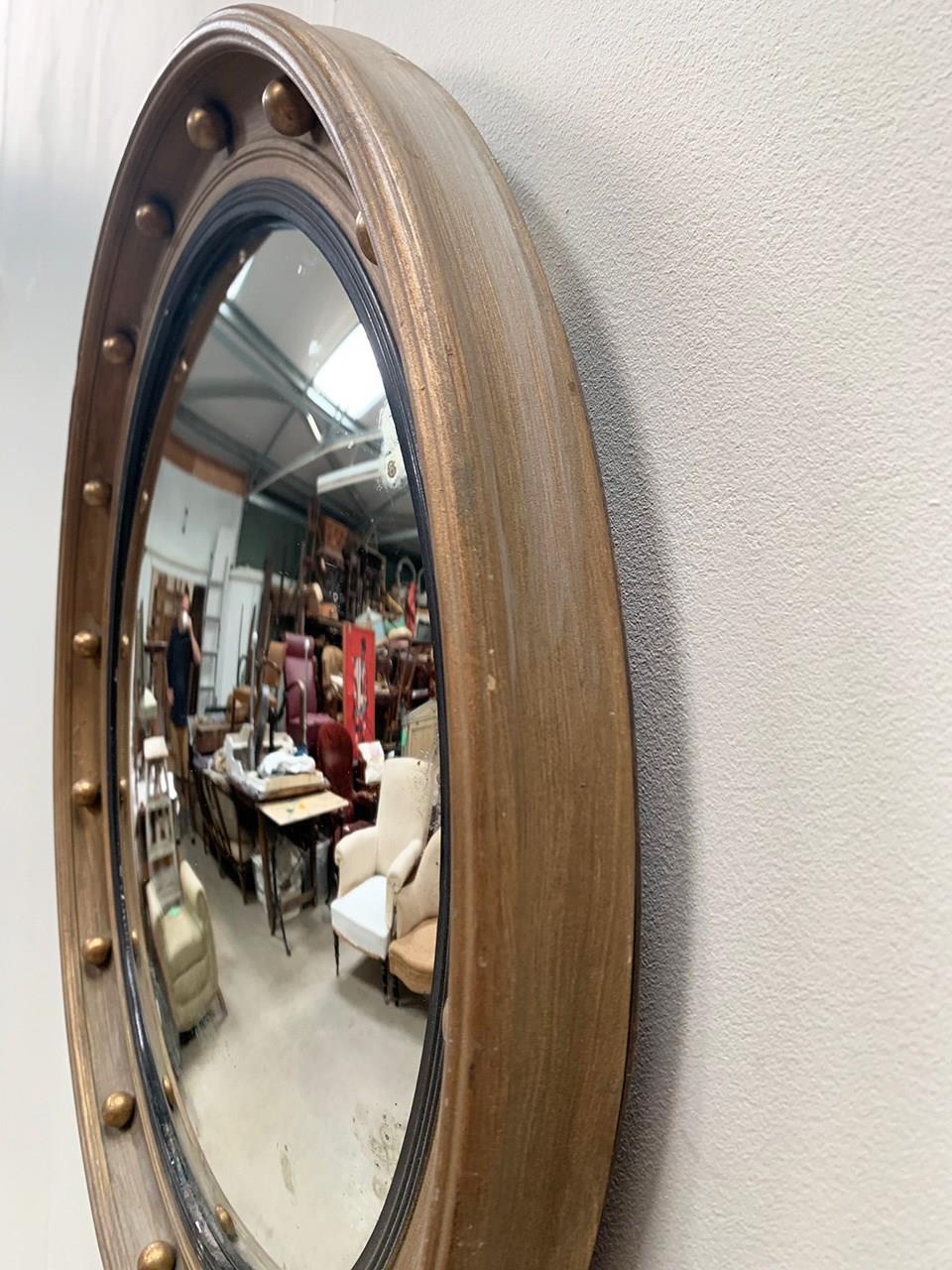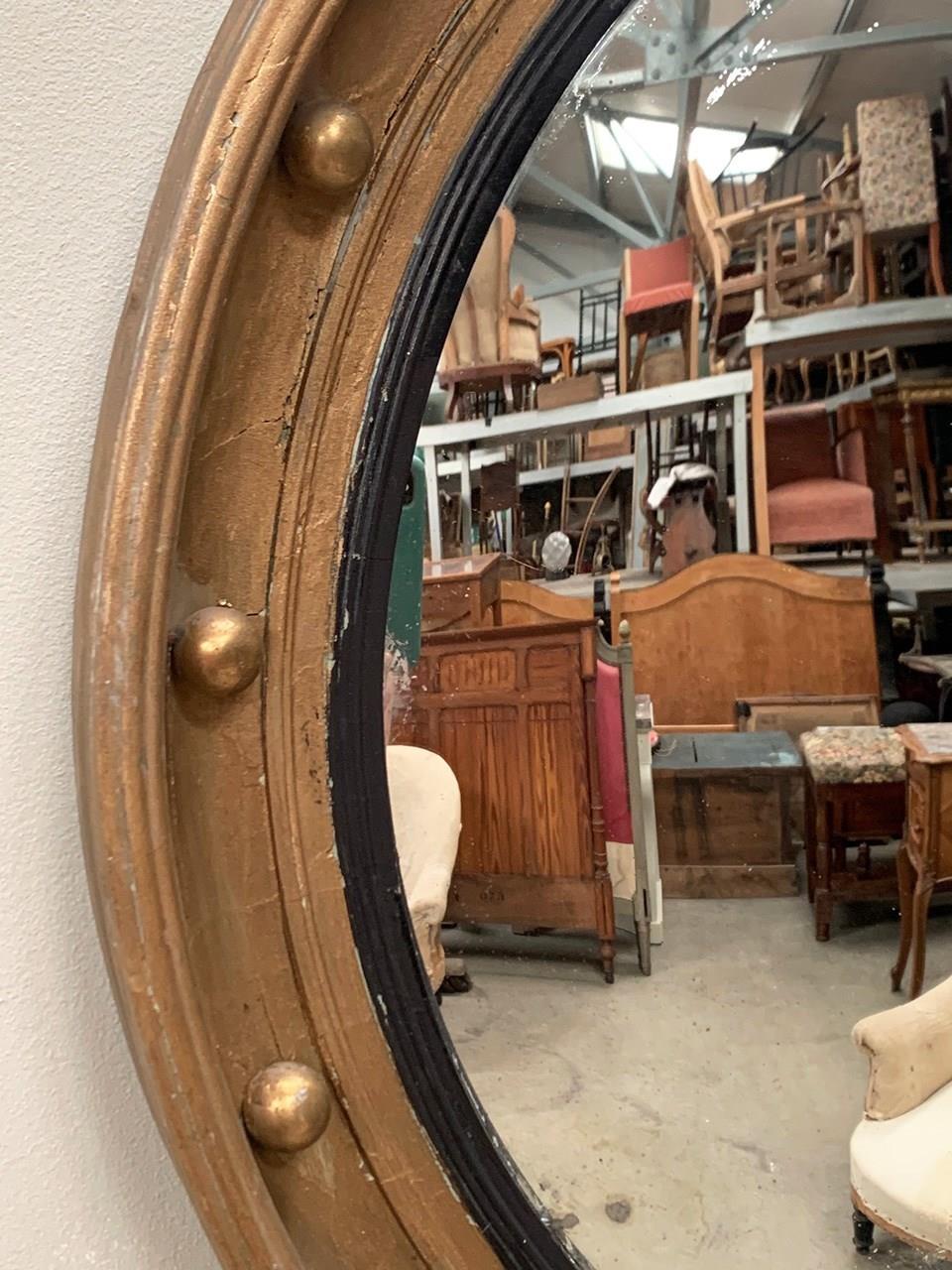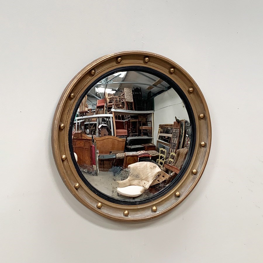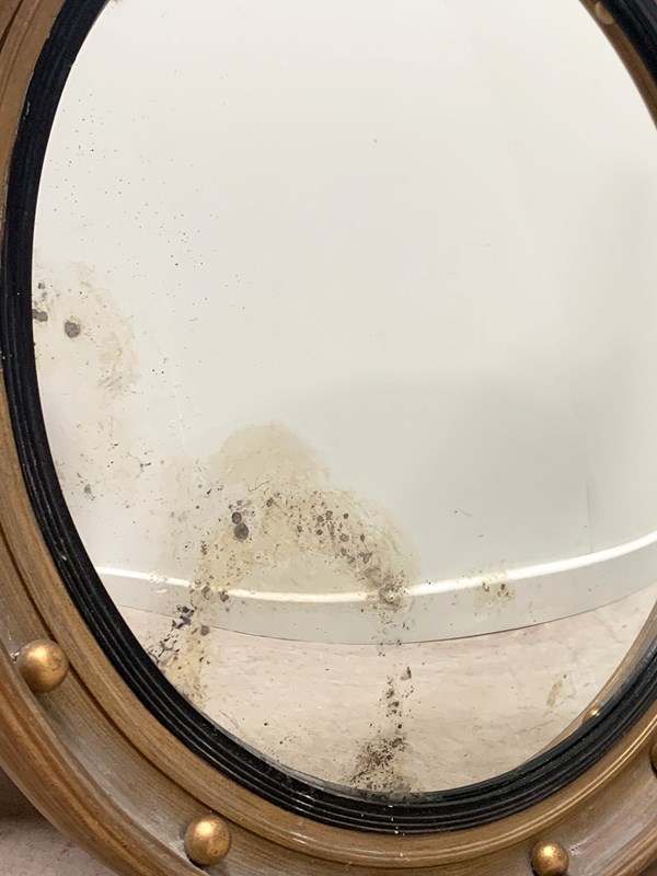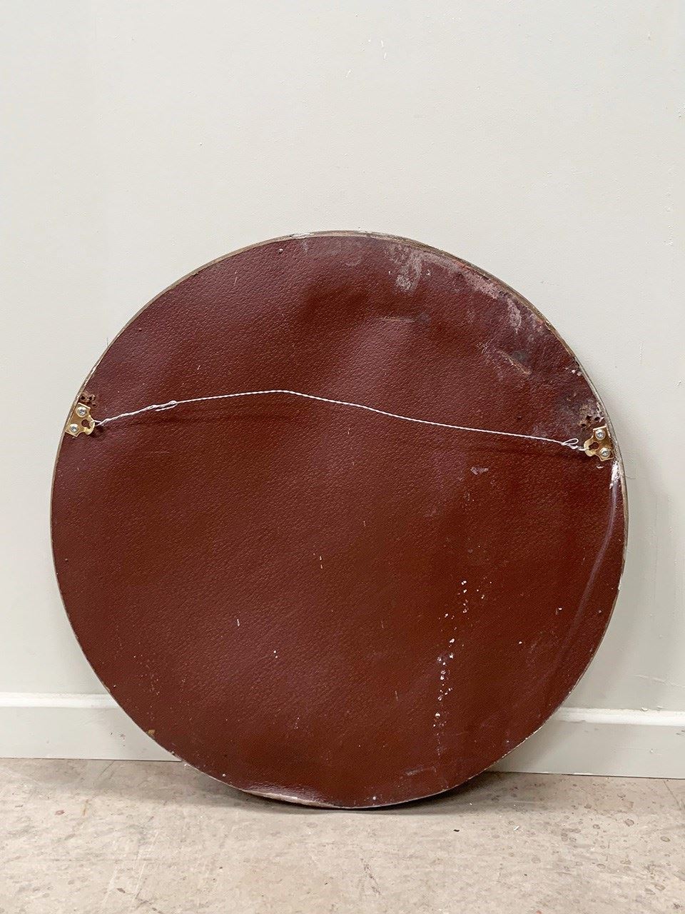 With decorative studs, and is ready to hang. The curved mirror plate is foxed, mainly at the bottom of the plate - see photos.