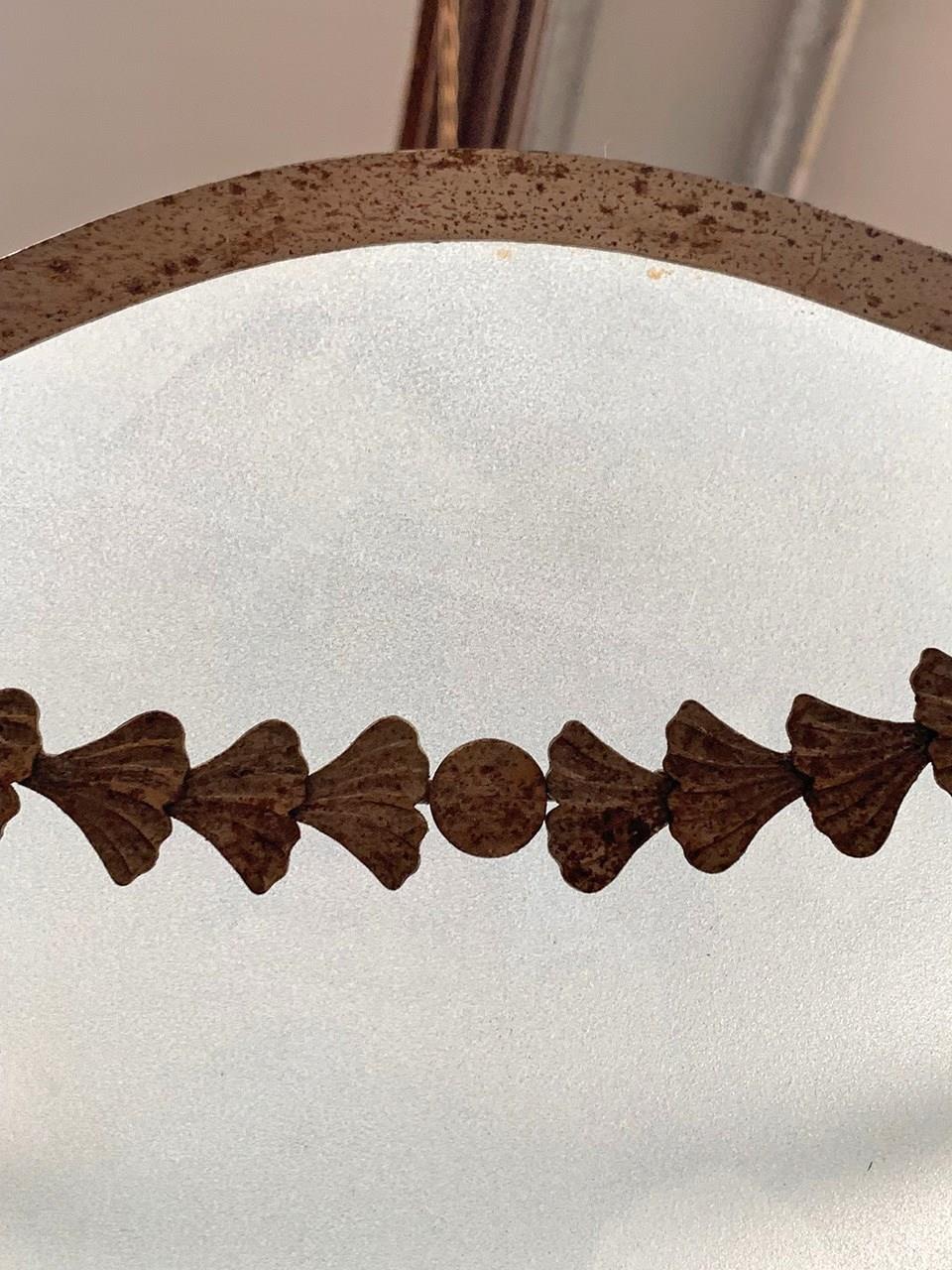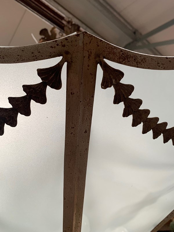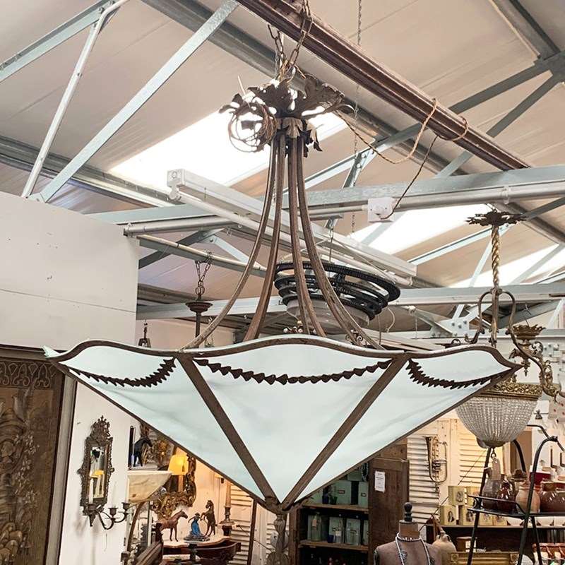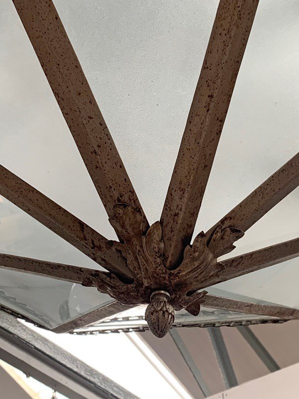 We love the decorative metal swags draped over each of the glass panels. The light has 6 arms which meet a stylised acanthus leaf ceiling rose. The glass panels are intact; viewing them from inside there are a couple which have rust at the bottom and one has a rough edge, none of which are visible though from the outside.