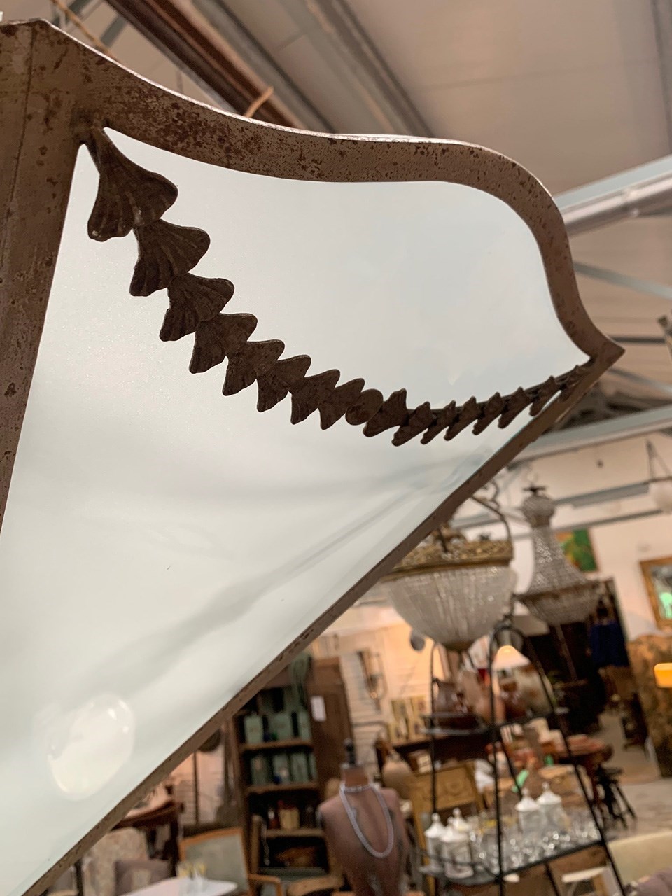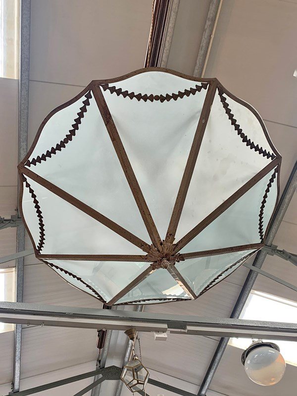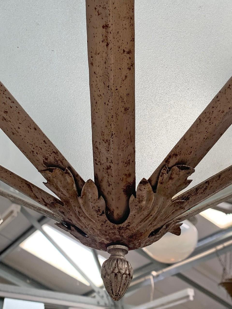 Sourced from a chateau in Burgundy, this stunning metal and glass light is fitted with 8 bulbs, all re-wired by our electrician. There are 8 opaque and shaped glass panel inserts.