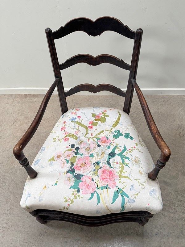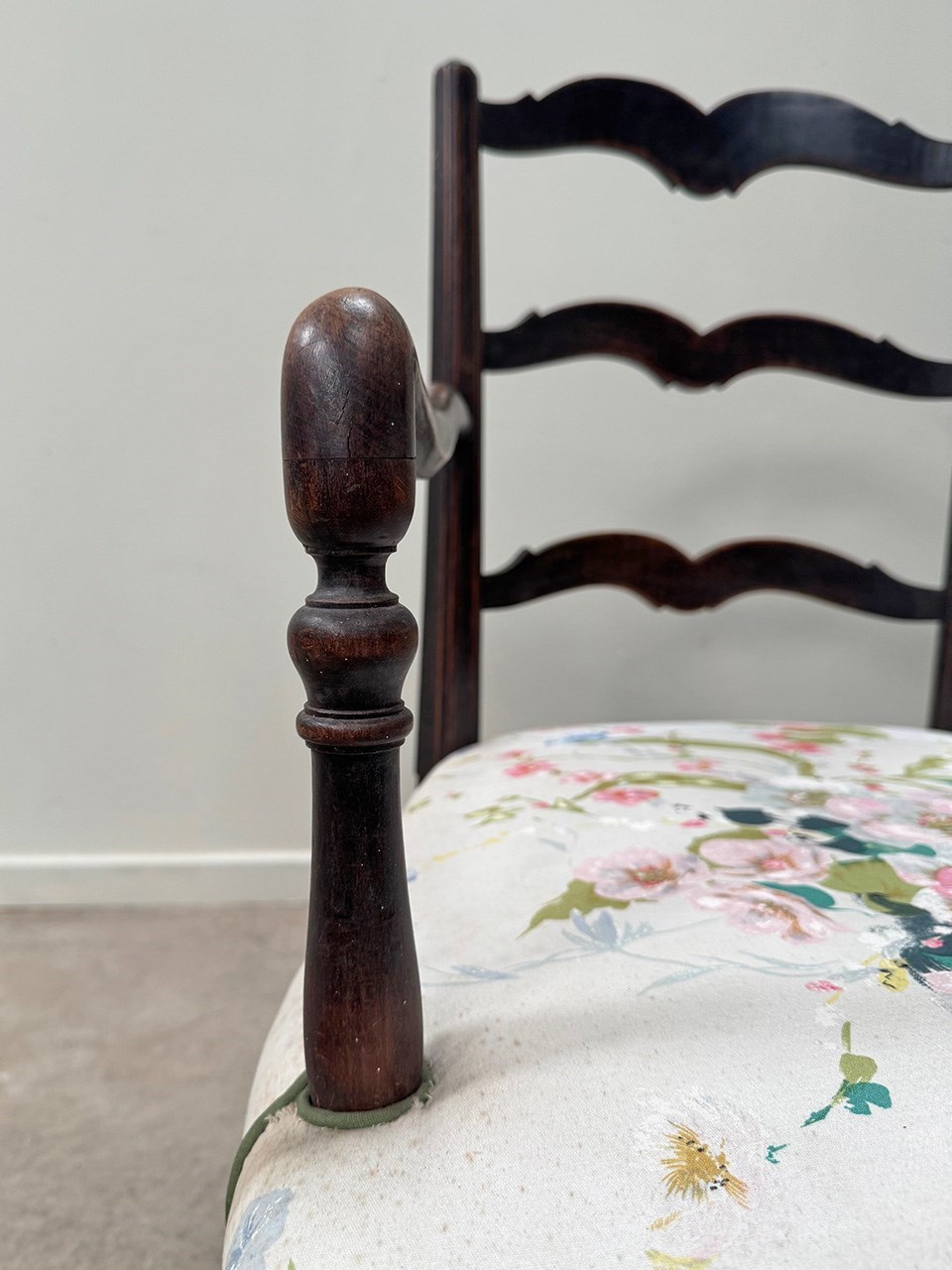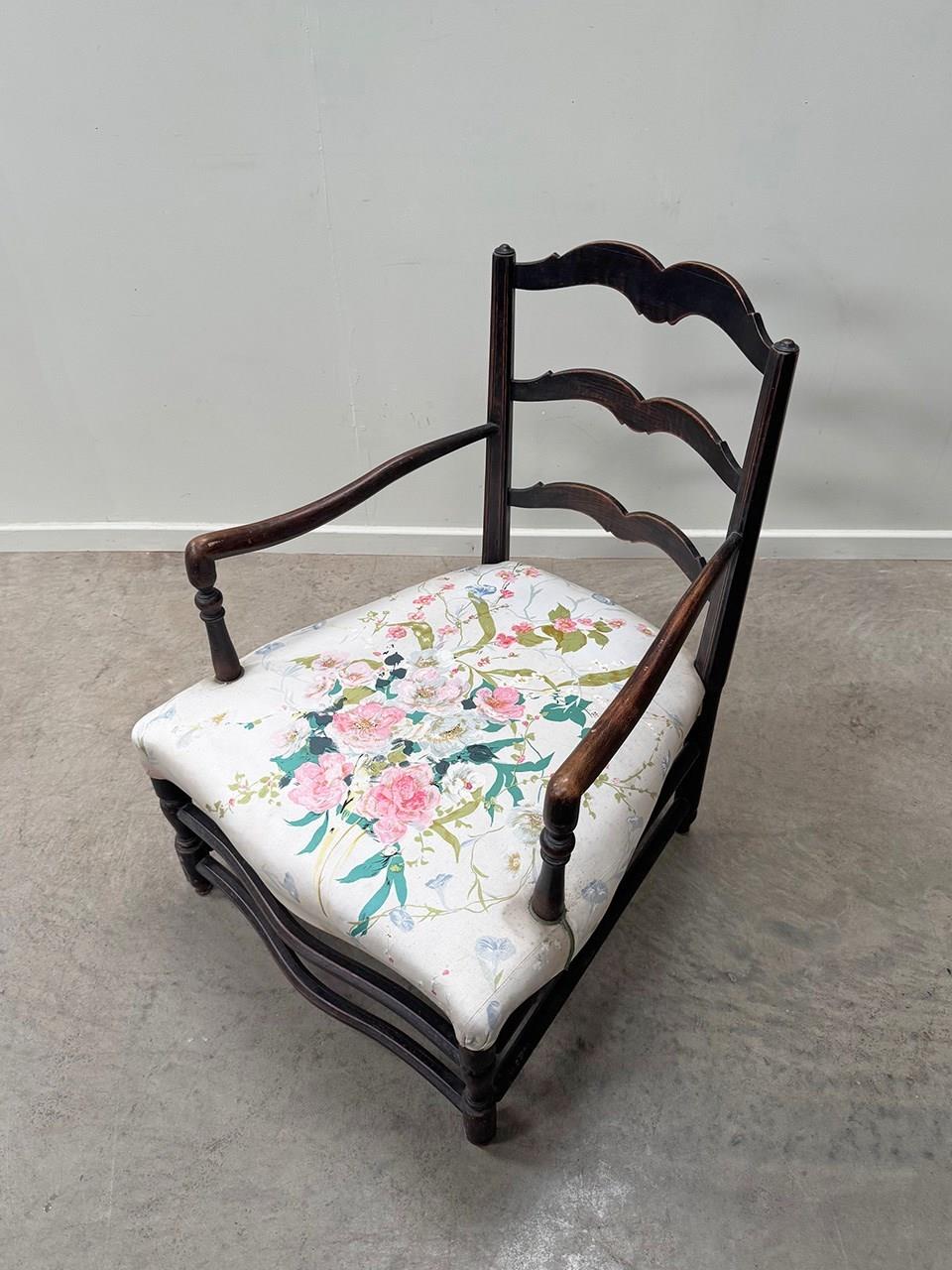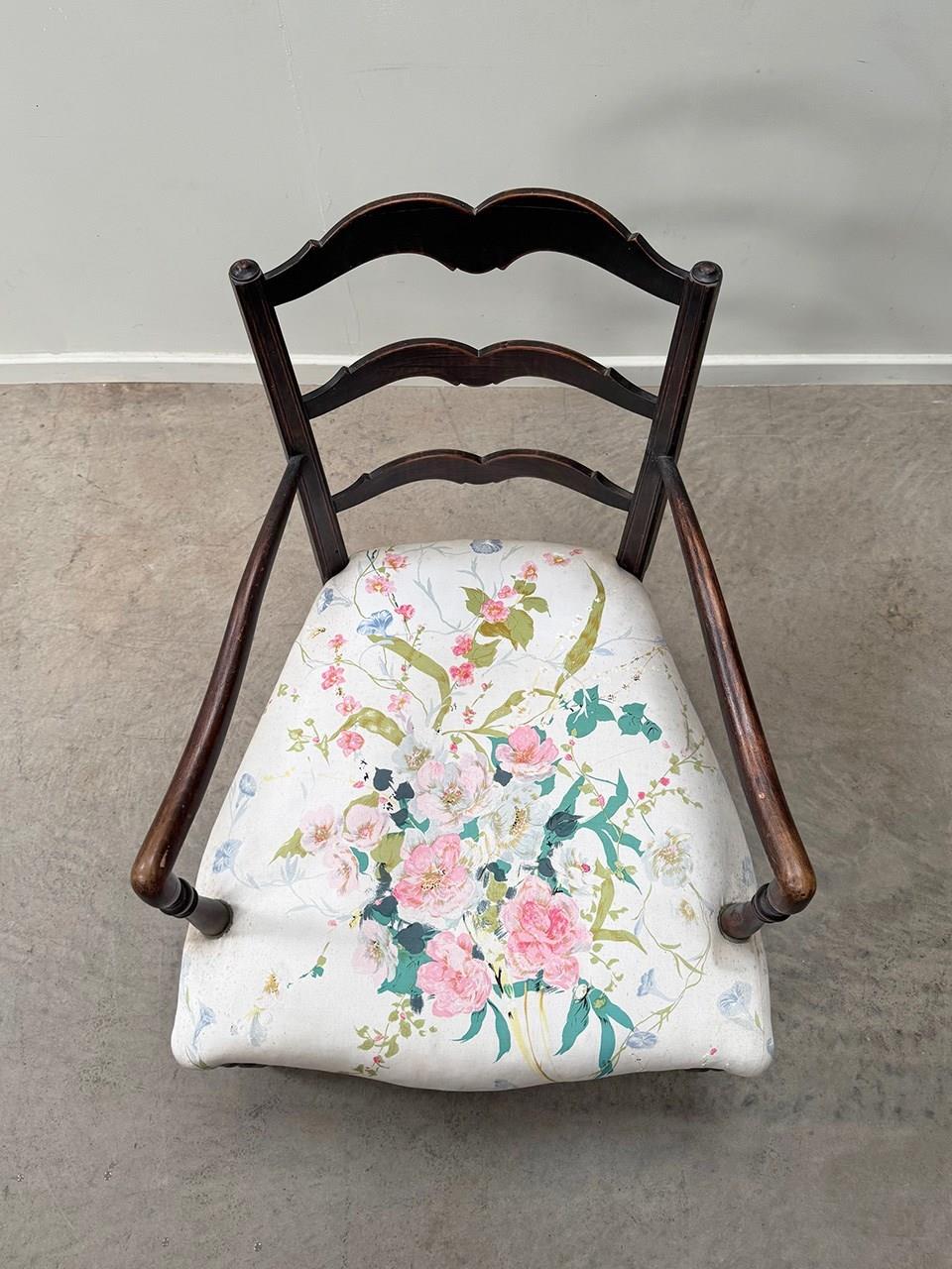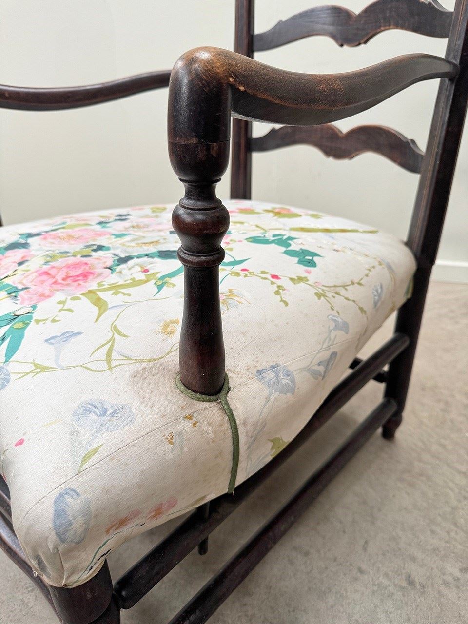 With double stretchers and a triple ladder back. The chair is sturdy and the sprung seat is comfortable, it appears to have been re-upholstered in recent years in a thick white sateen fabric with a large scale floral design.