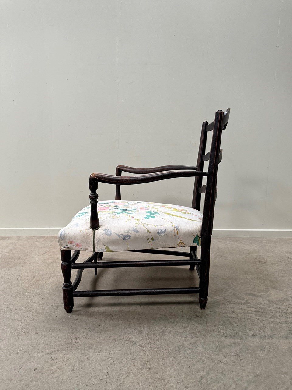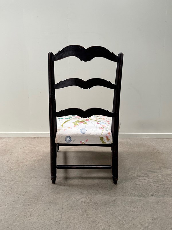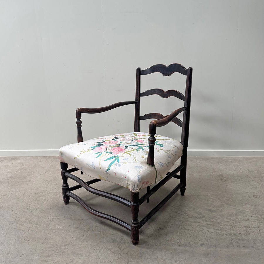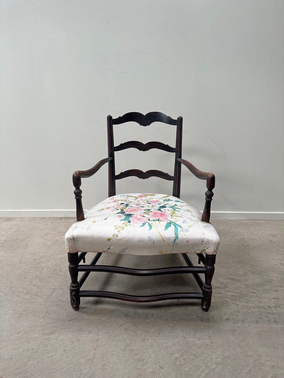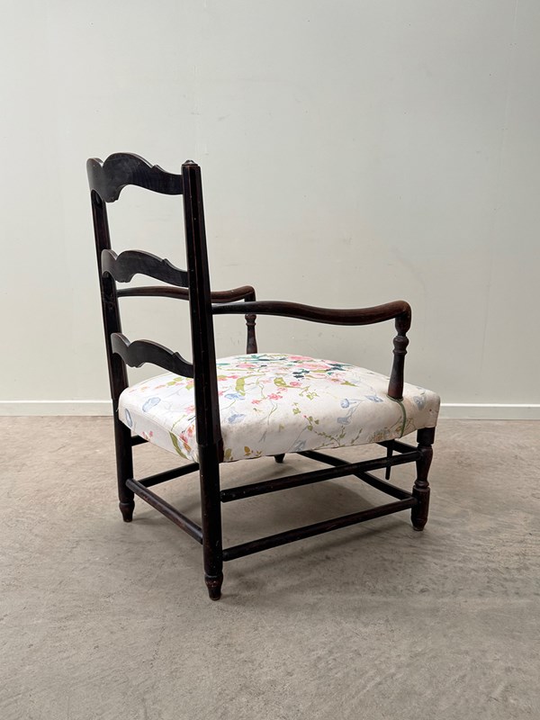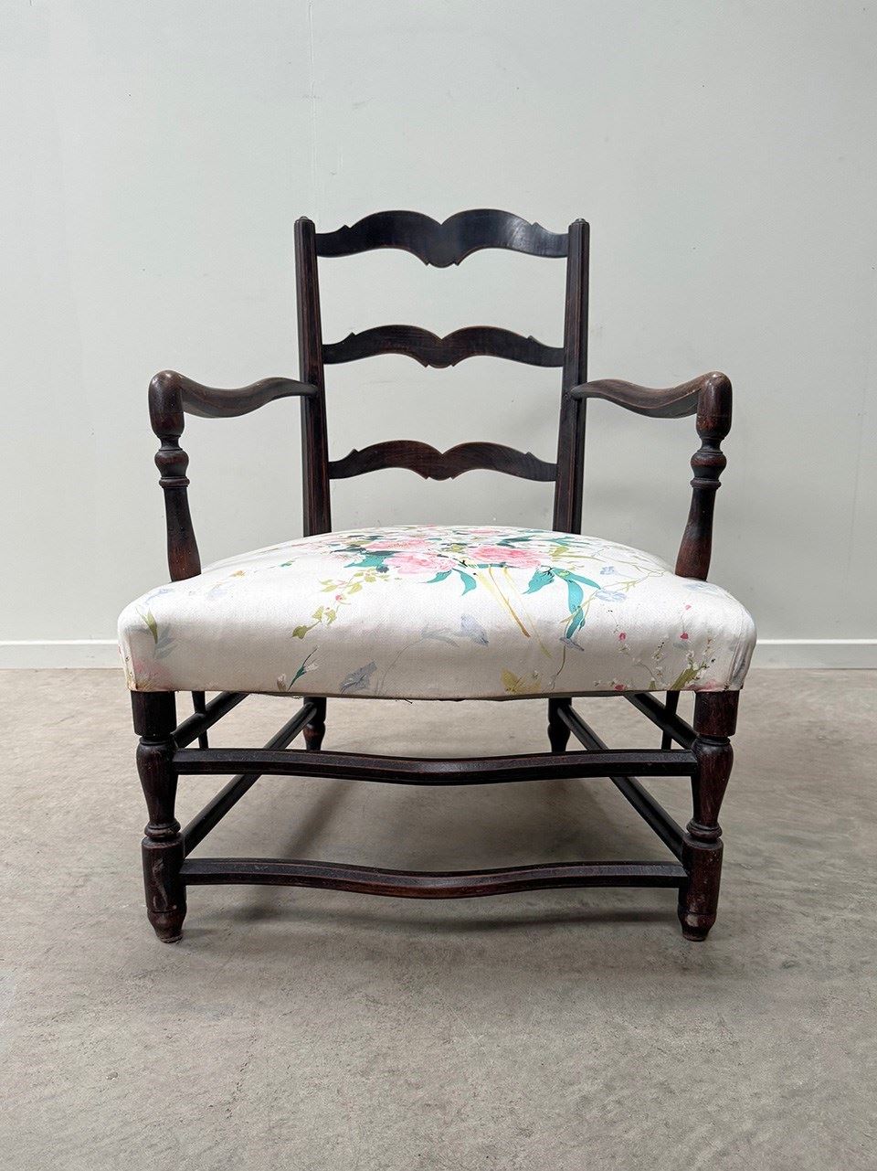 With double stretchers and a triple ladder back. The chair is sturdy and the sprung seat is comfortable, it appears to have been re-upholstered in recent years in a thick white sateen fabric with a large scale floral design.
