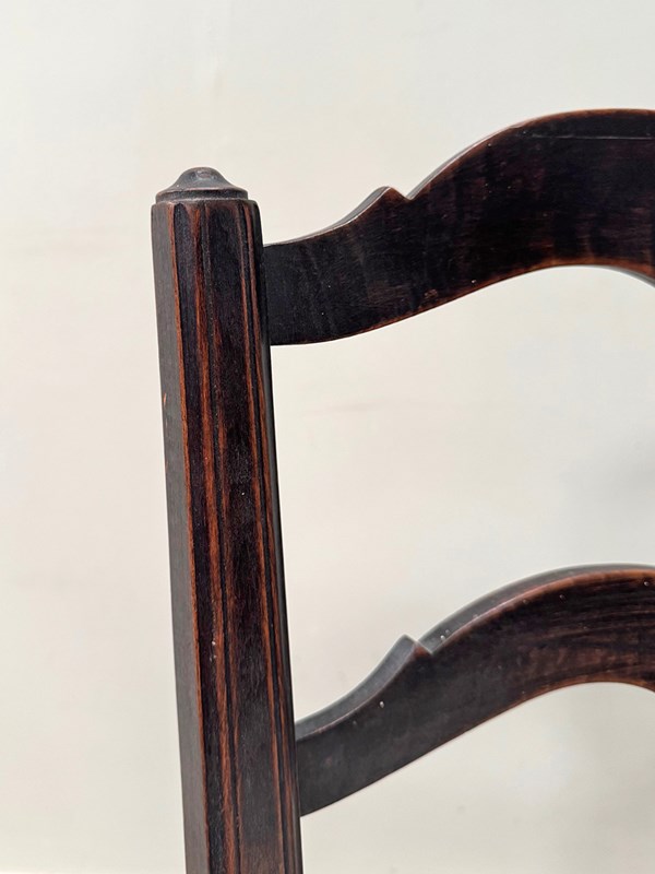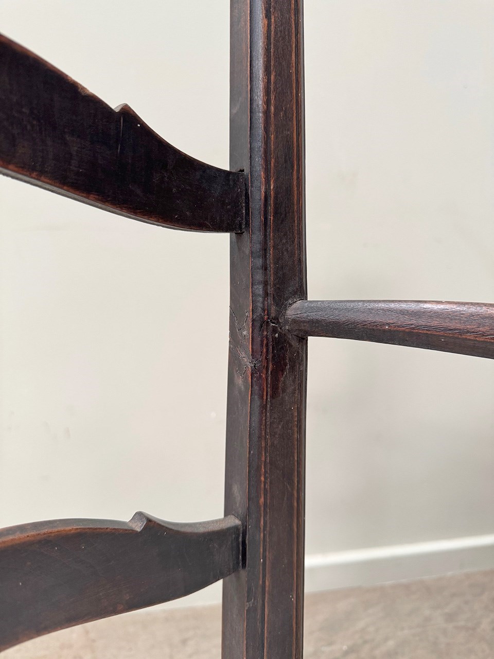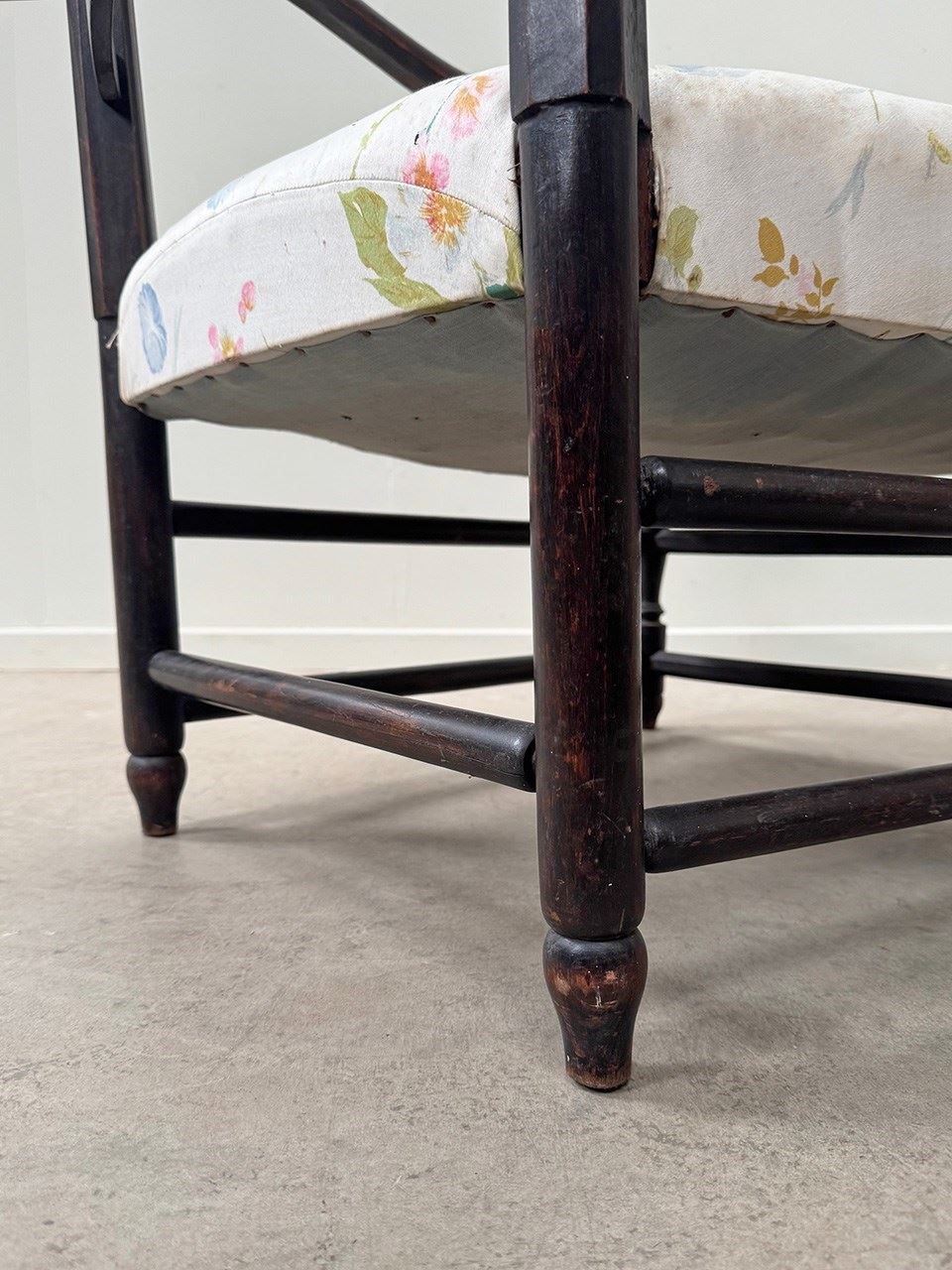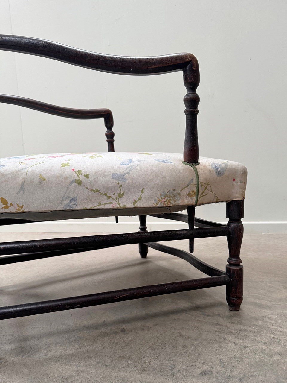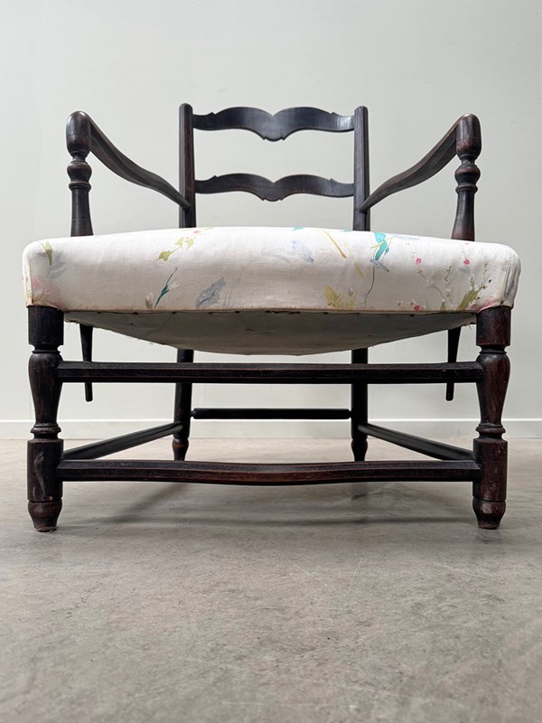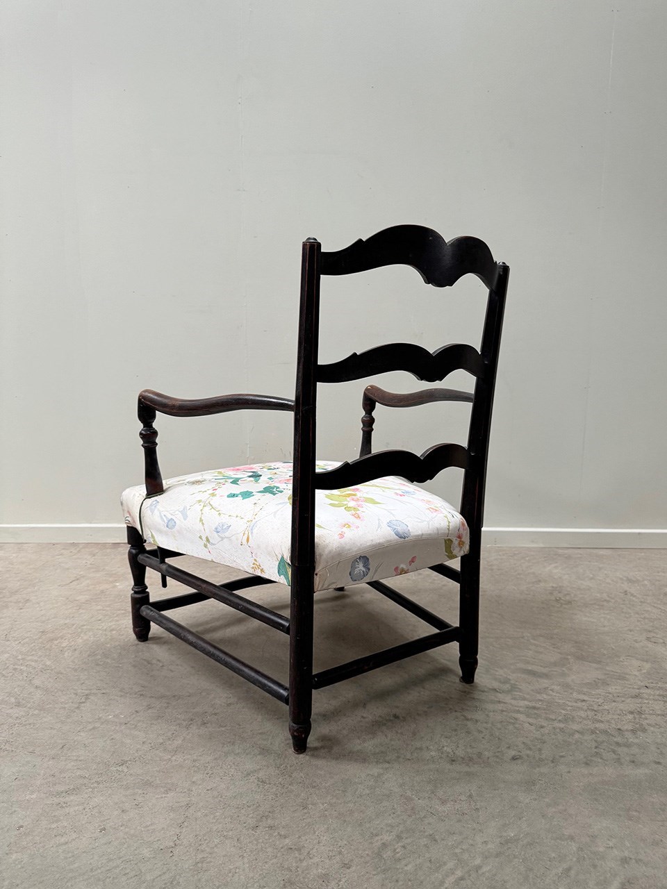 With double stretchers and a triple ladder back. The chair is sturdy and the sprung seat is comfortable, it appears to have been re-upholstered in recent years in a thick white sateen fabric with a large scale floral design.
