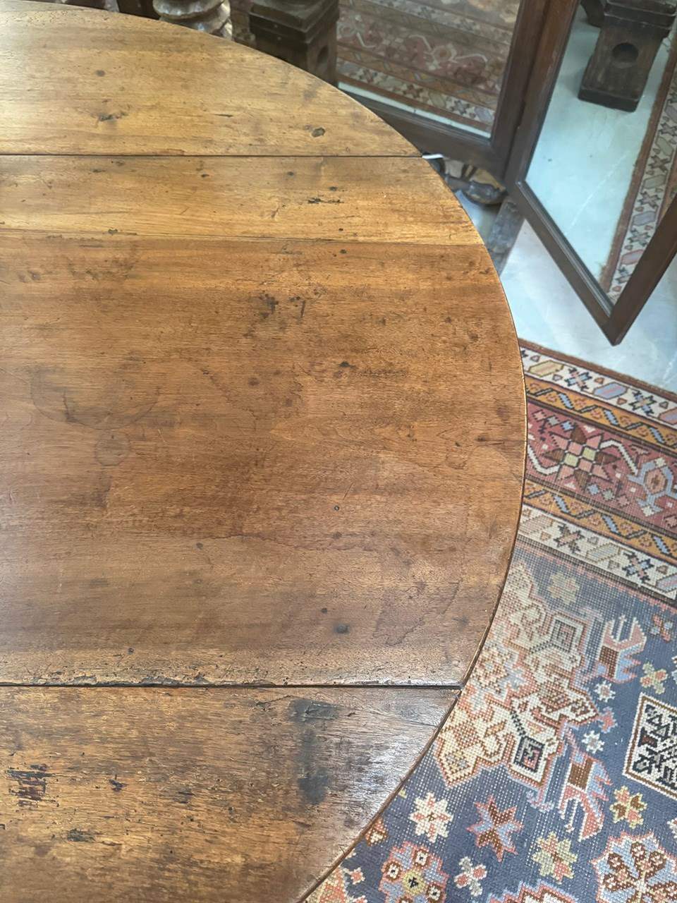 There are supporting arms which pull out for these leaves to rest on. However, if you prefer the leaves to remain out, we can make this into a fixed position should you wish. We have refinished the top and applied a mid brown wax.