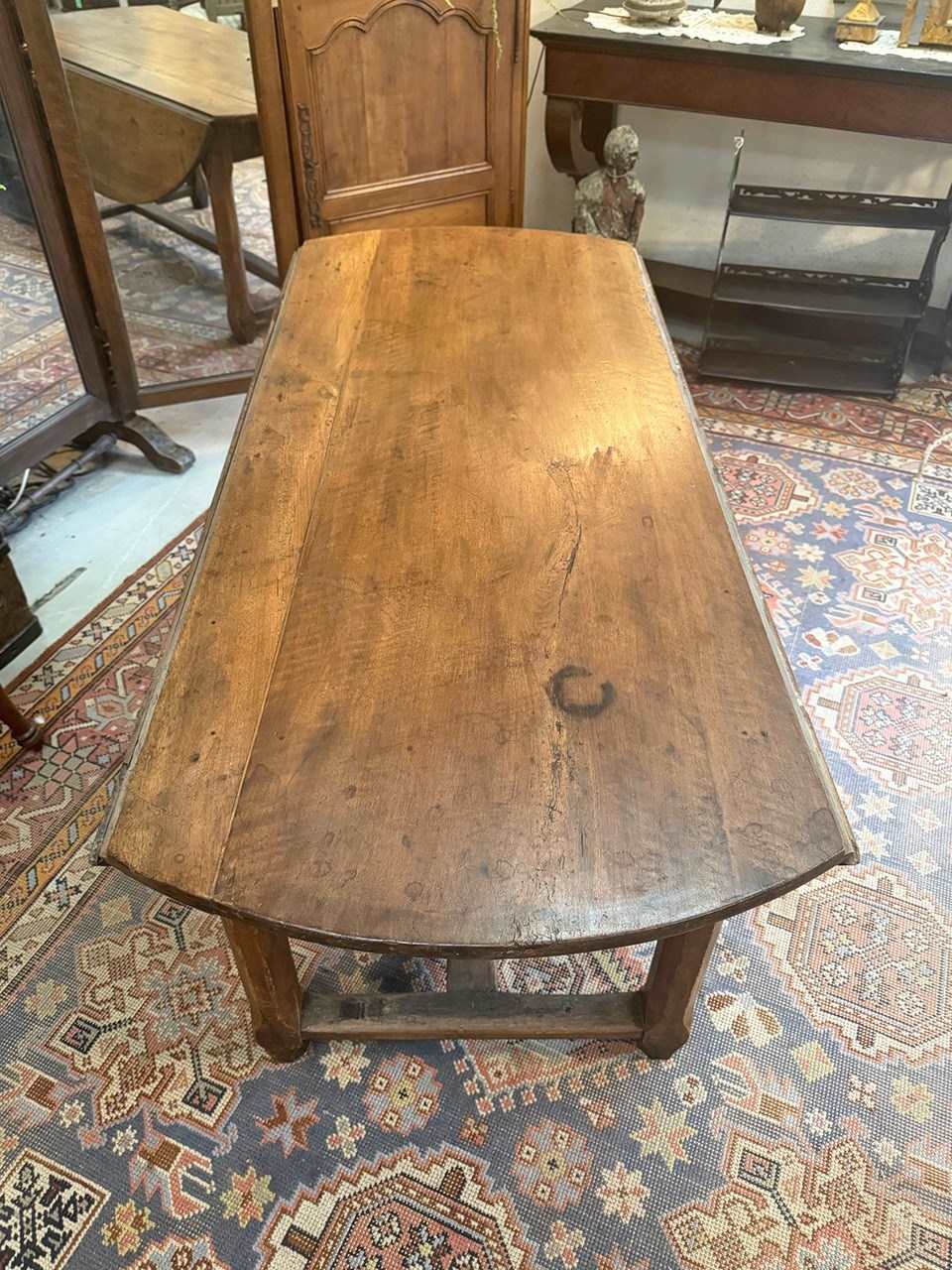 Oval top farmhouse table on thick set square legs with chamfered edges.