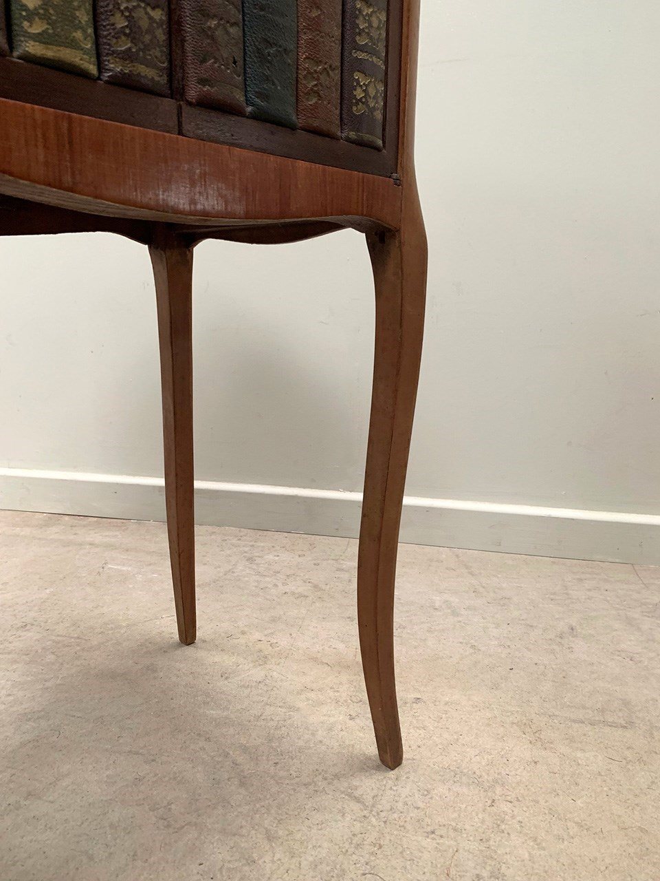 This is a 'trompe l'oeil'; the leather bound spines are adhered to the doors, which open and close with a little leather pull tab.