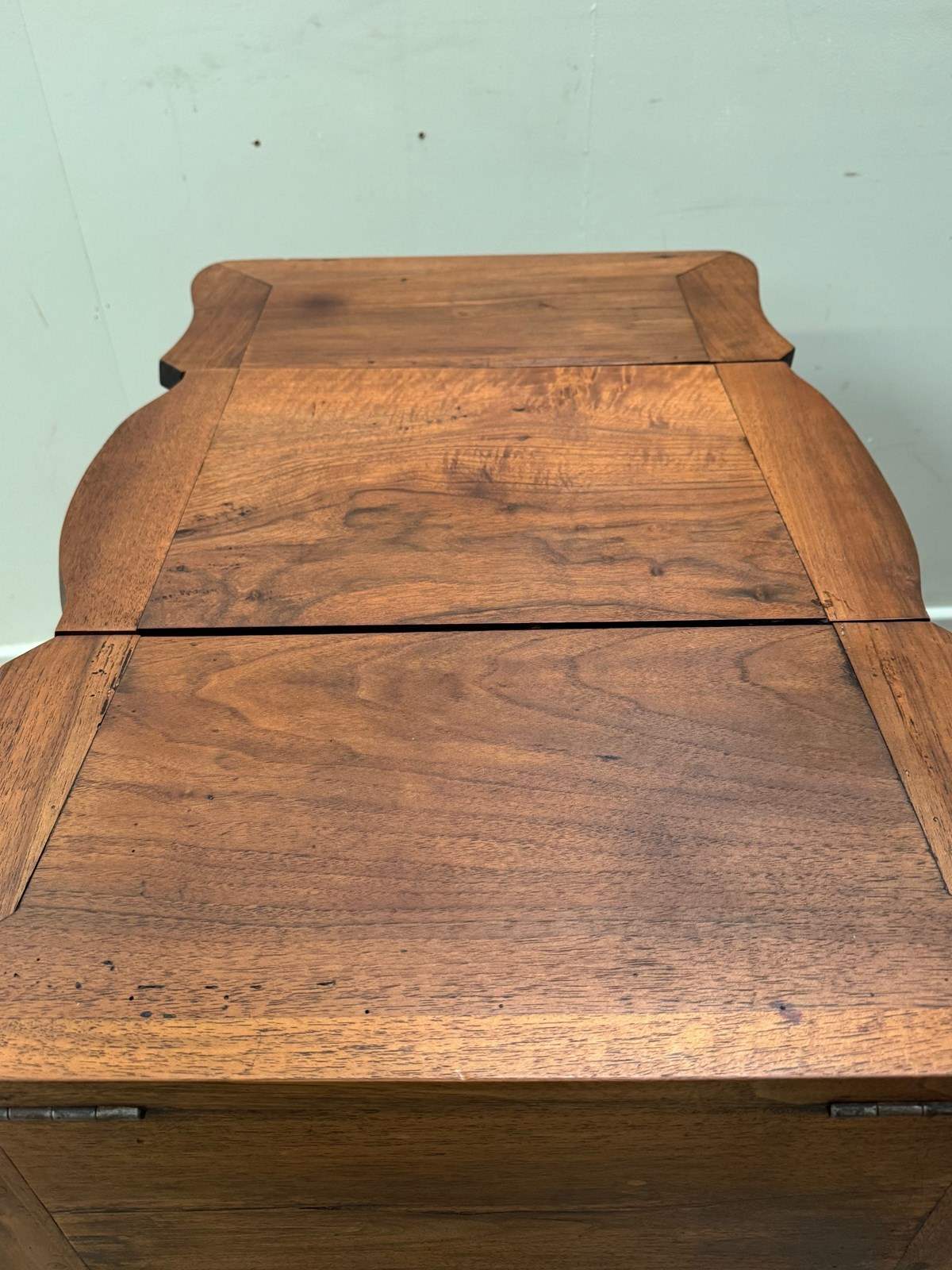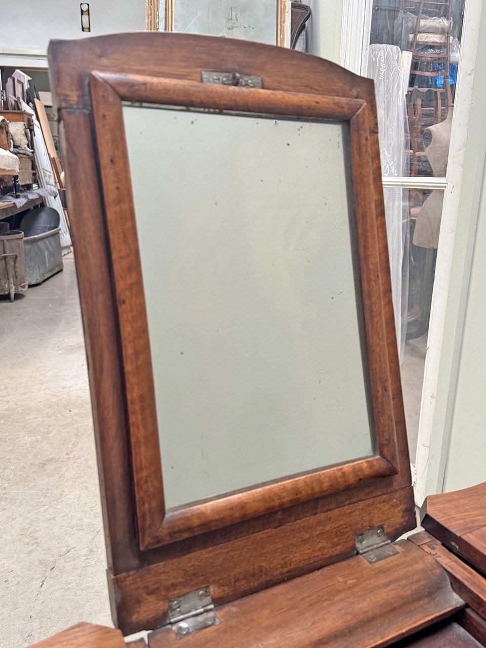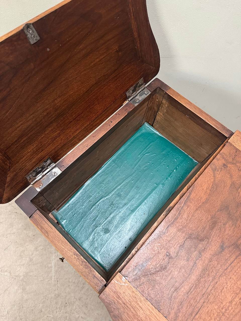 The central panel at the top lifts up to reveal a mirror (which has some spot foxing) and the left and right sections lift outwards and have green lined storage areas.