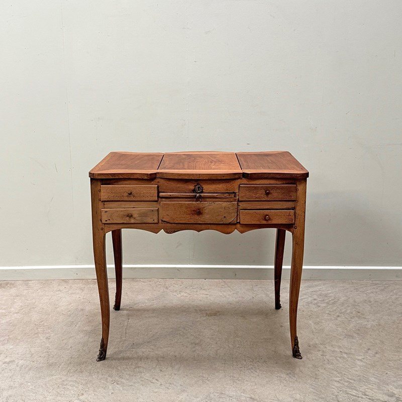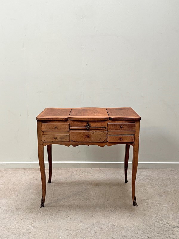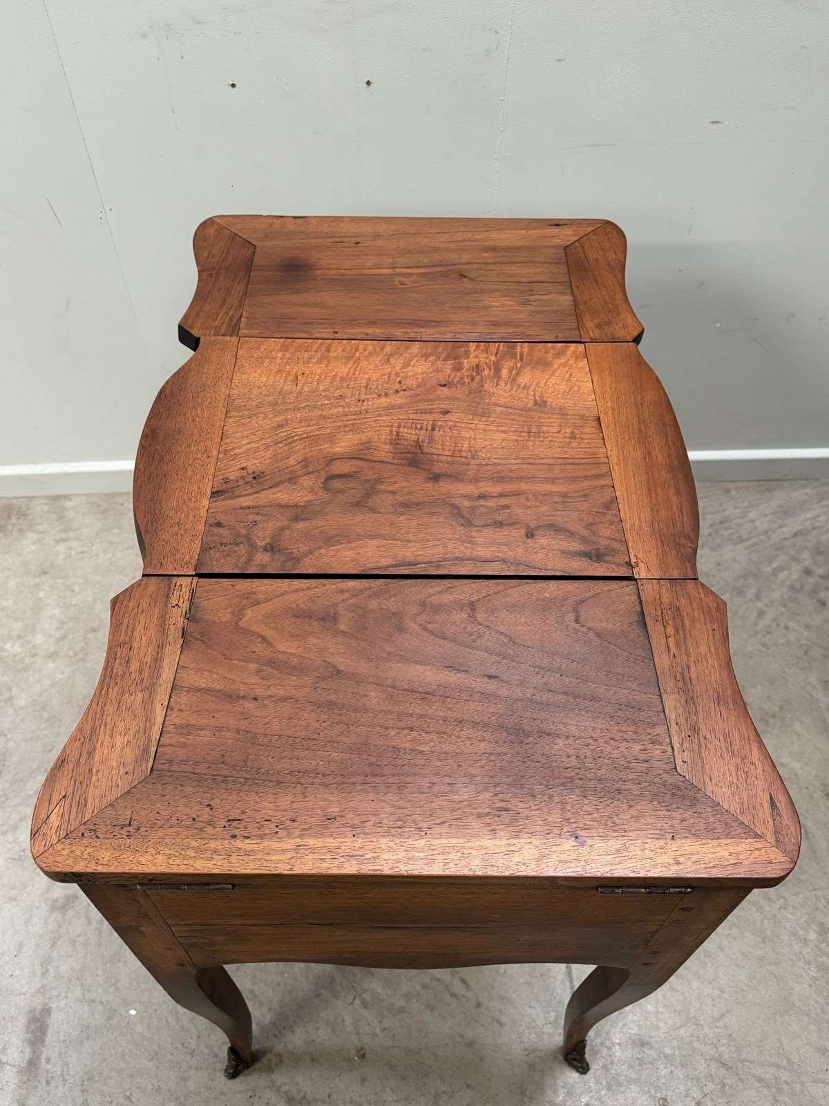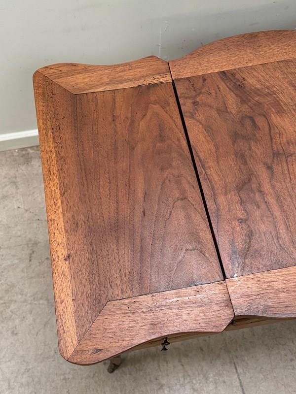 The central panel at the top lifts up to reveal a mirror (which has some spot foxing) and the left and right sections lift outwards and have green lined storage areas.