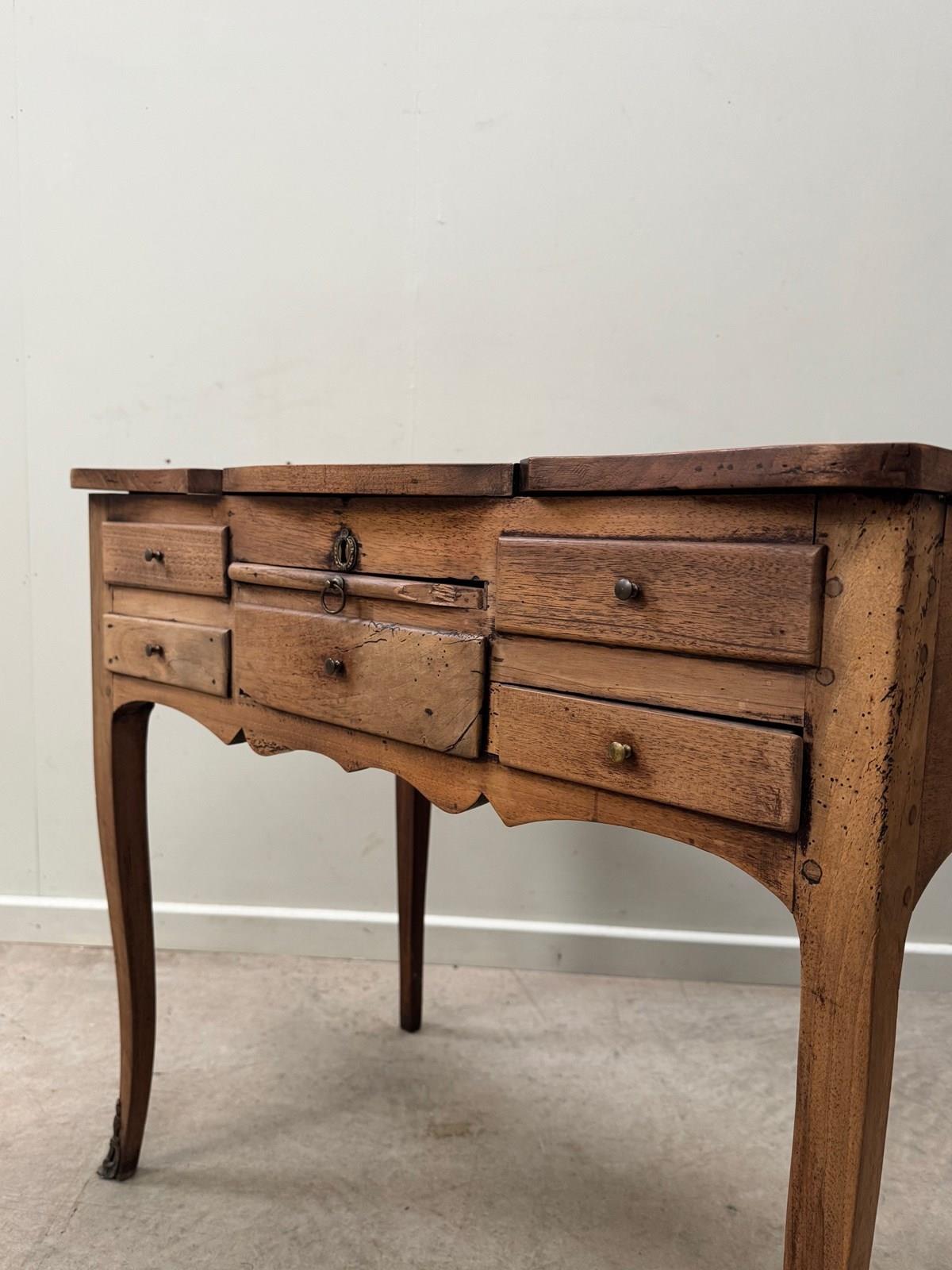 Under the top, the two drawers on the left have faux fronts, in the middle is a pull out tray over a little drawer, and there is a further drawer on the lower right; the top right drawer has a faux front.