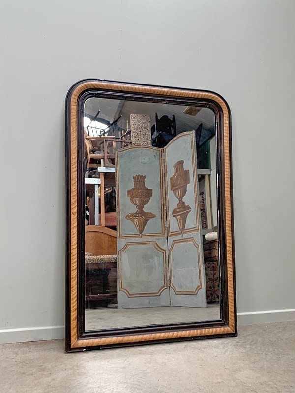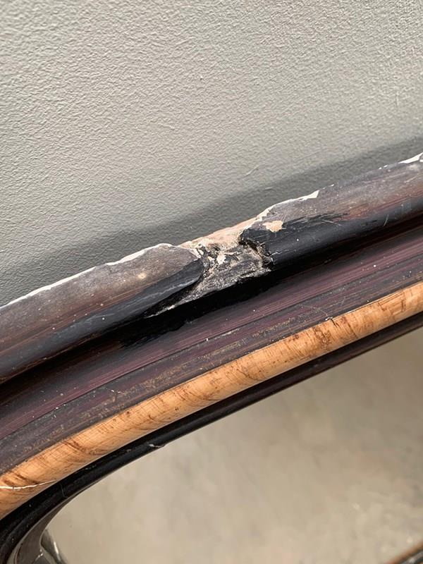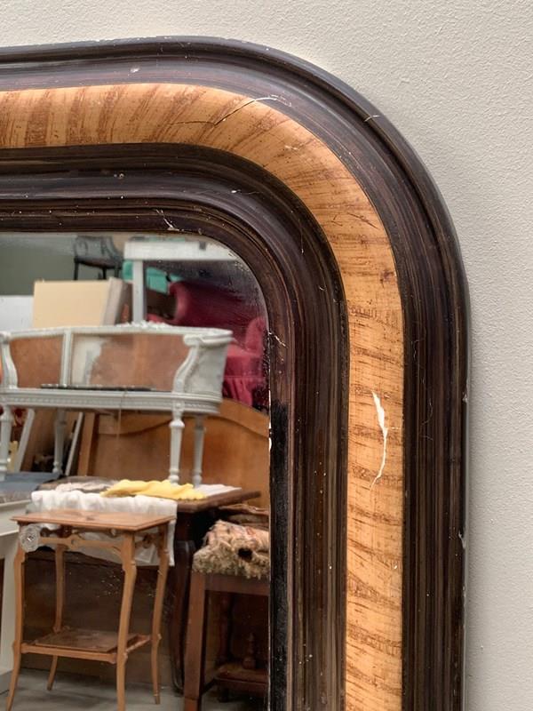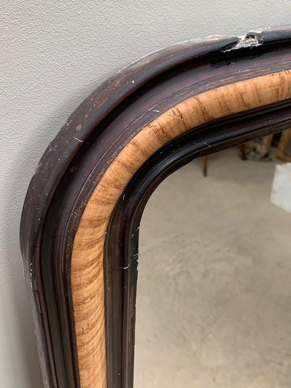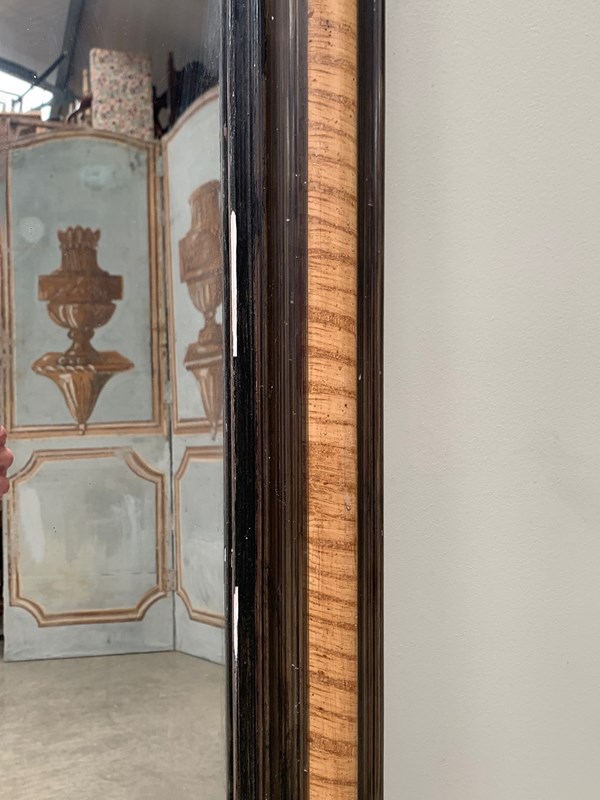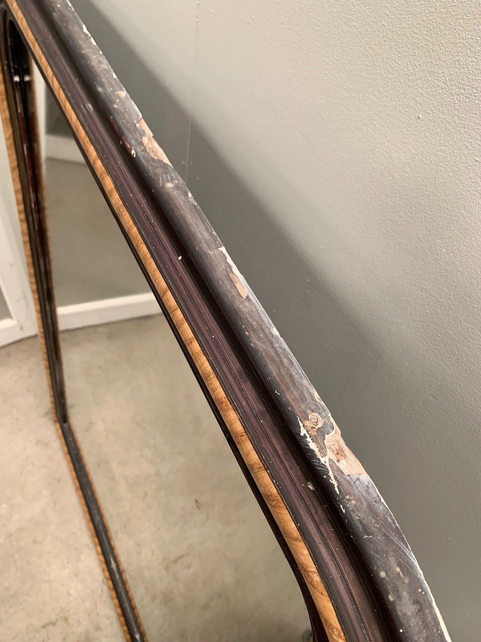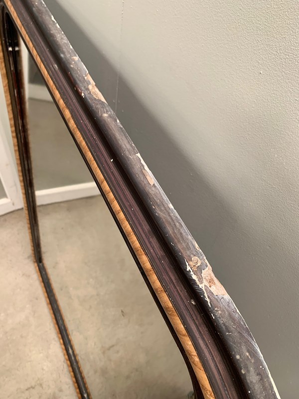 A large mid 1800s ebonised mirror with a striped amber-coloured design around the frame. The glass is in good condition.