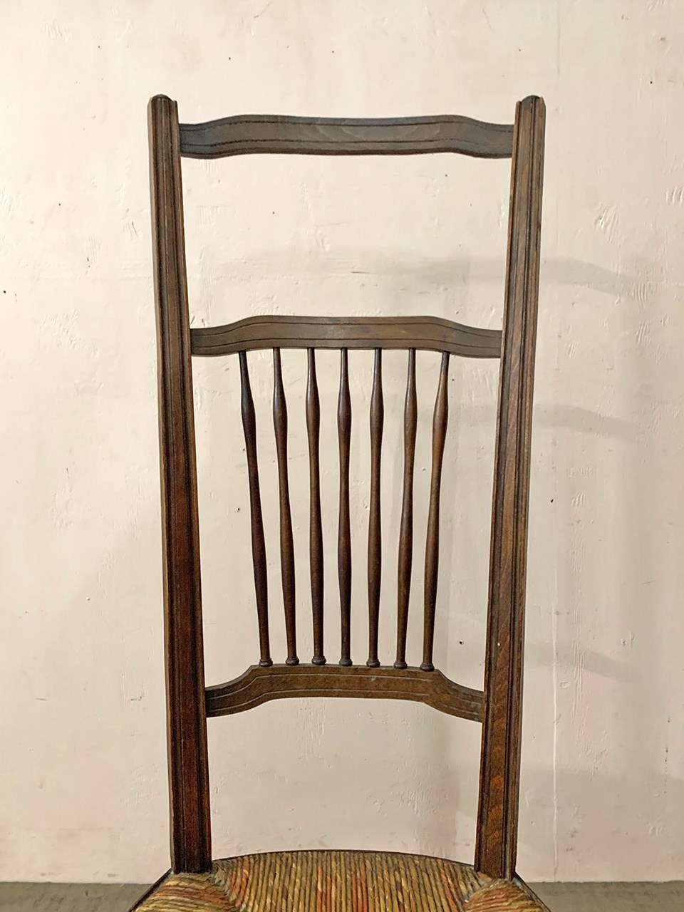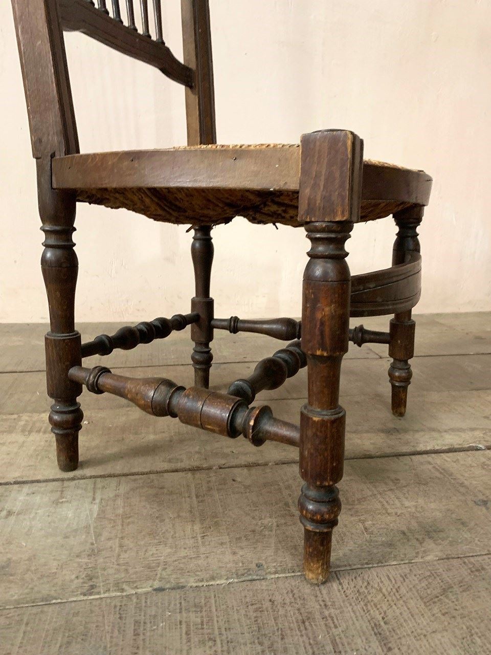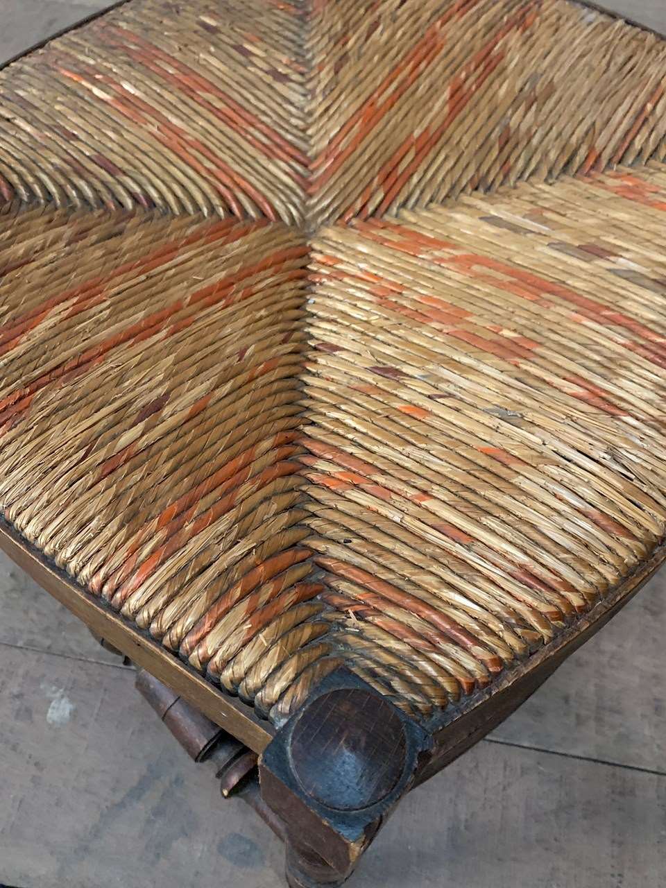 The patterned rush seat is in good condition and is intact.