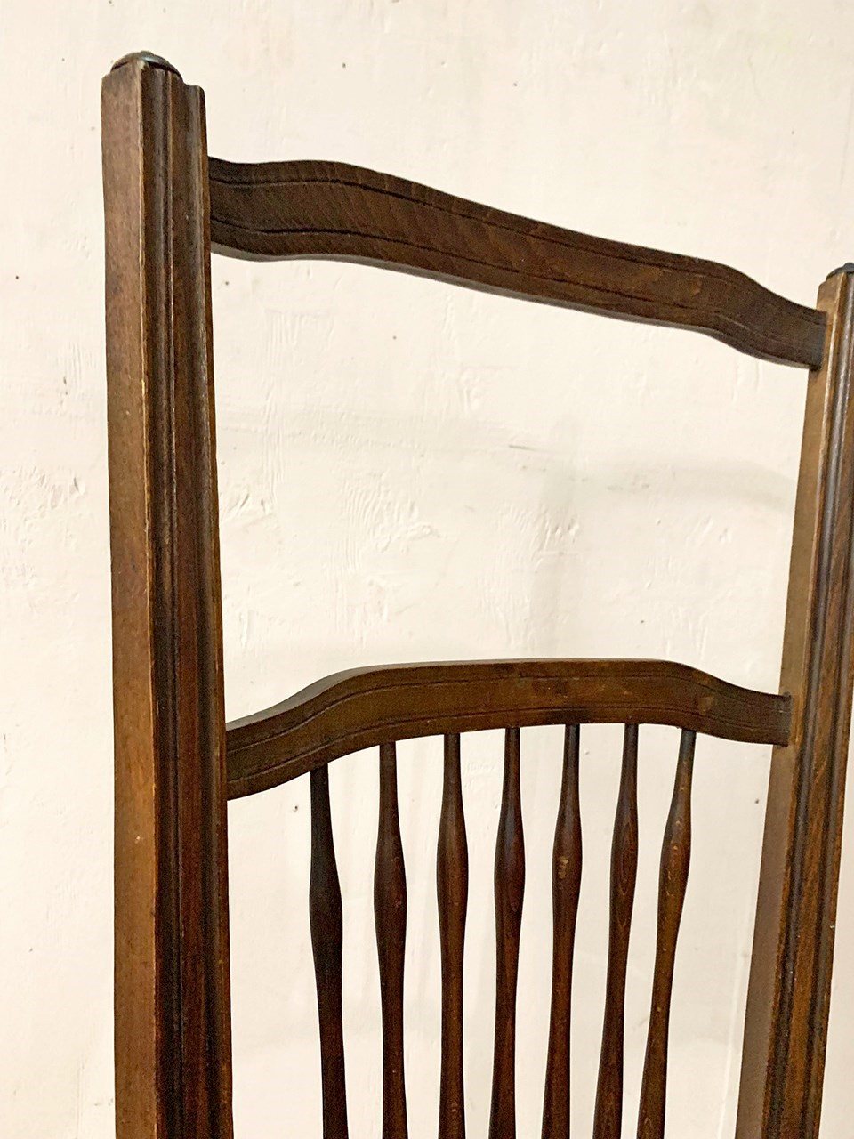 There are 6 turned spindles on the back rest, and a carved front frieze.