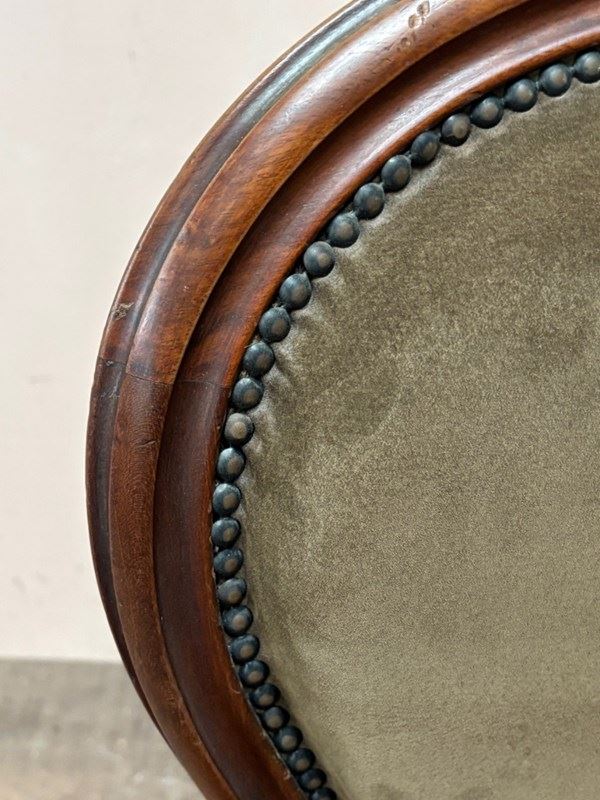 1840’s solid mahogany open armchair in excellent condition, and later upholstered in a very clean olive green faux suede material.