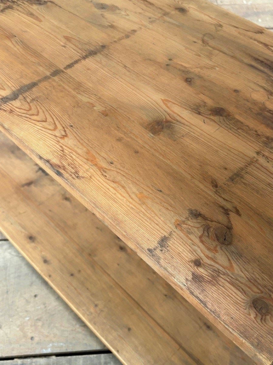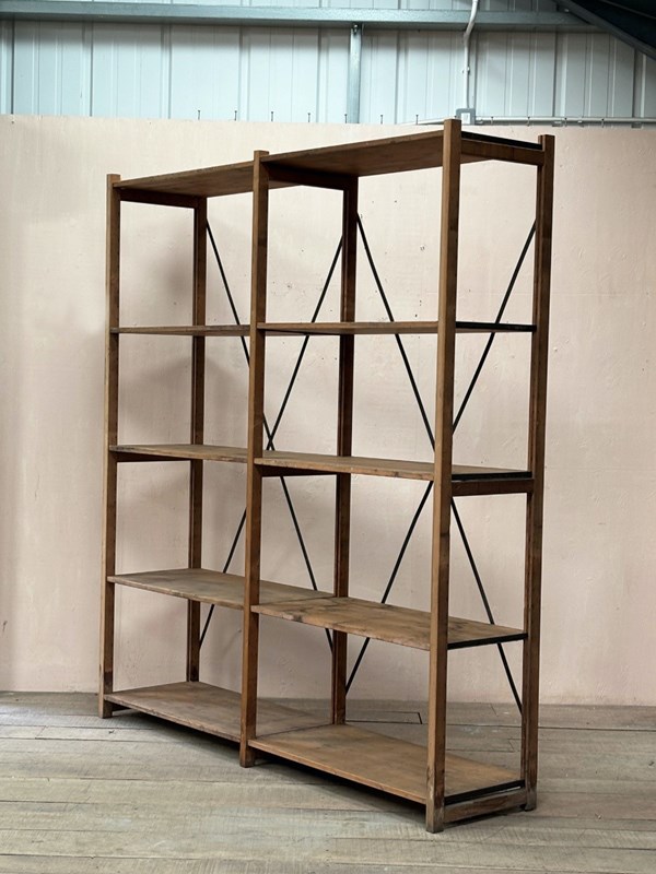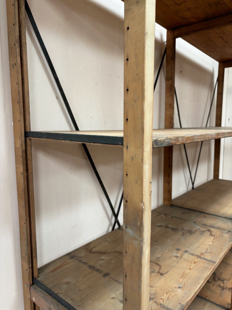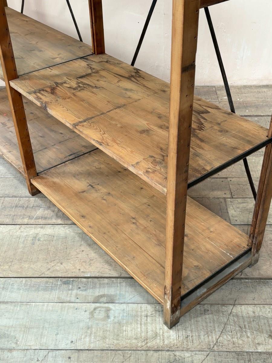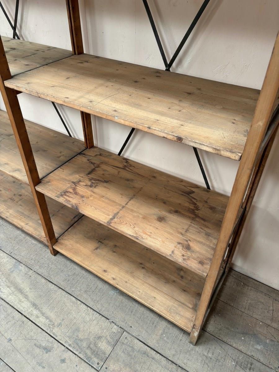 Early 20th century pine racking, one of several available, up to 3m high, from a Manchester textile merchant. Shelf positions are adjustable.