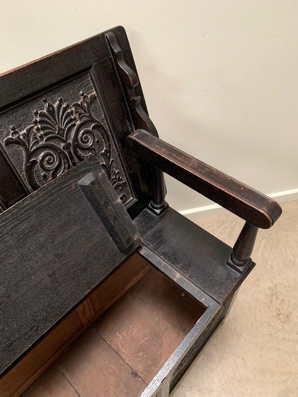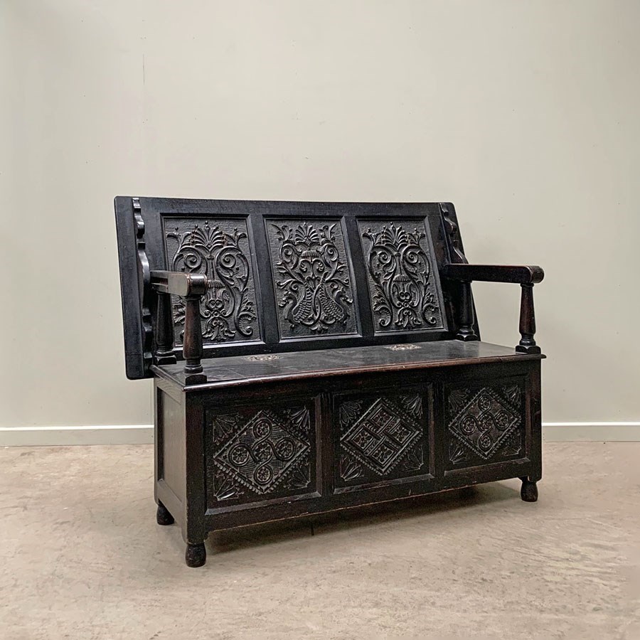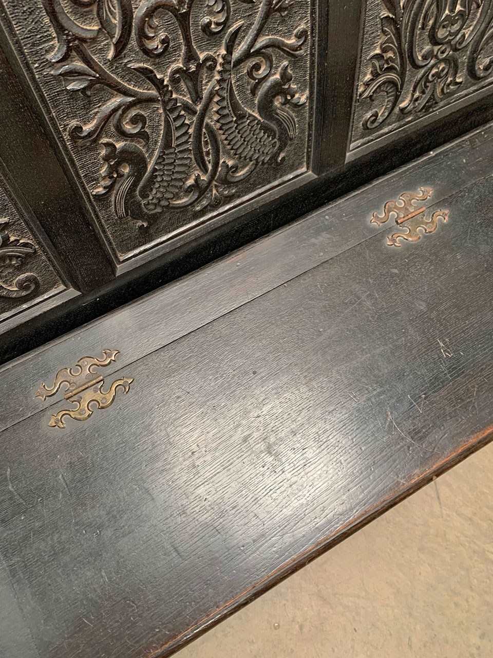 An ebonised 19th century storage bench with heavily carved panelling.