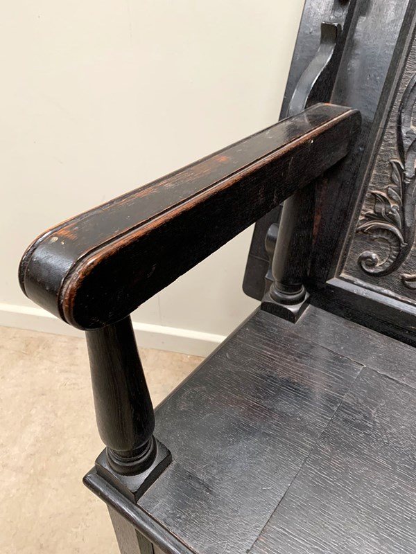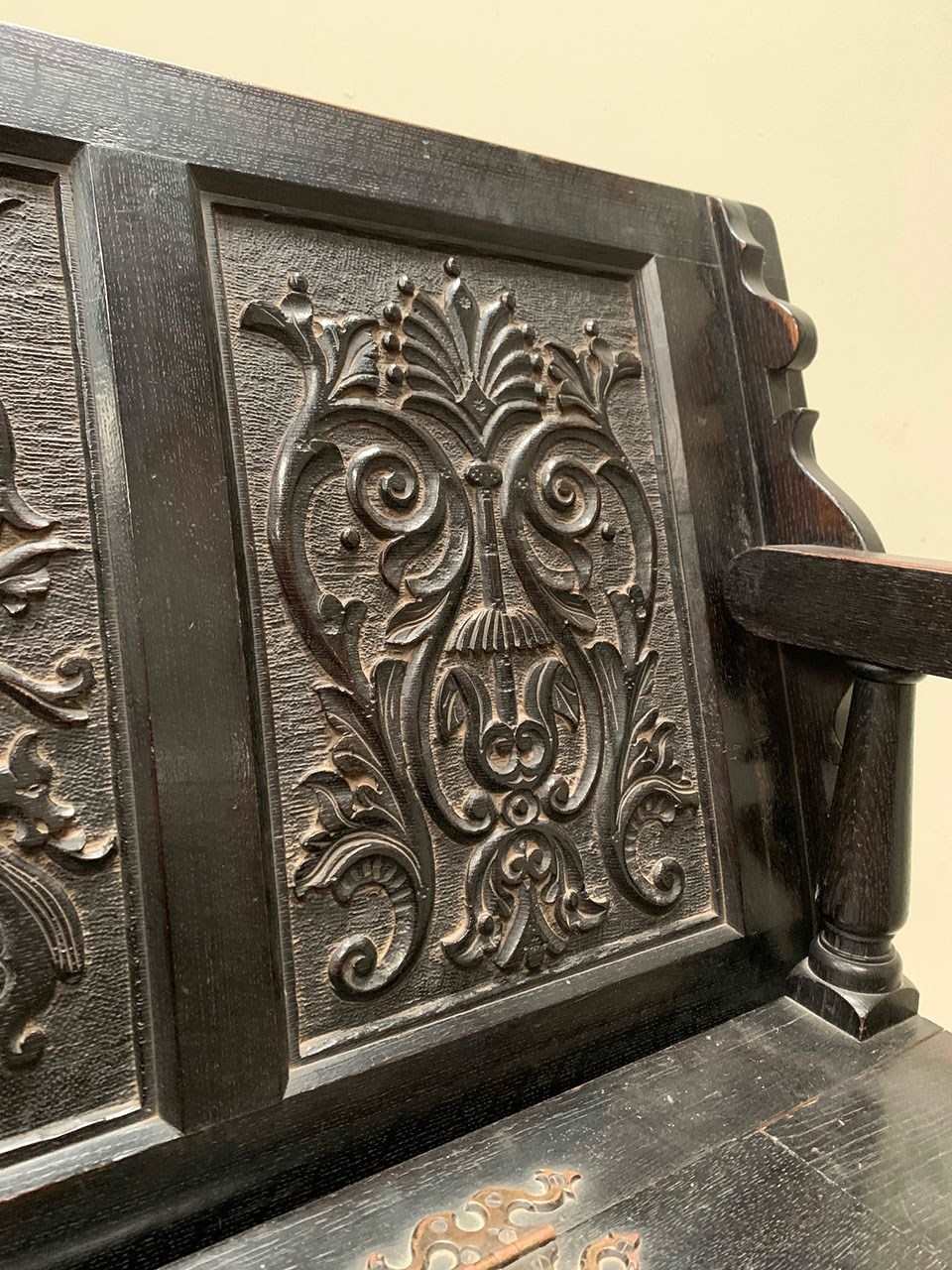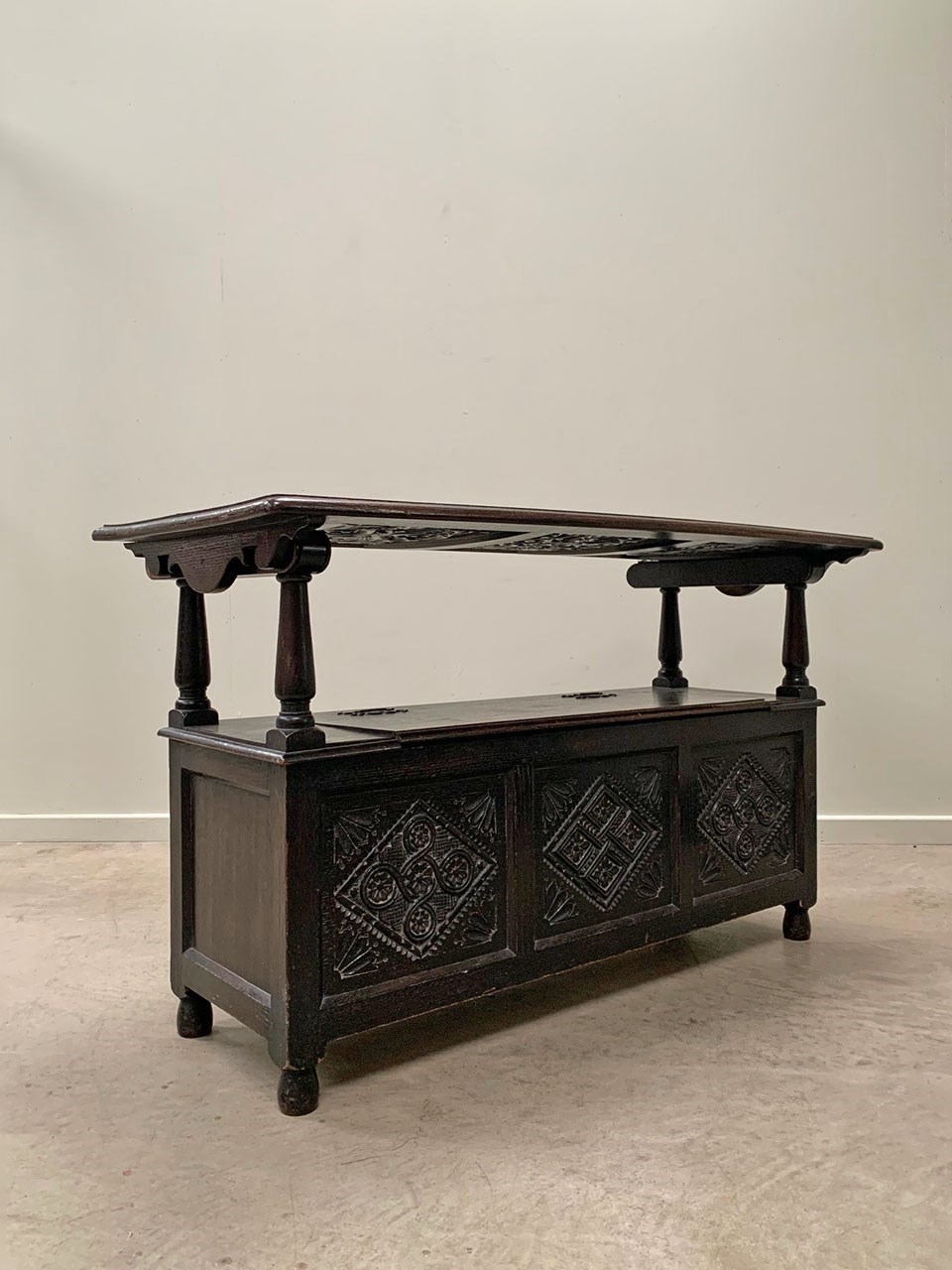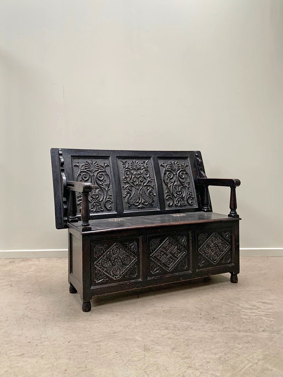 An ebonised 19th century storage bench with heavily carved panelling.