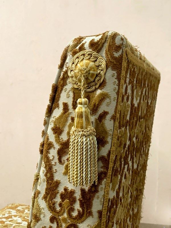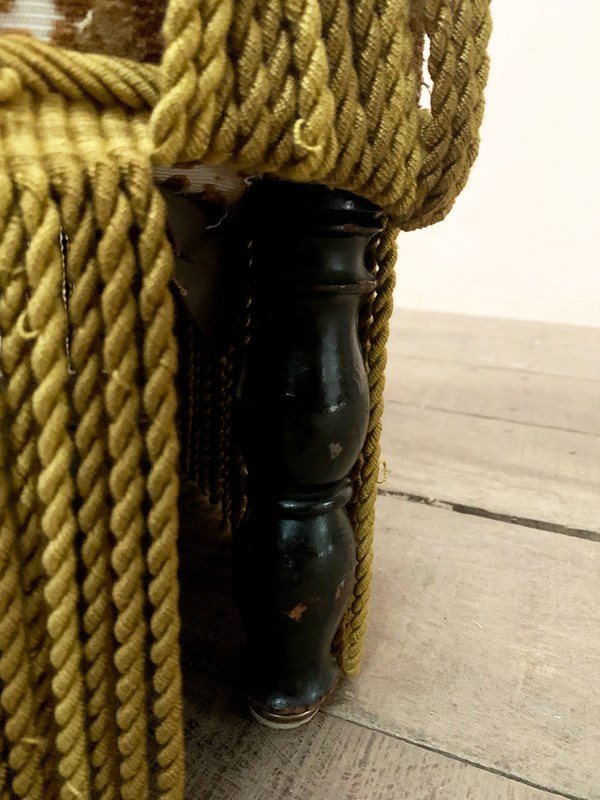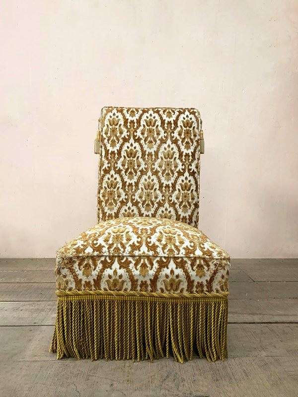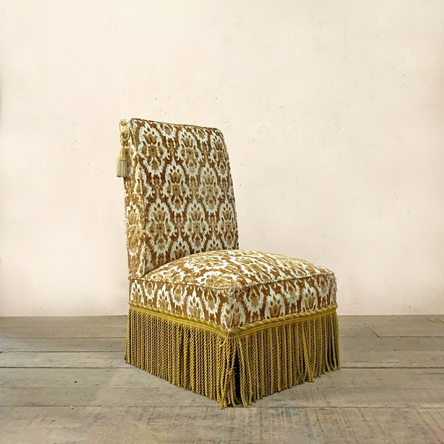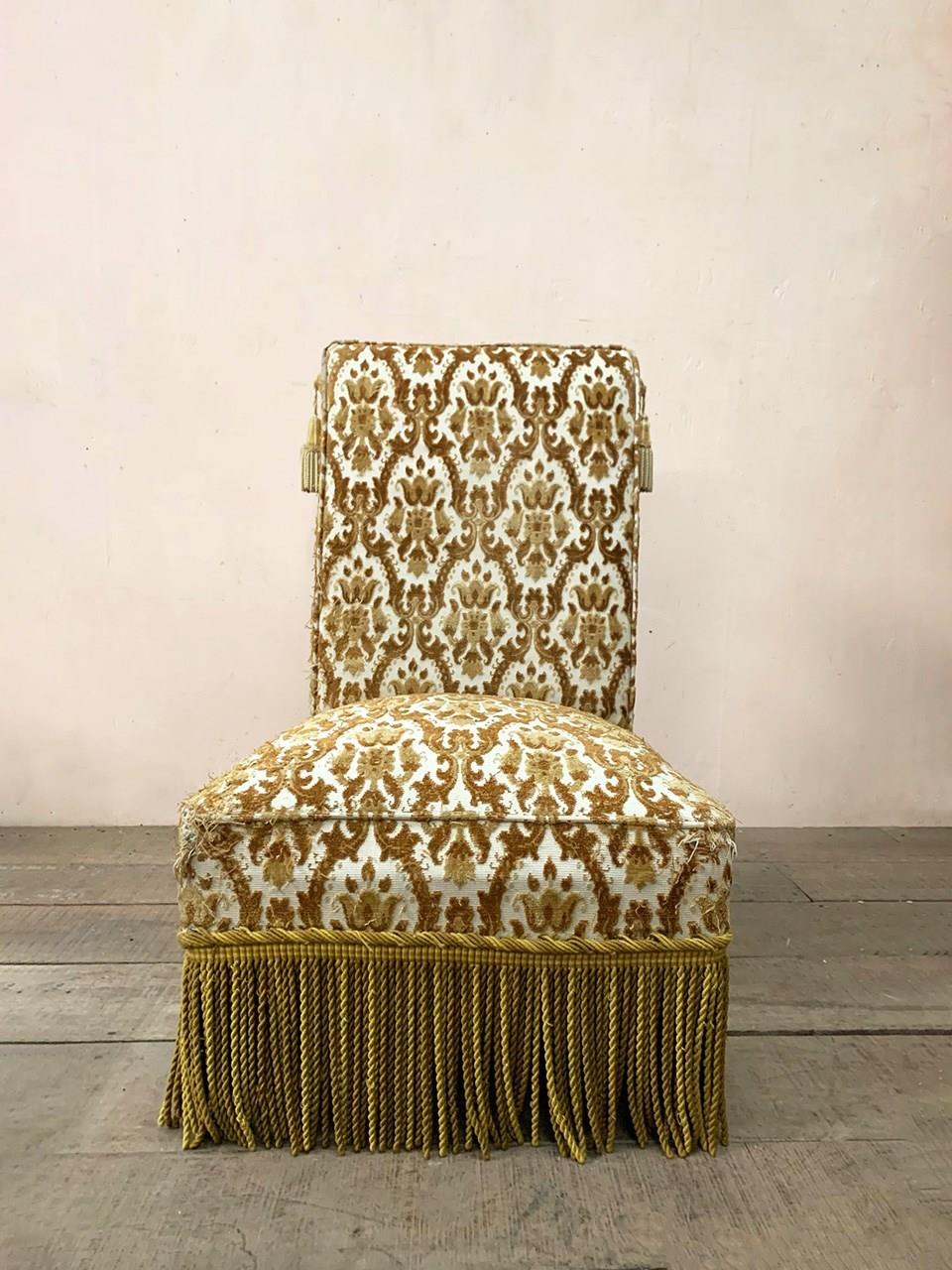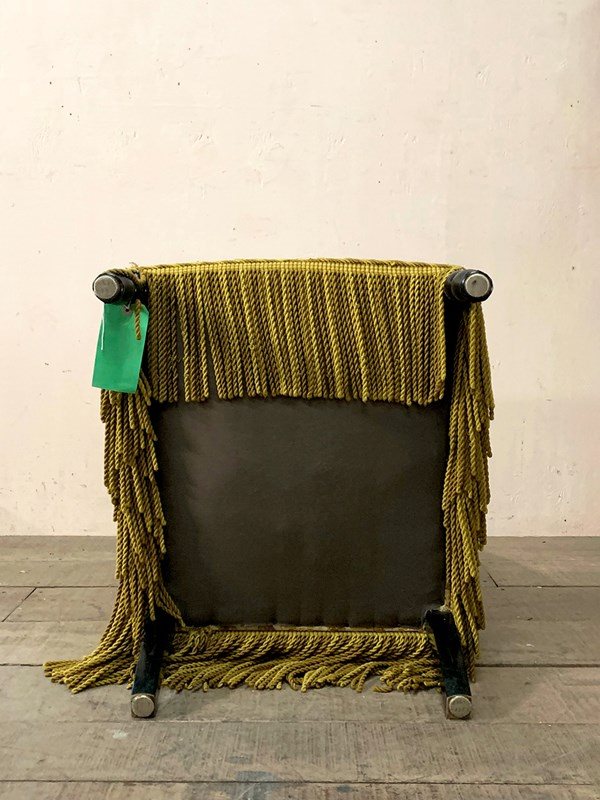 The upholstery has been 'cat scratched' in a couple of places, and the chair retains its long fringing and tassels at the sides of the top.