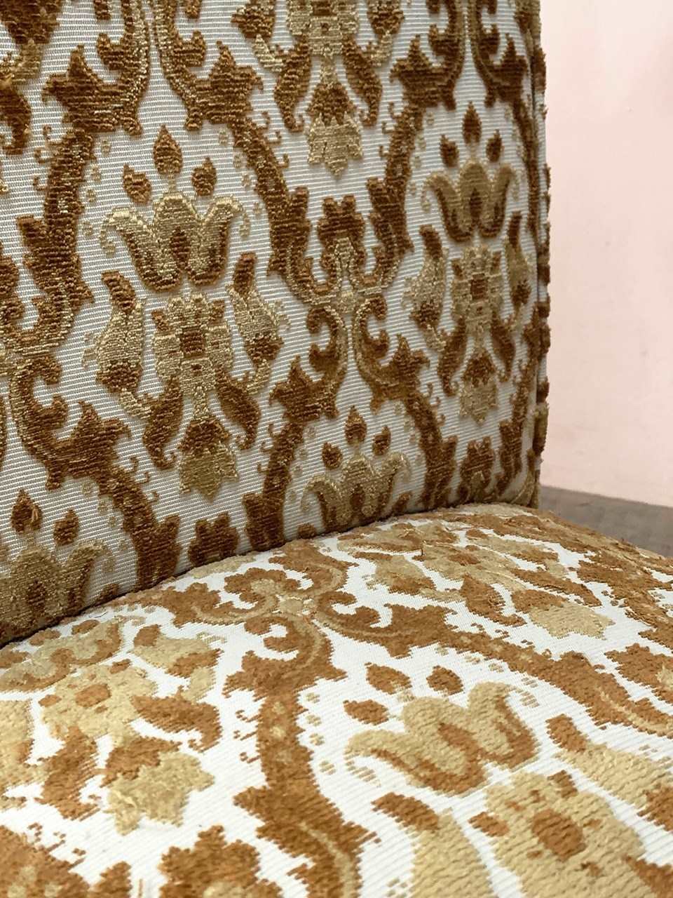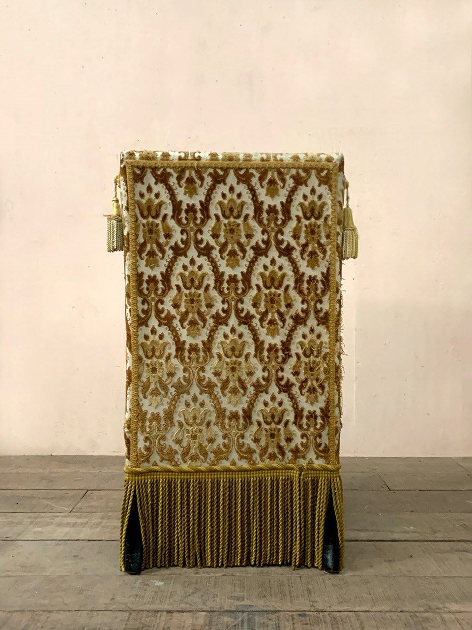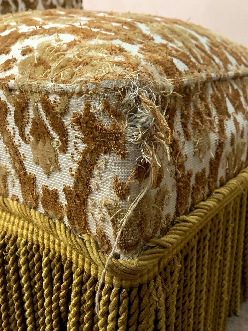 The upholstery has been 'cat scratched' in a couple of places, and the chair retains its long fringing and tassels at the sides of the top.