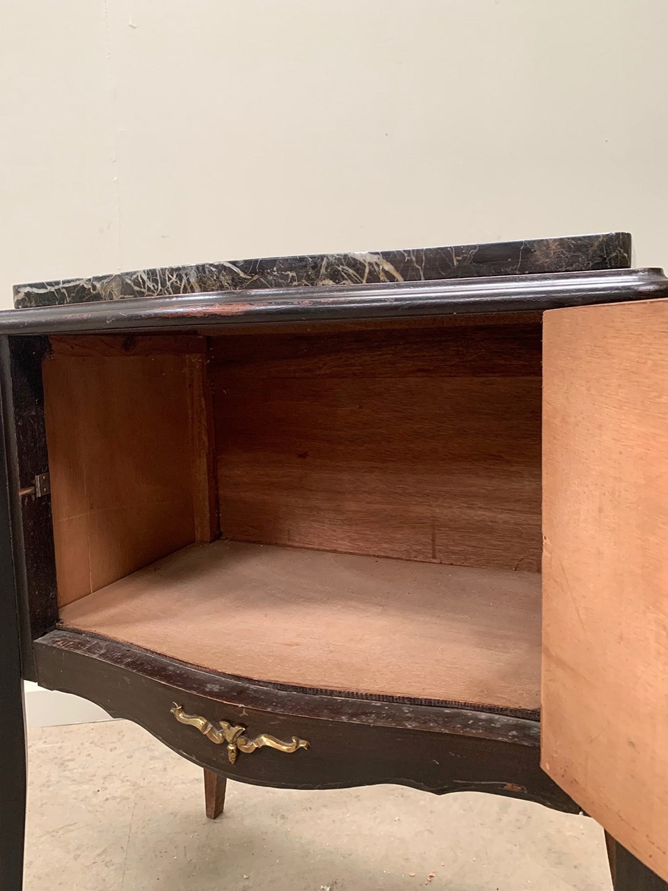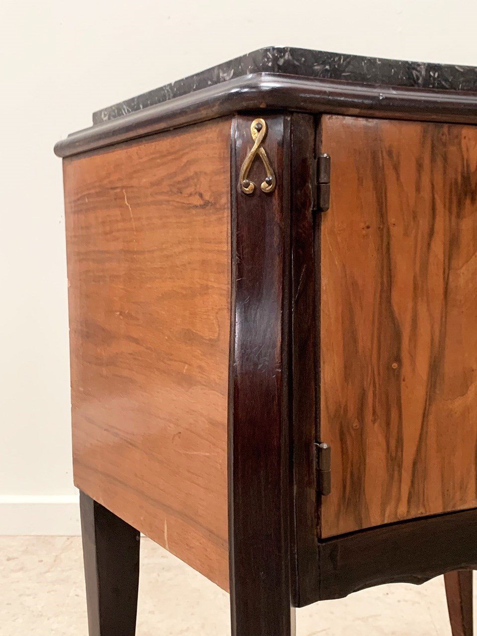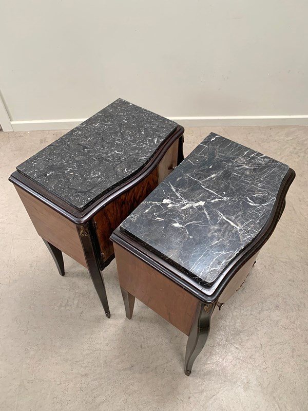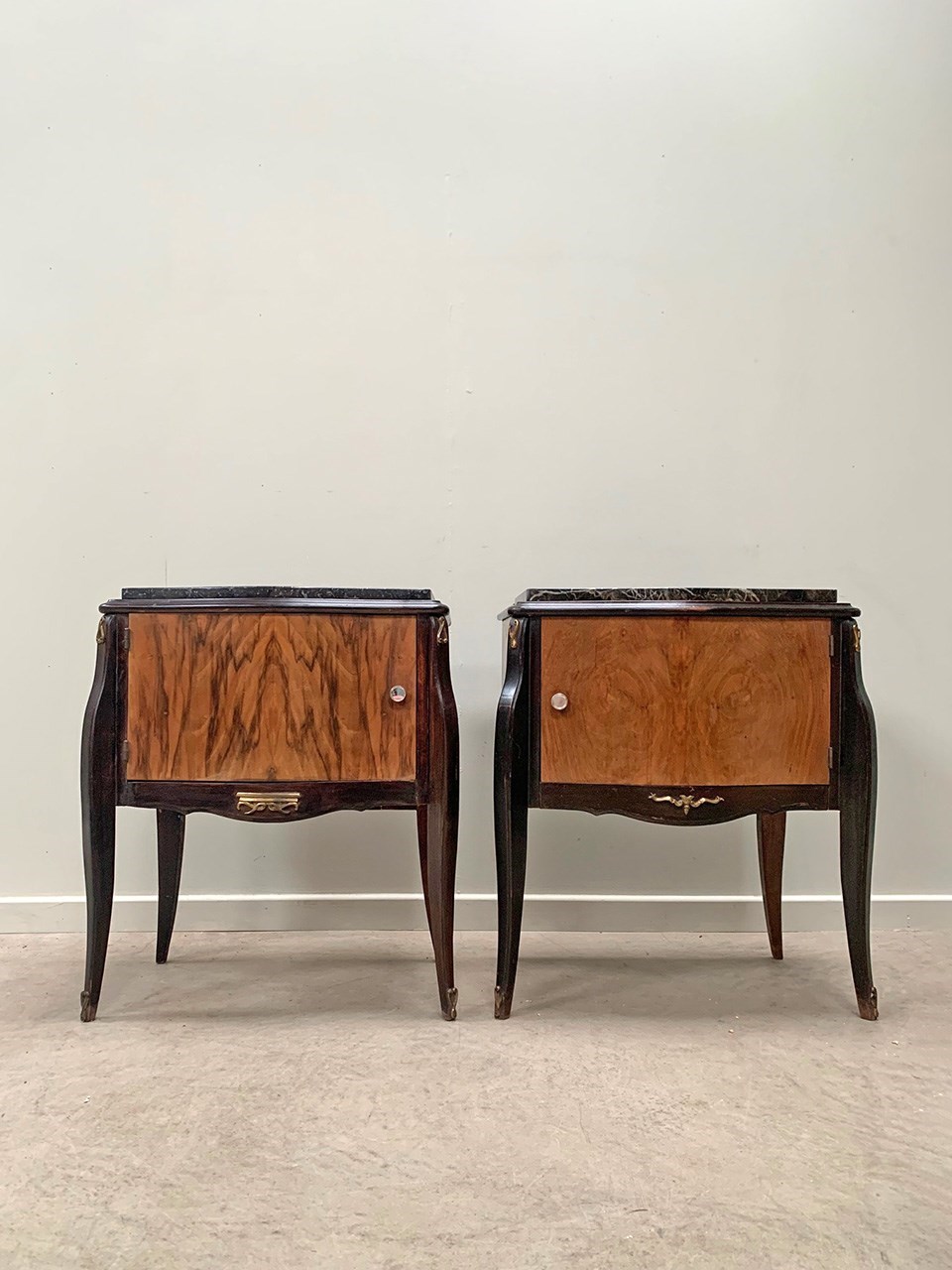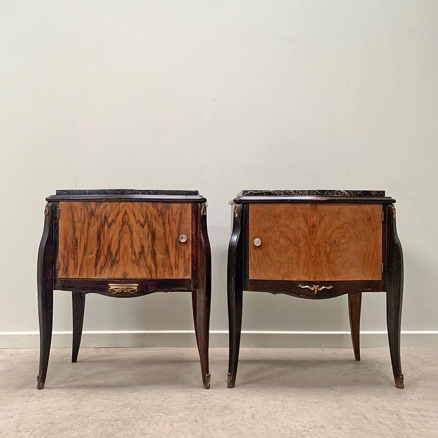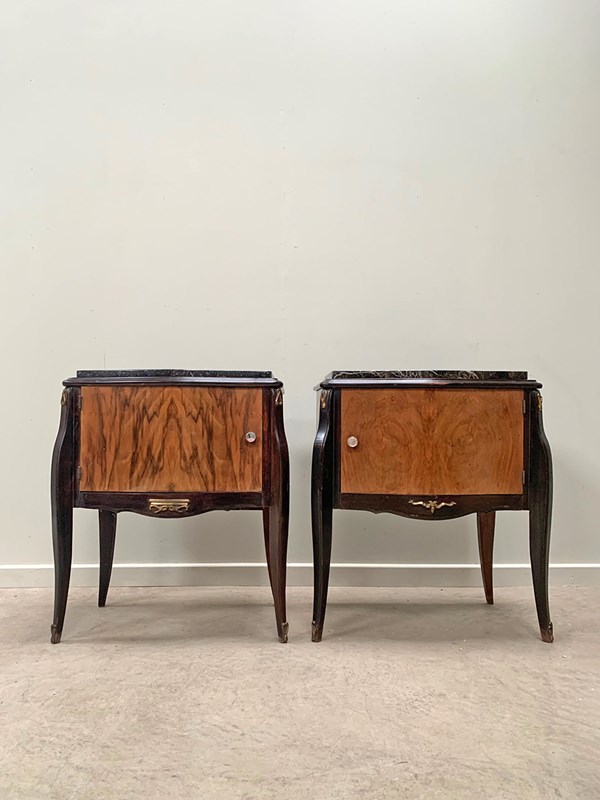 Both have walnut veneered fronts and have ebonised beech frames. With single doors furnished with little chrome knobs.