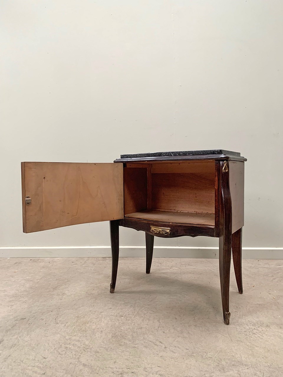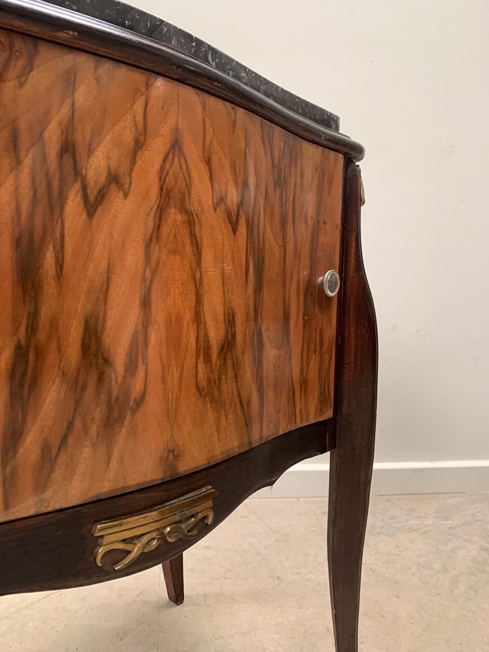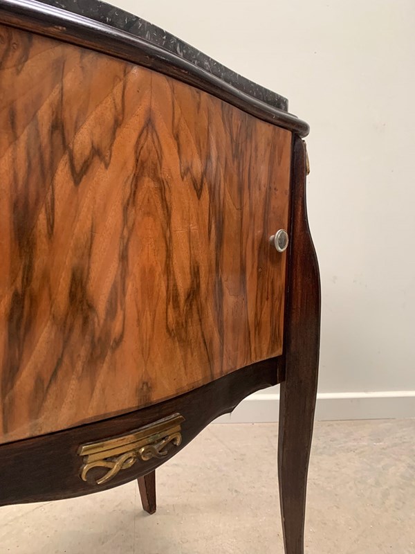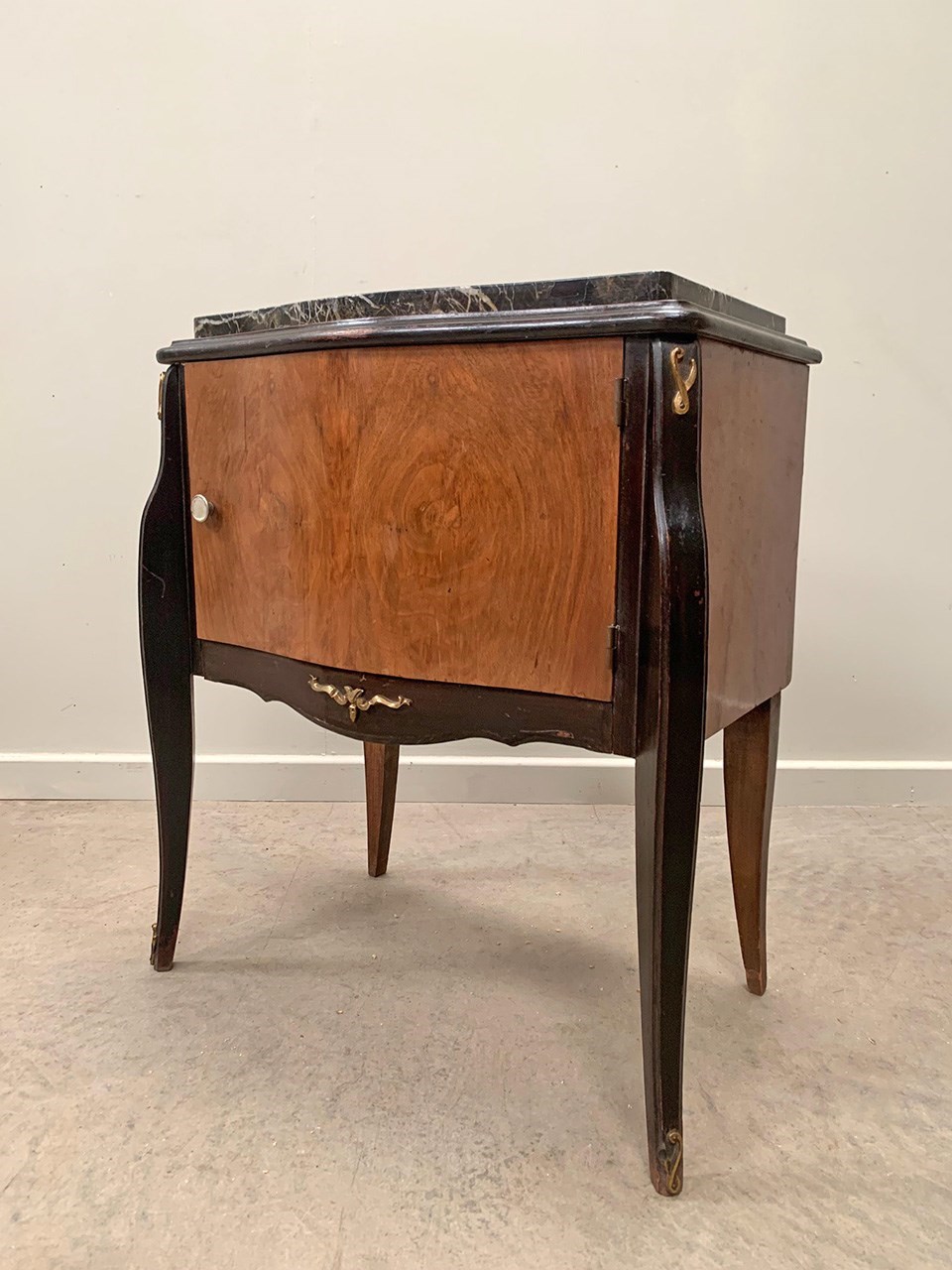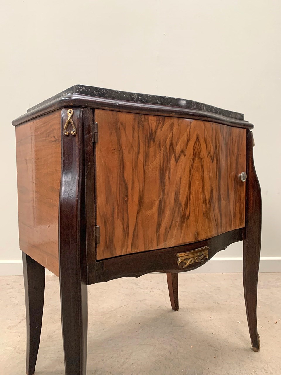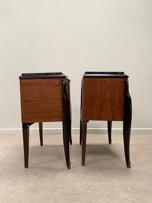 Both have walnut veneered fronts and have ebonised beech frames. With single doors furnished with little chrome knobs.