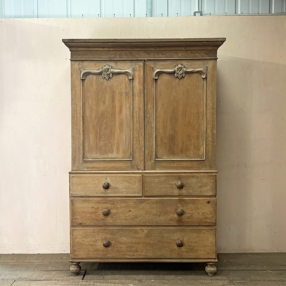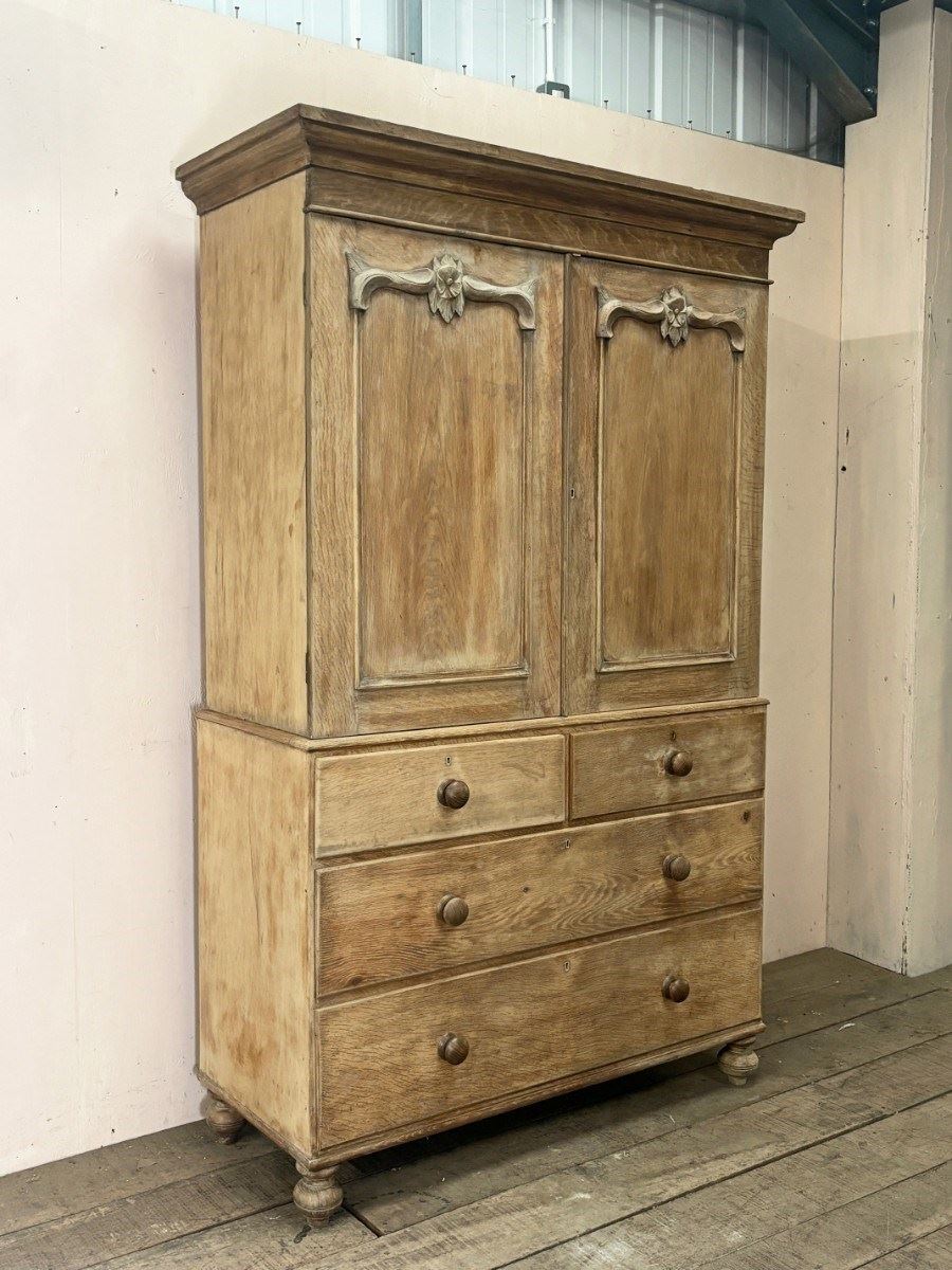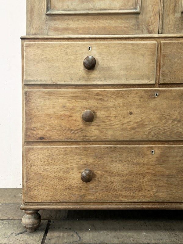 Pale, solid oak late Victorian Welsh housekeeps cupboard with 4 drawers below and 3 linen press sliding shelves behind doors.