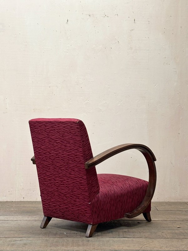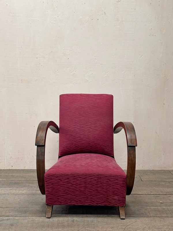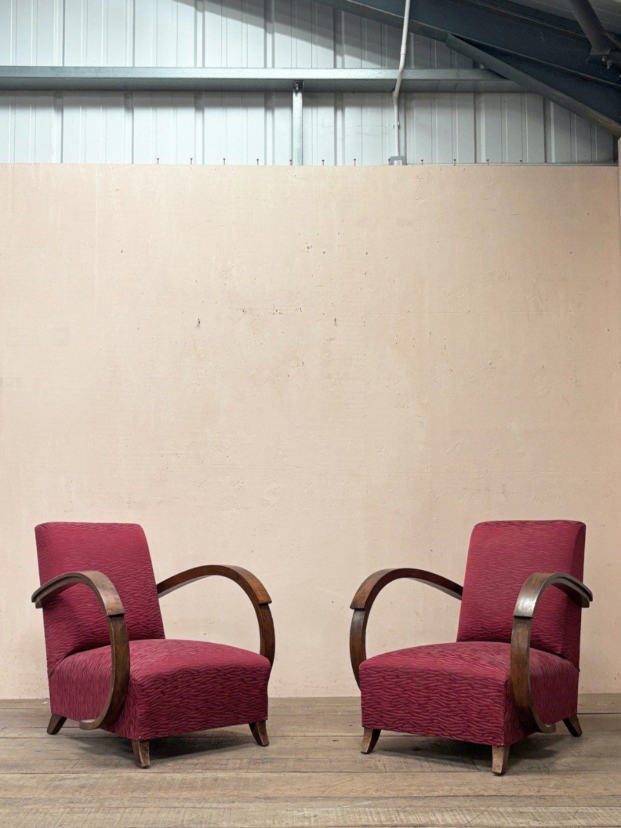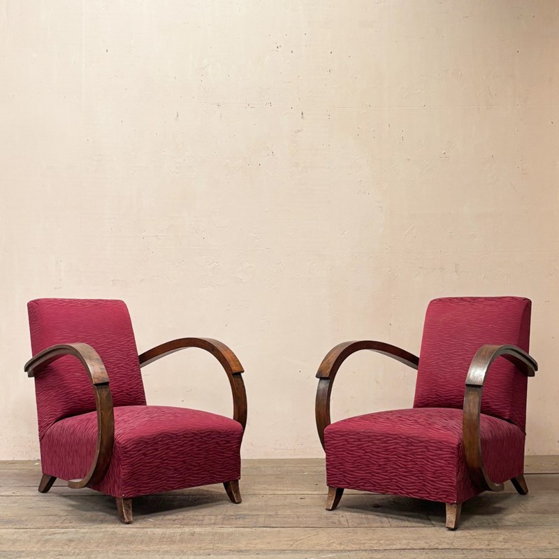 Pair of 1930’s armchairs with large hooped arms on tapered sabre feet, retaining recent upholstery which is clean and damage free.