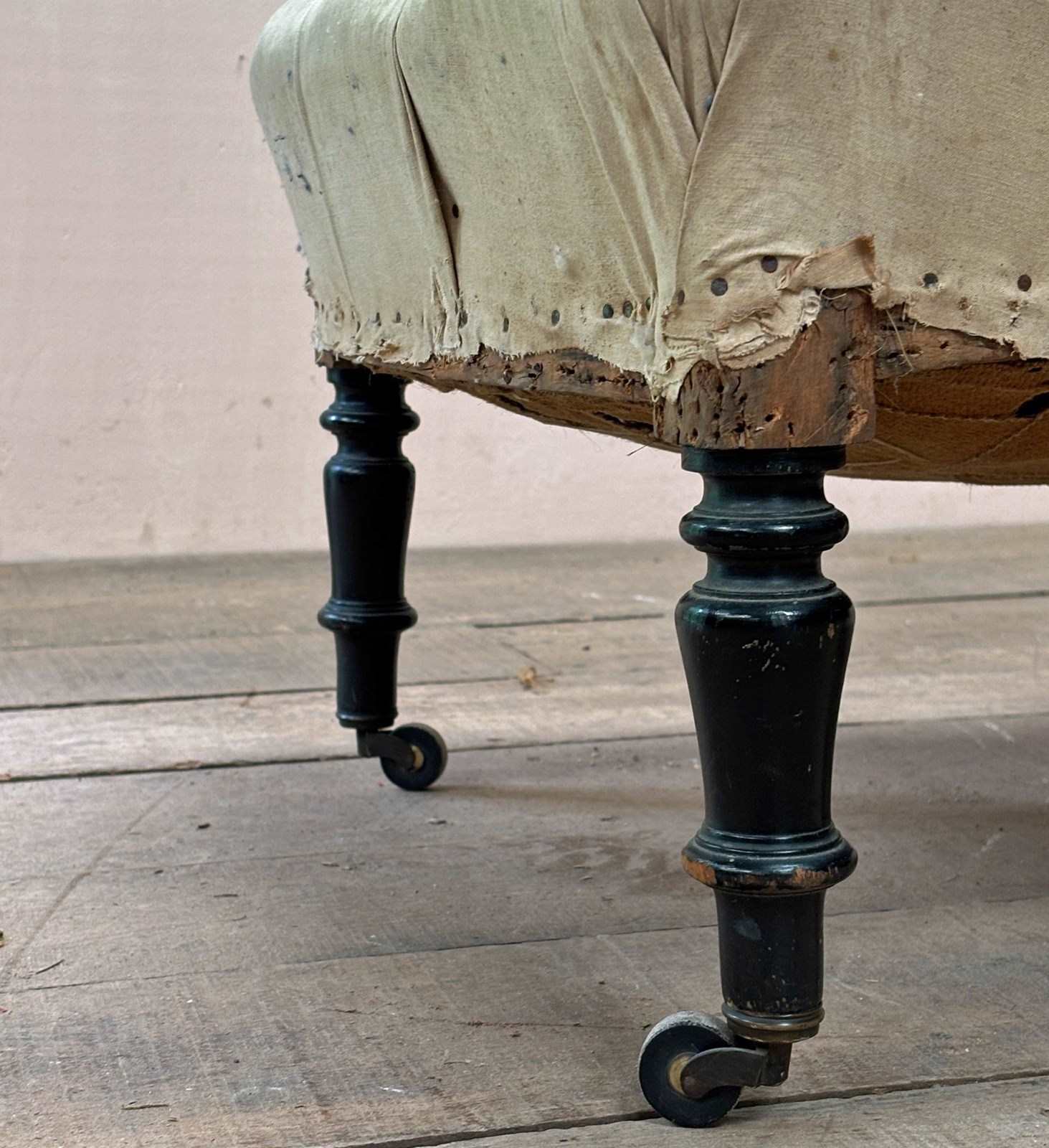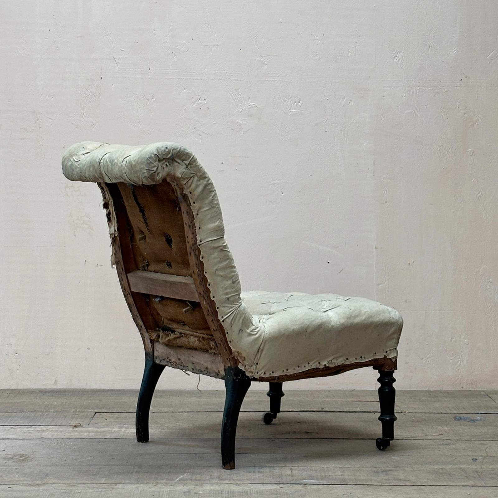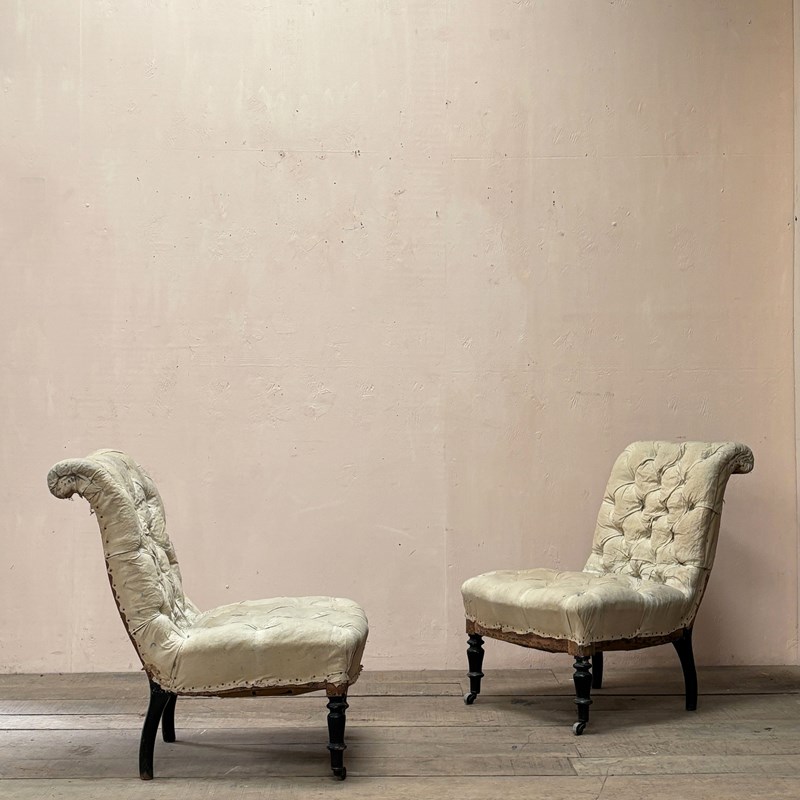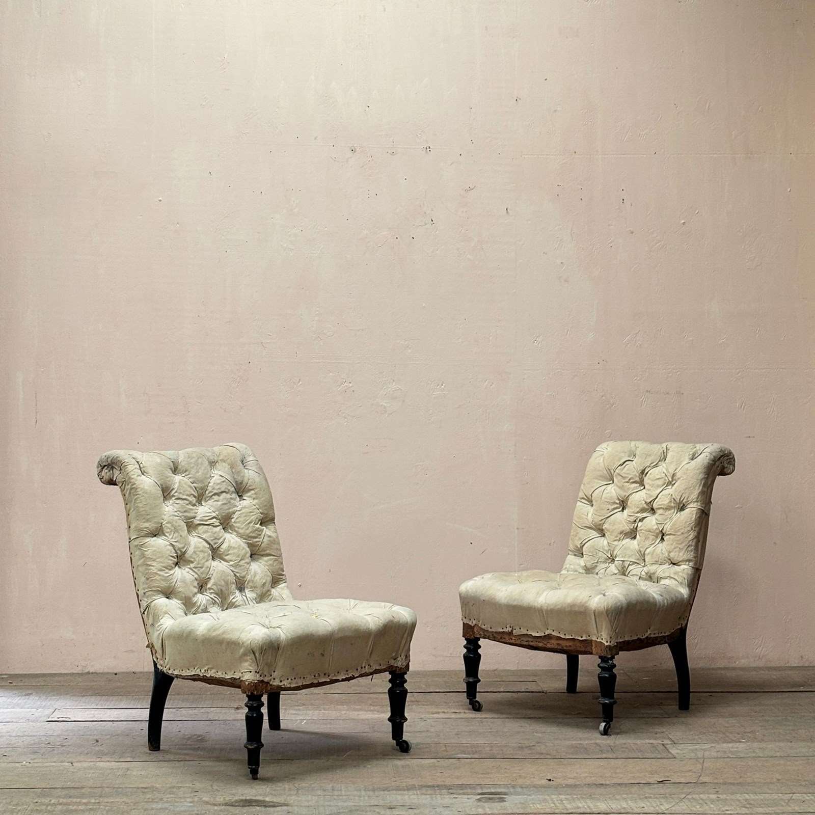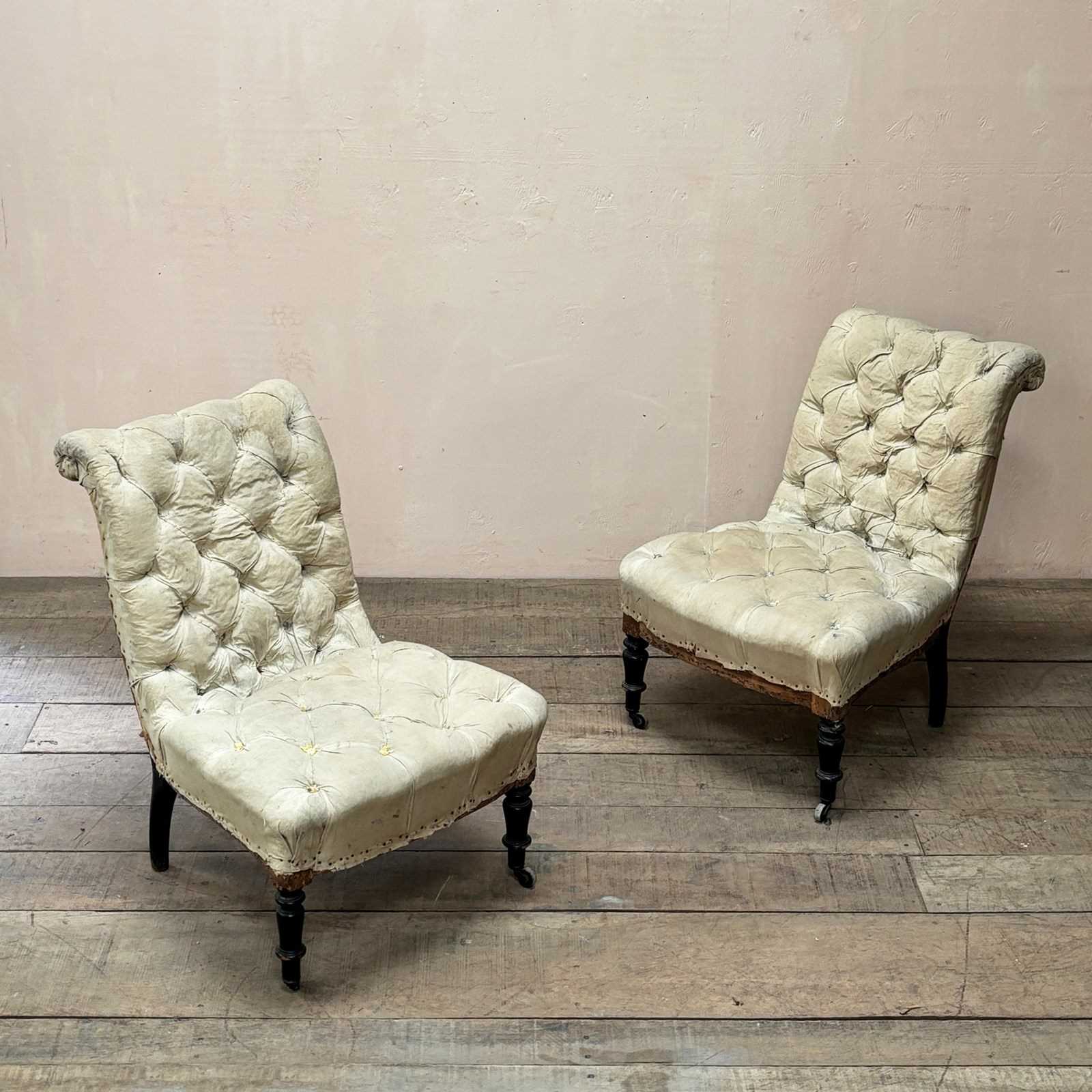 Pair of mid 19th century fully deep buttoned scroll back slipper chairs with strong frames on turned ebonised legs retaining original, undamaged, castors.