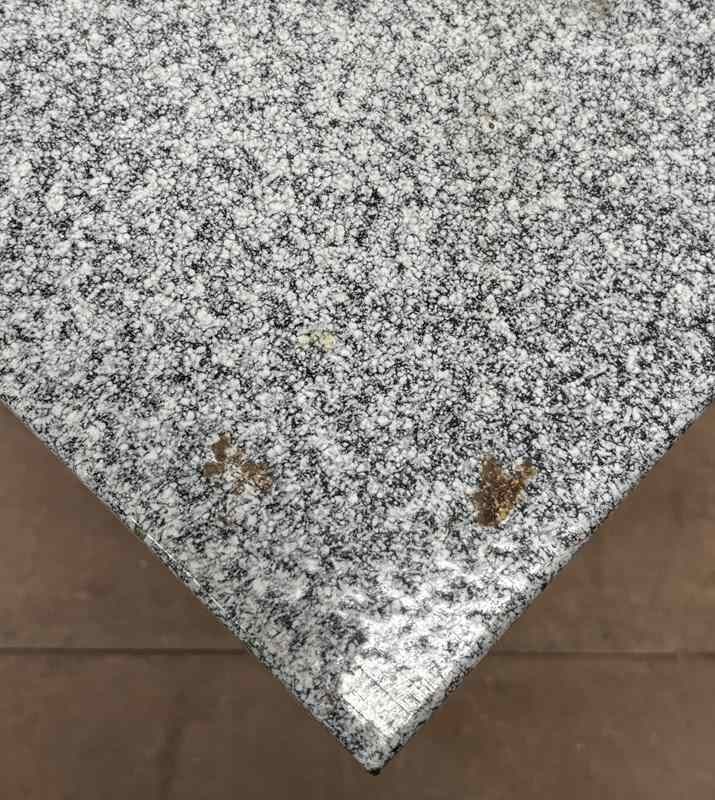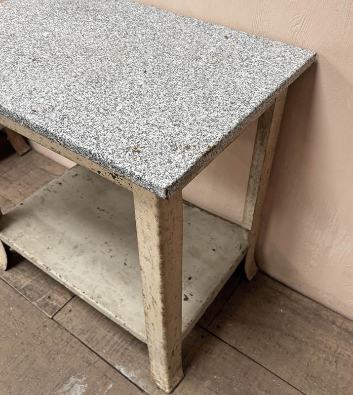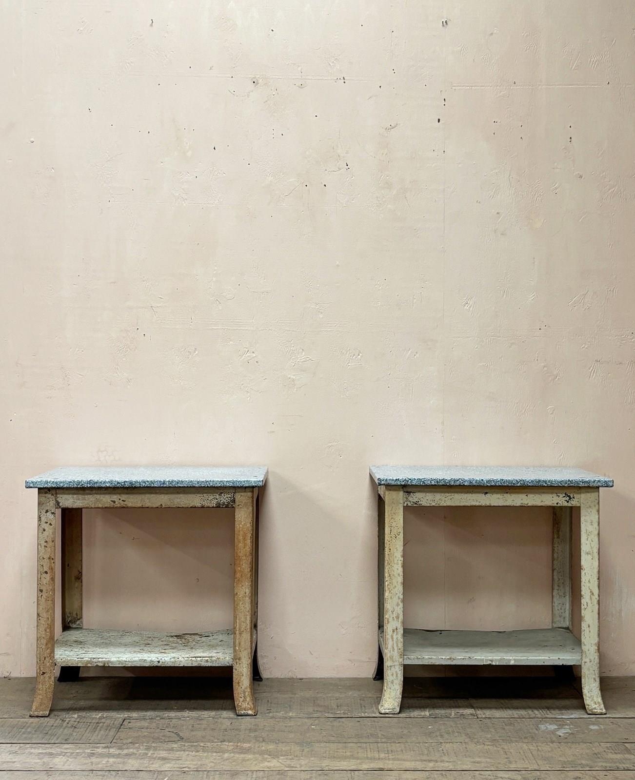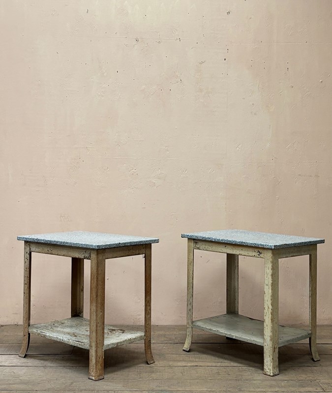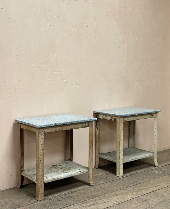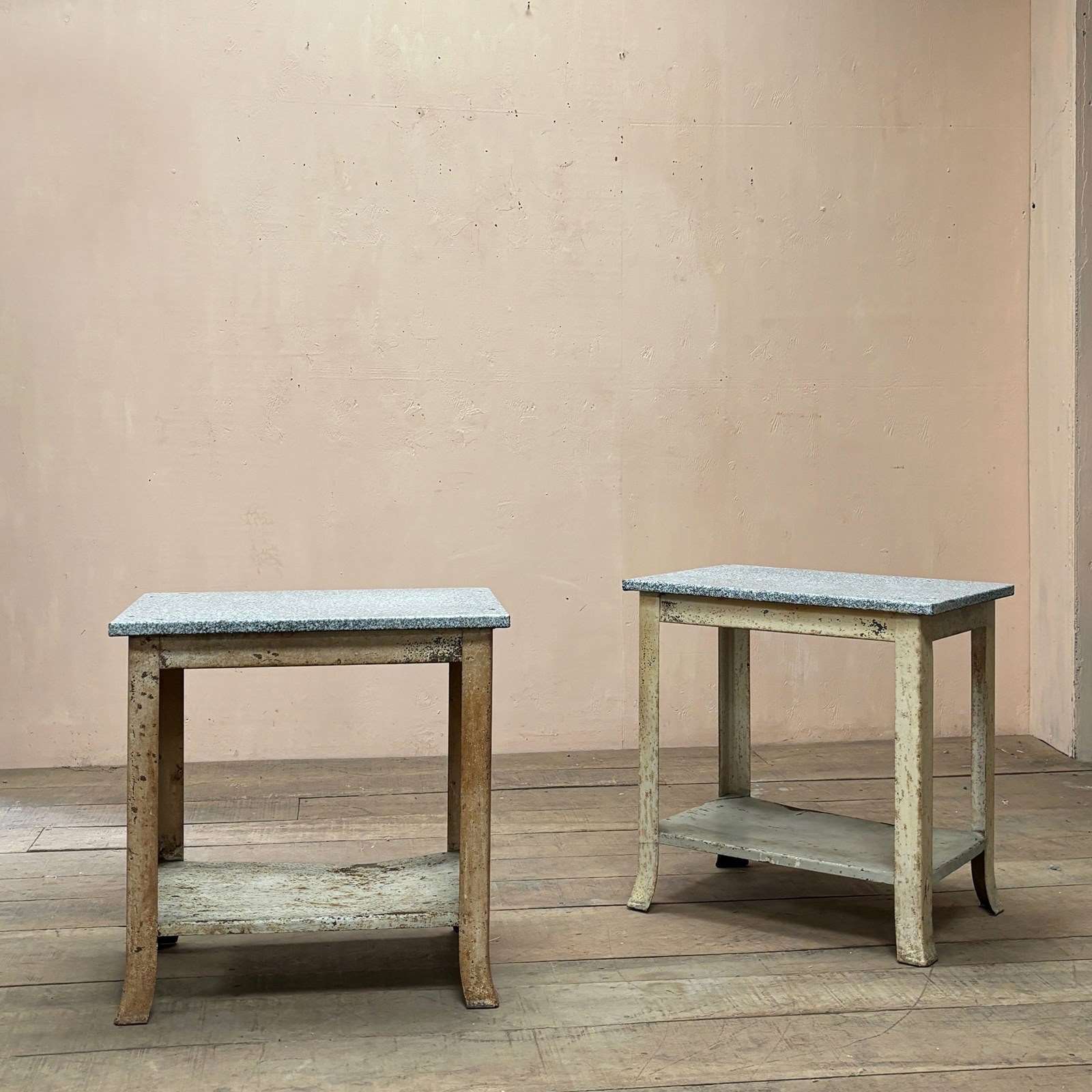 Pair of early 20th century steel tables with speckled grey and white stone enamel tops.