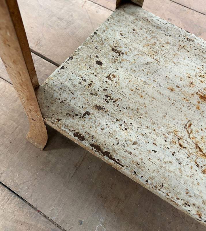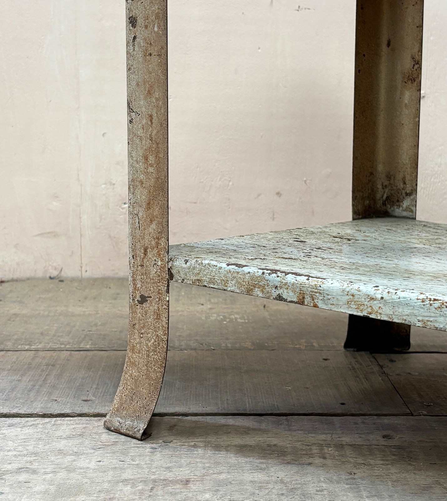 The legs and the lower shelves are in their original paint, though worn and rusty.