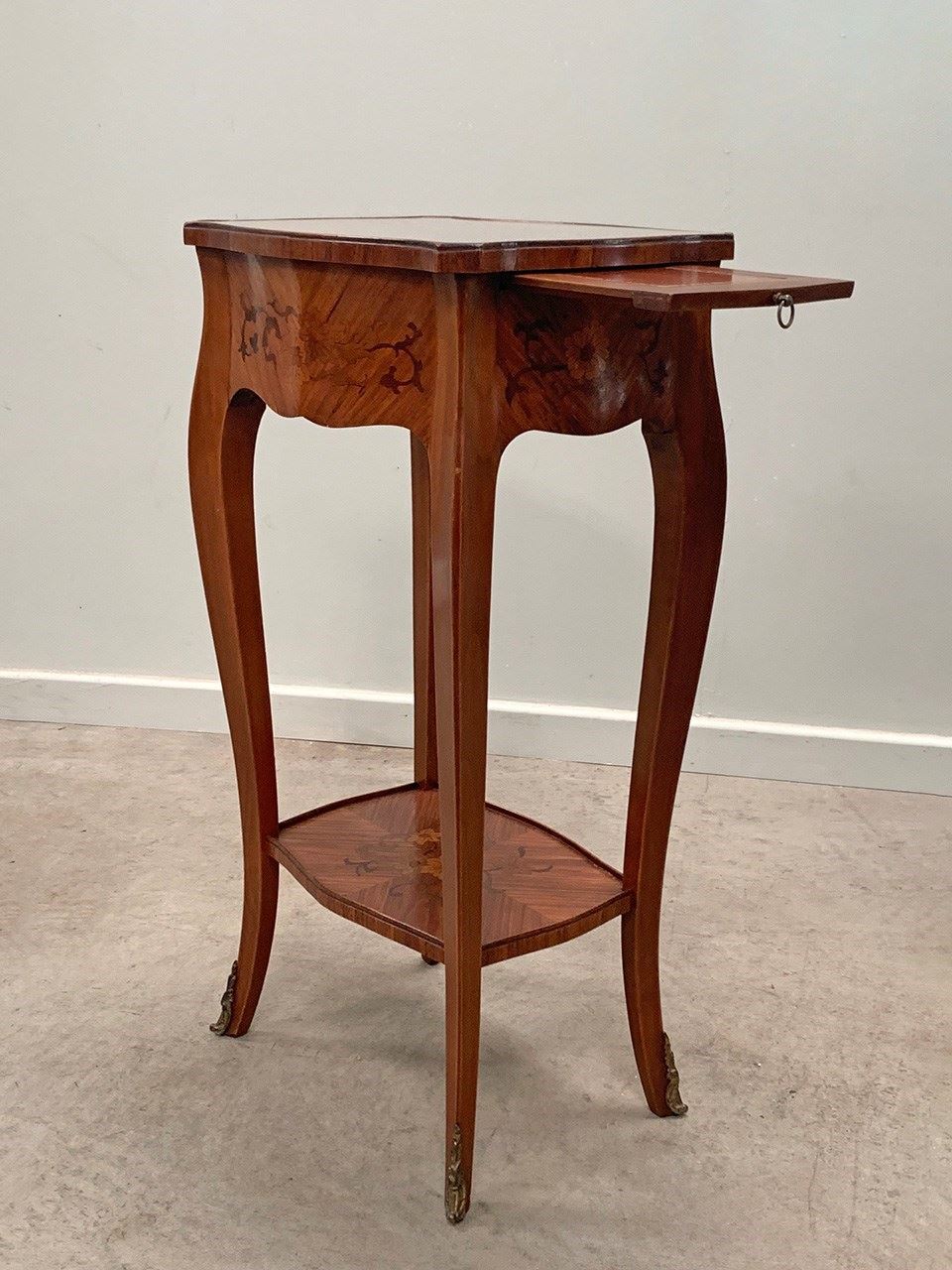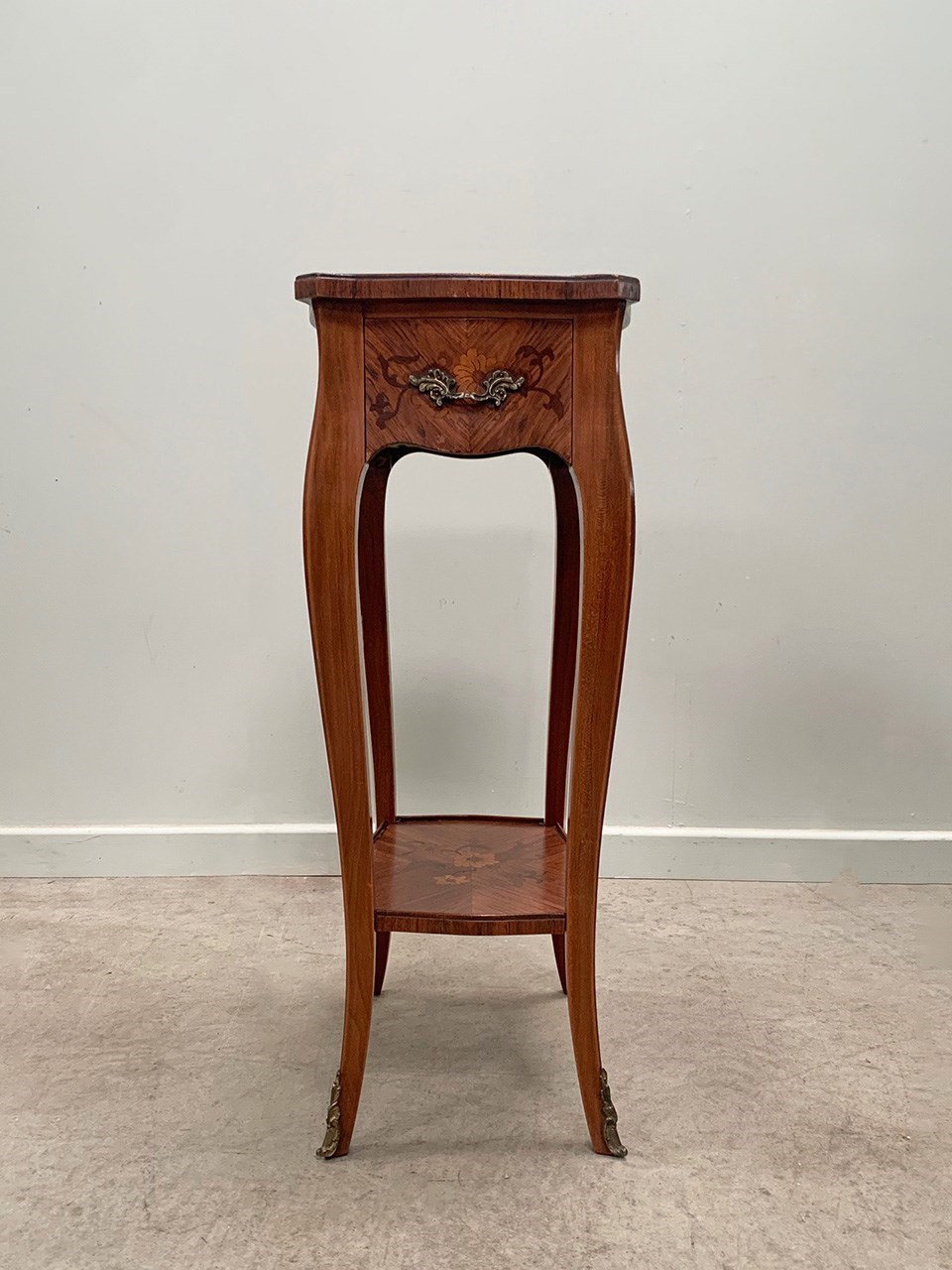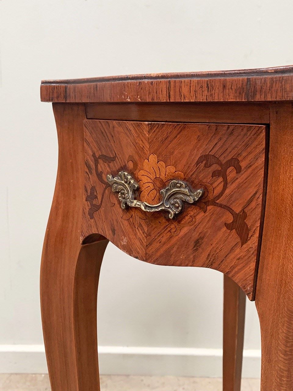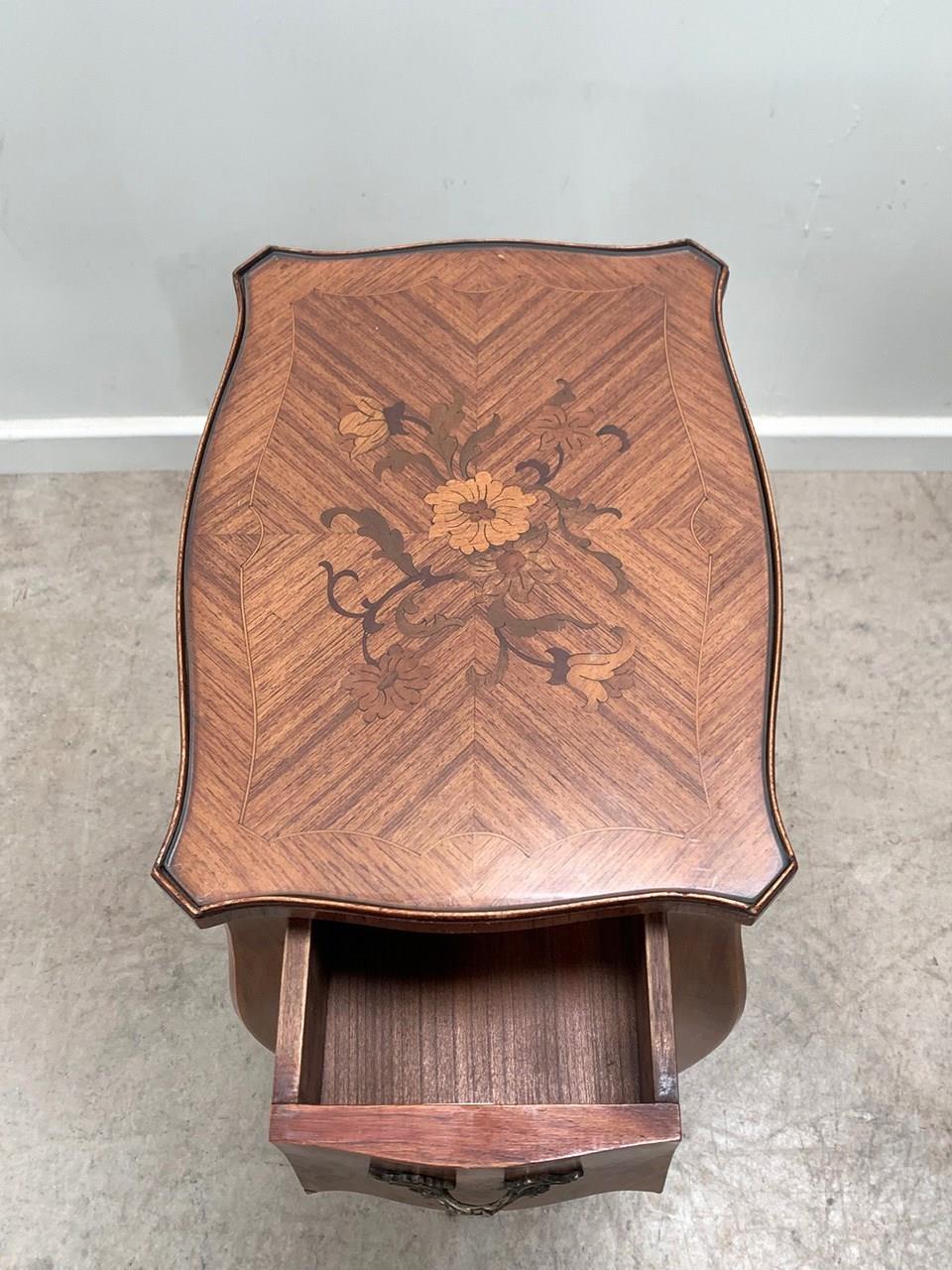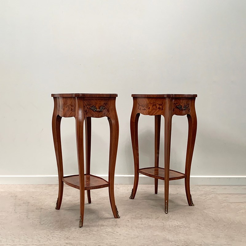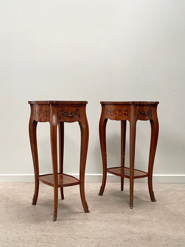 A beautiful pair of Louis XV style fruitwood bedside cabinets with cabriole legs and marquetry inlay on the top, sides and lower shelf.