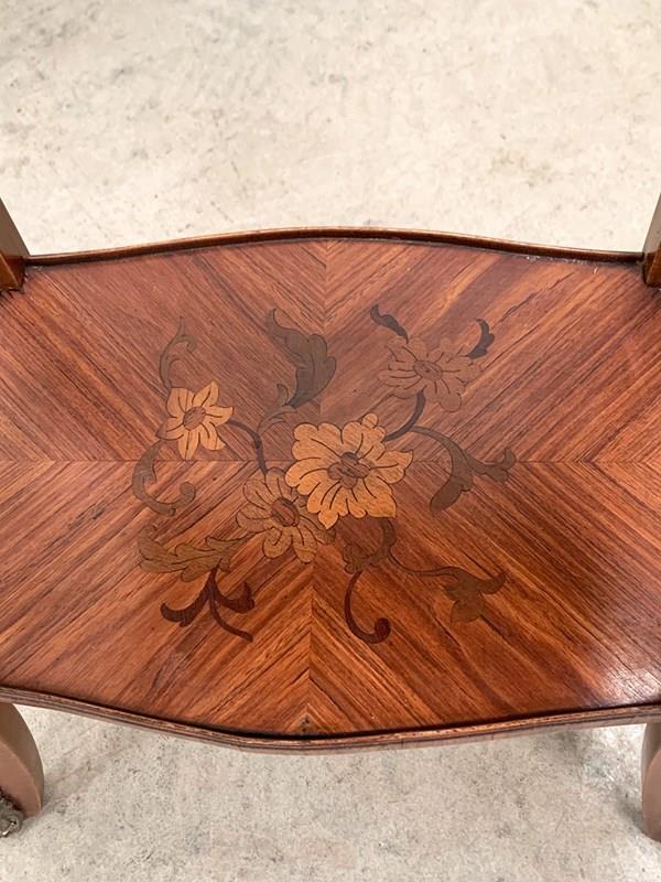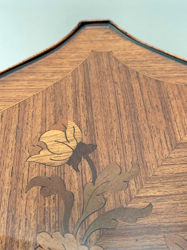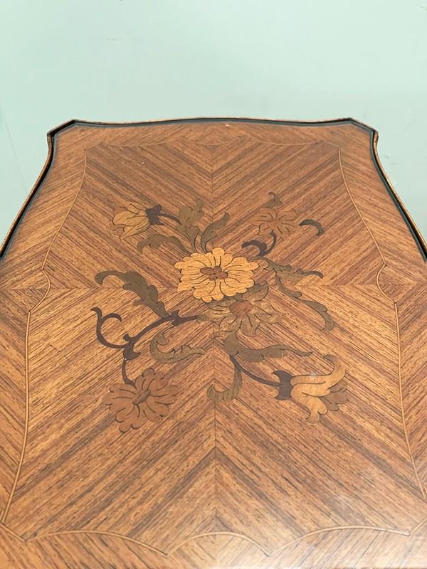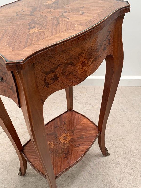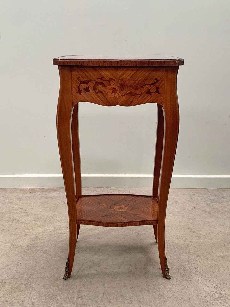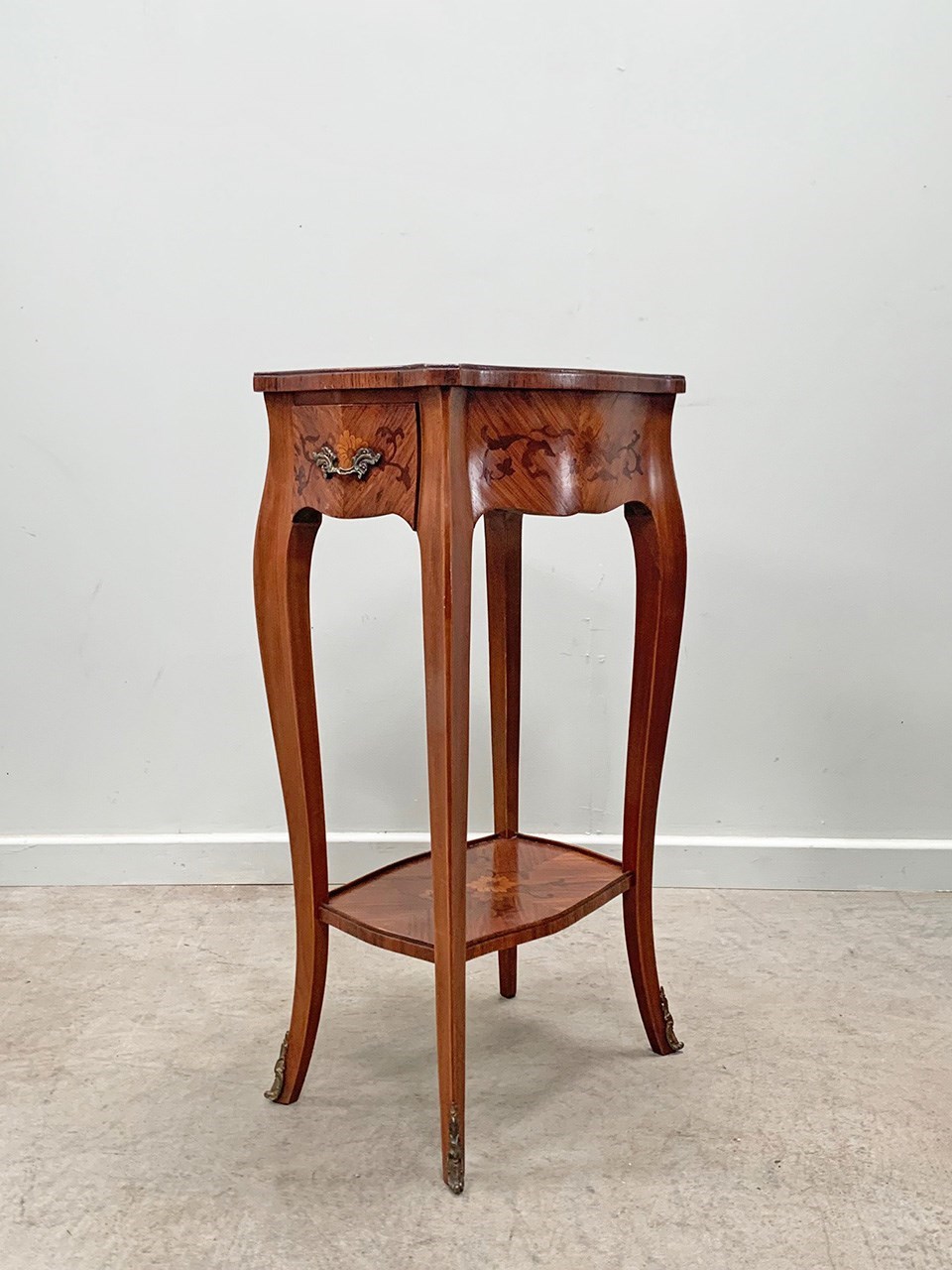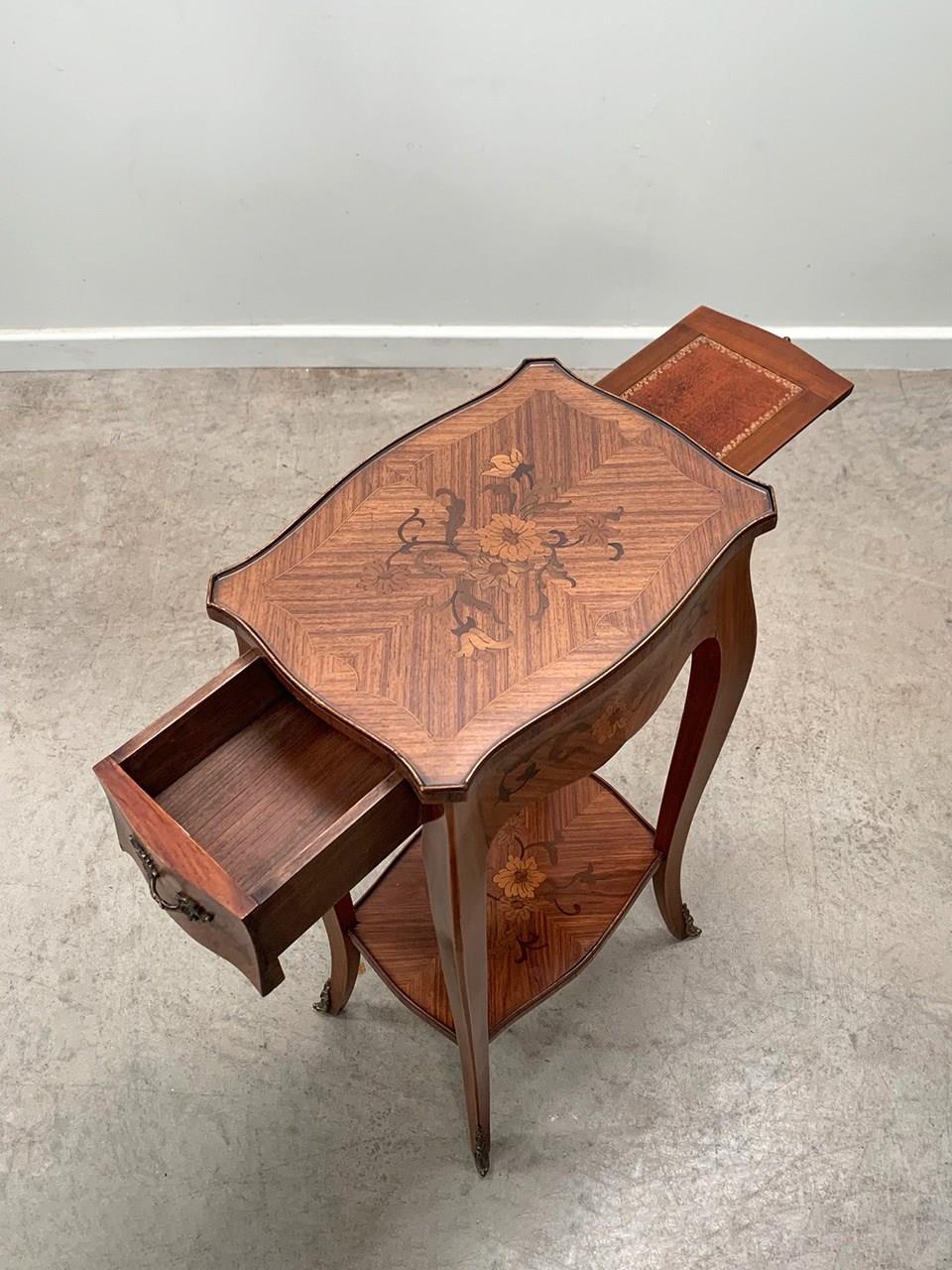 A beautiful pair of Louis XV style fruitwood bedside cabinets with cabriole legs and marquetry inlay on the top, sides and lower shelf.