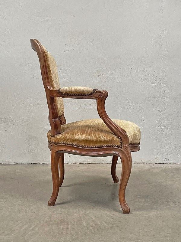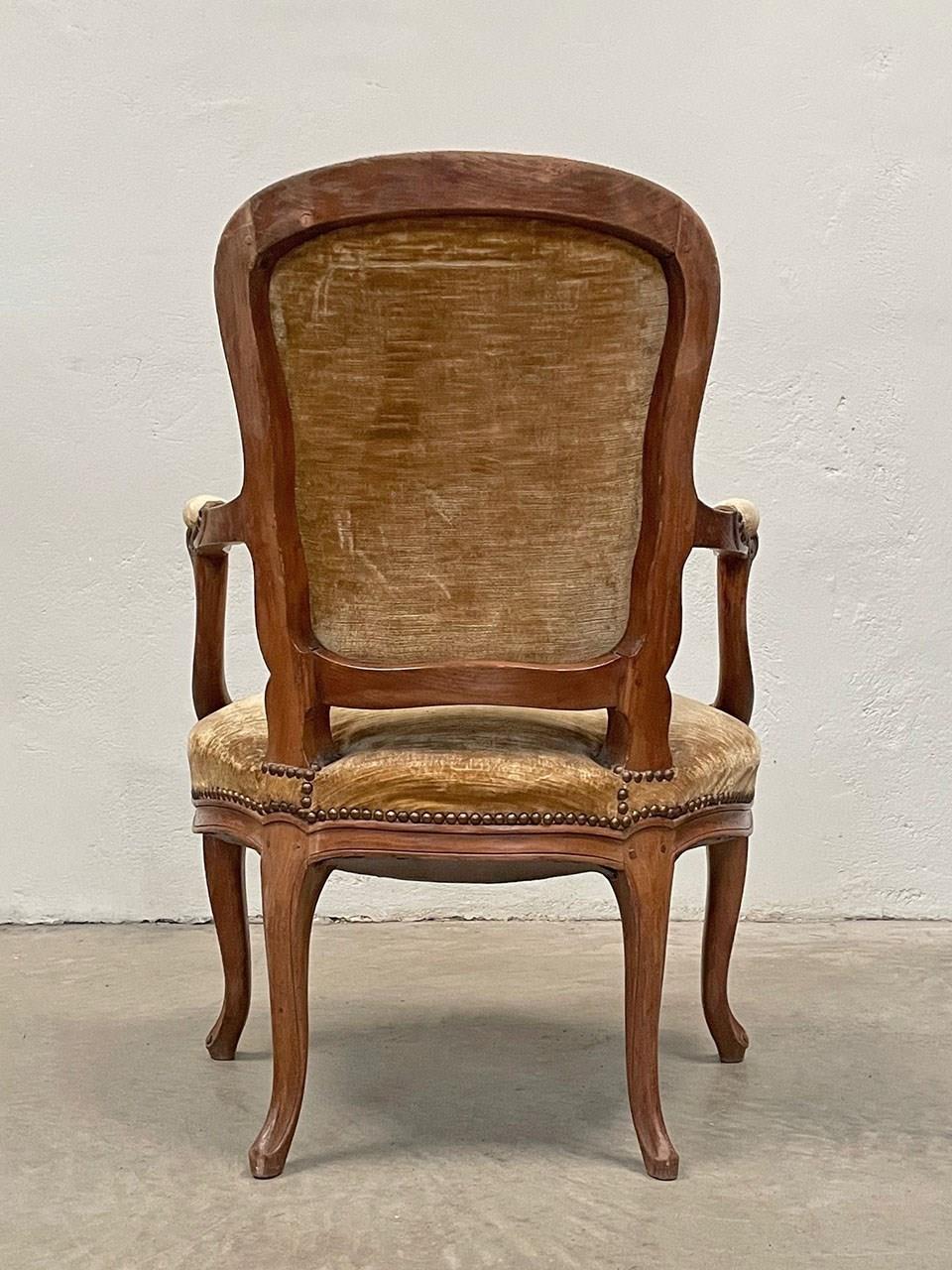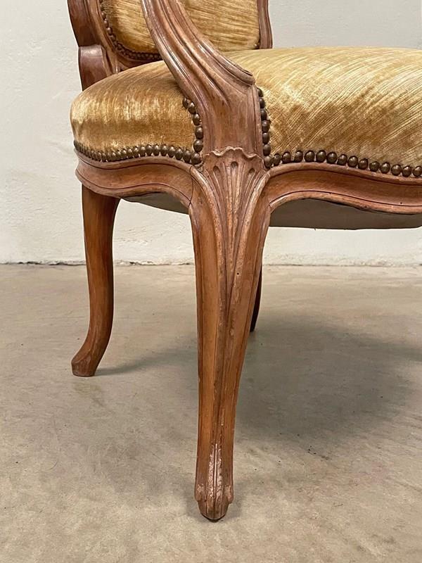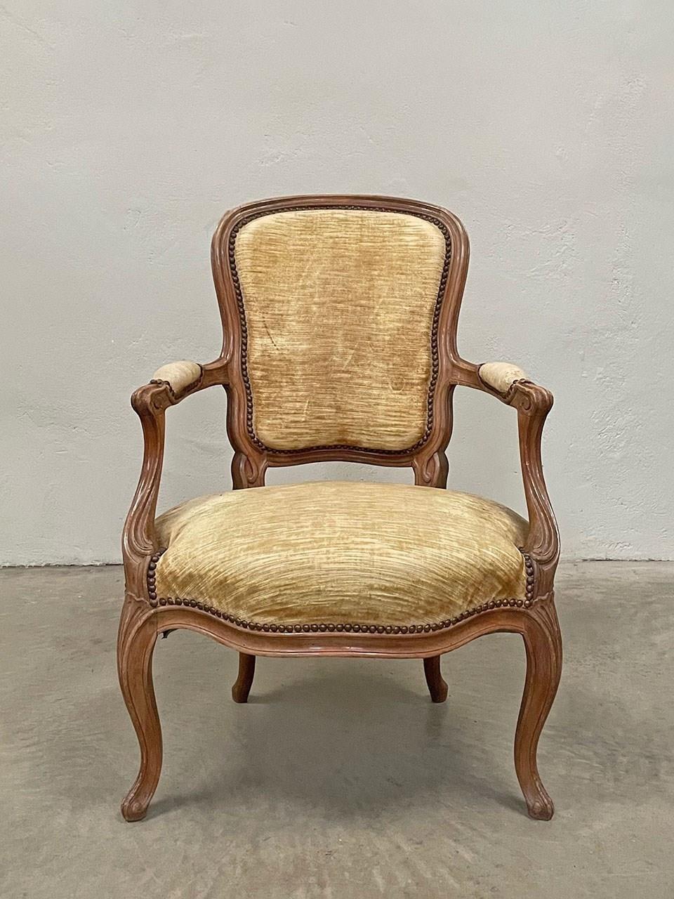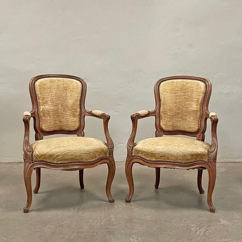 Pair of upholstered, open-arm salon chairs in Louis XV style. In beech wood.