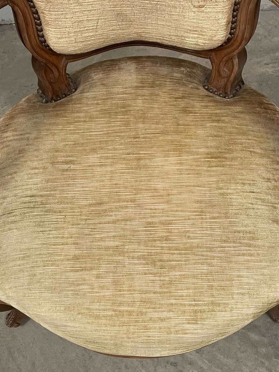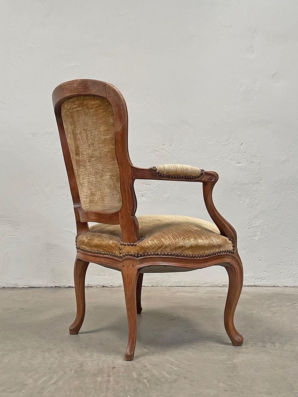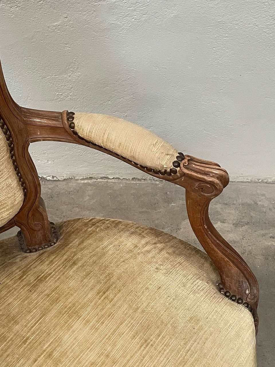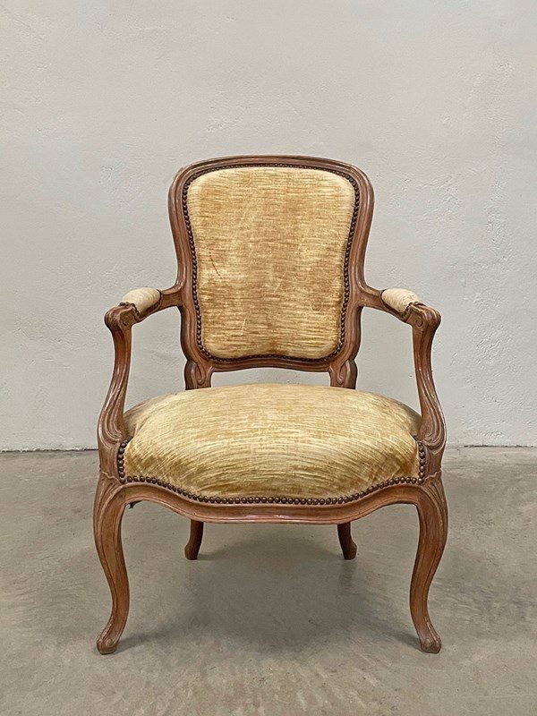 Pair of upholstered, open-arm salon chairs in Louis XV style. In beech wood.