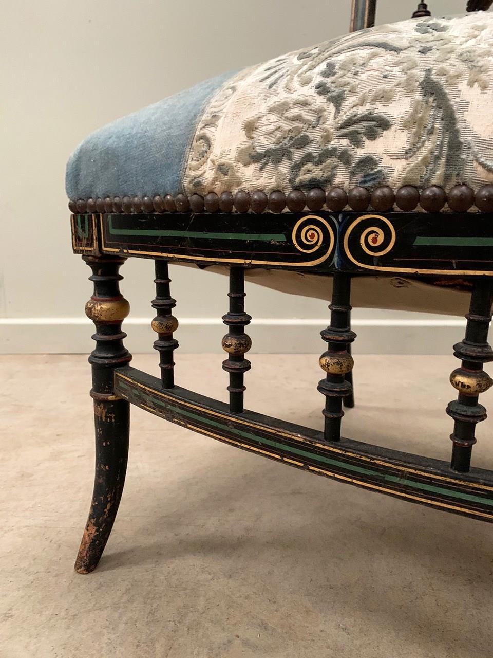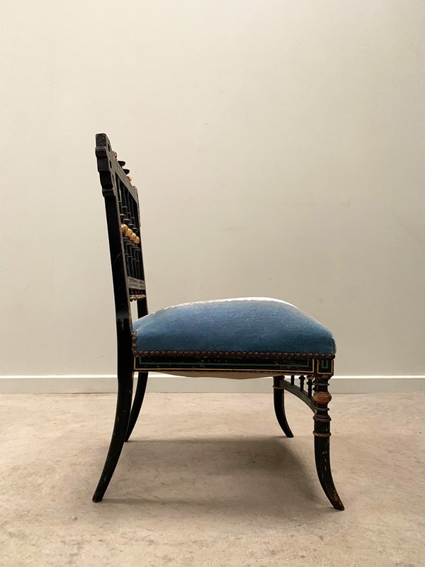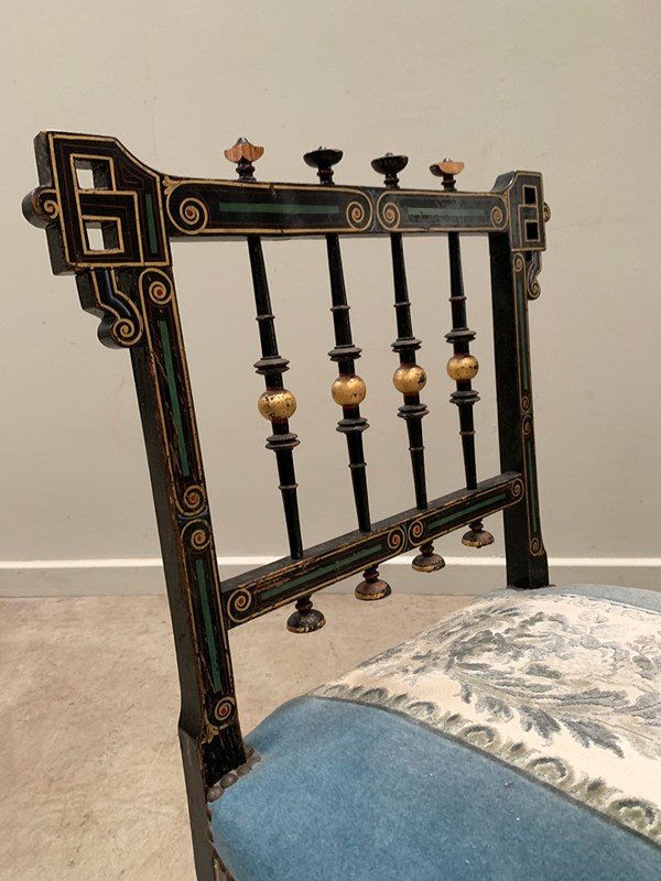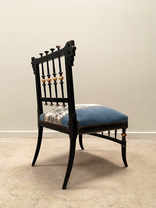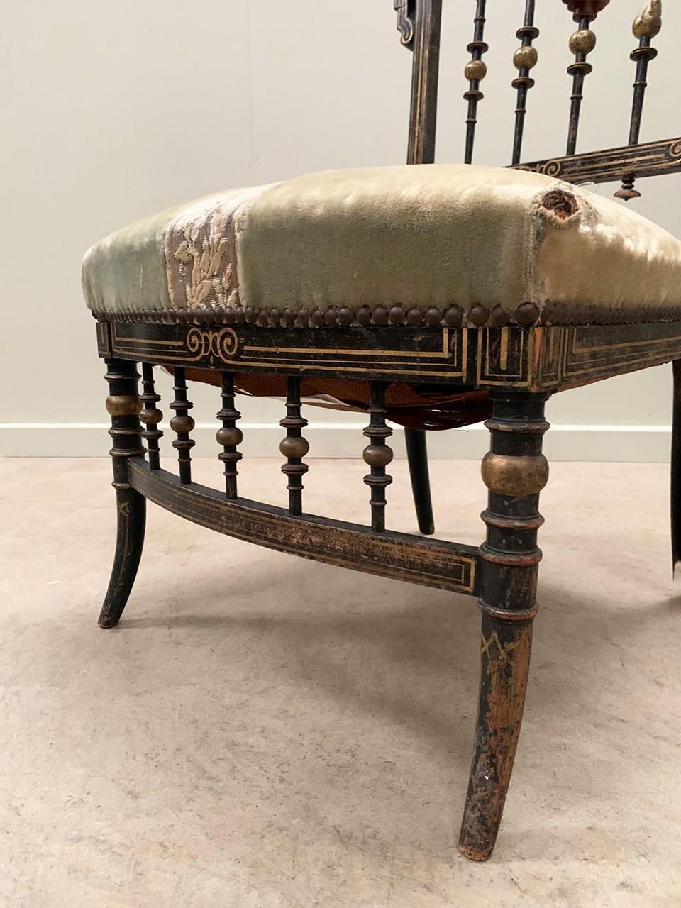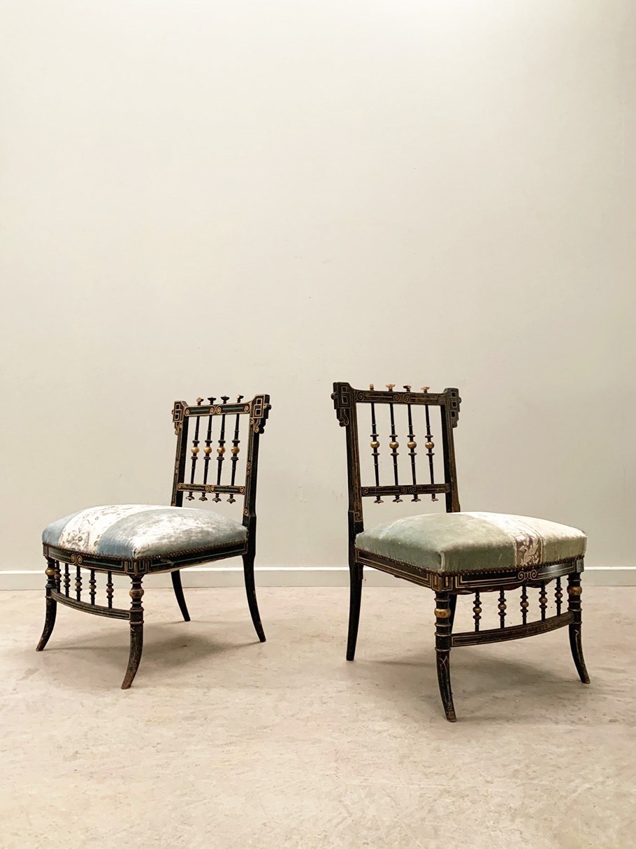 A near identical pair of Napoleon III salon chairs, with an ebonised frame, colourful patterns and gilded detailing throughout, and sabre legs. The colours are slightly faded on one of the chairs (right). Sourced from Nevers, Loire Valley.