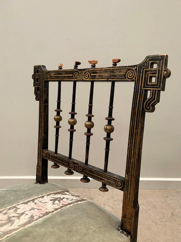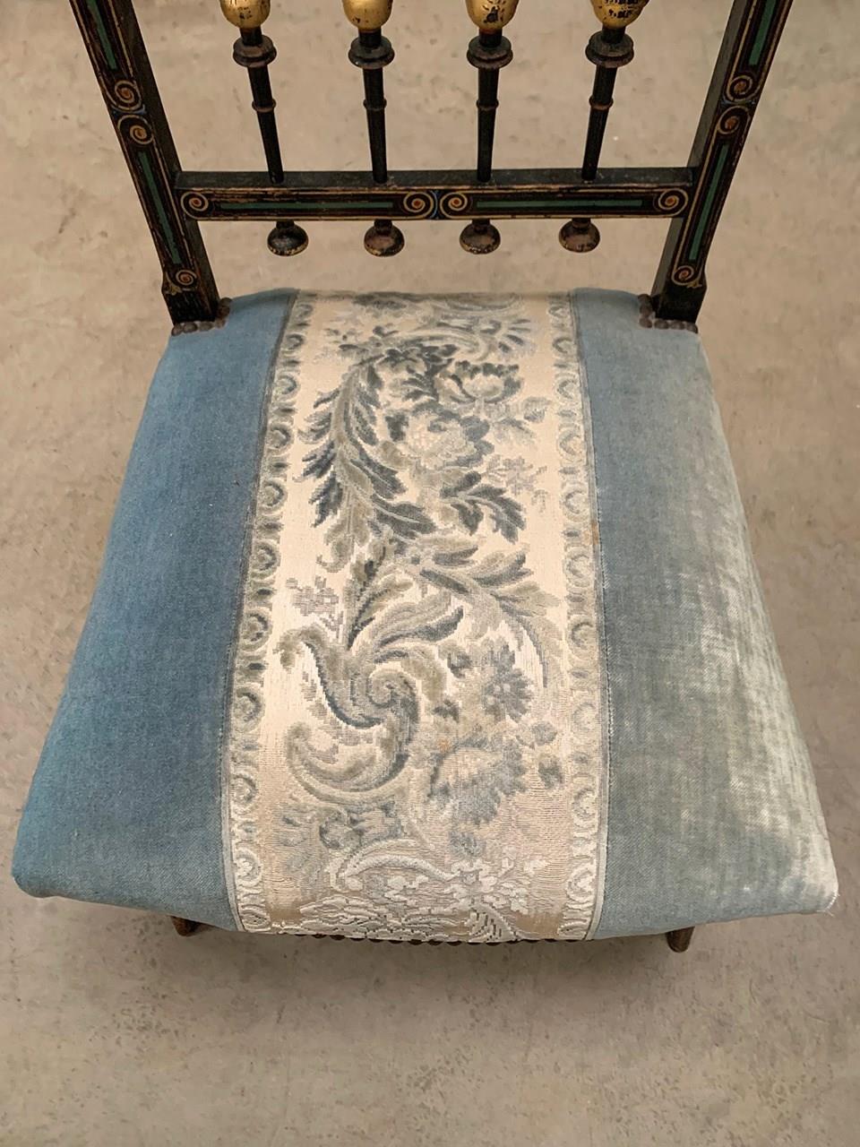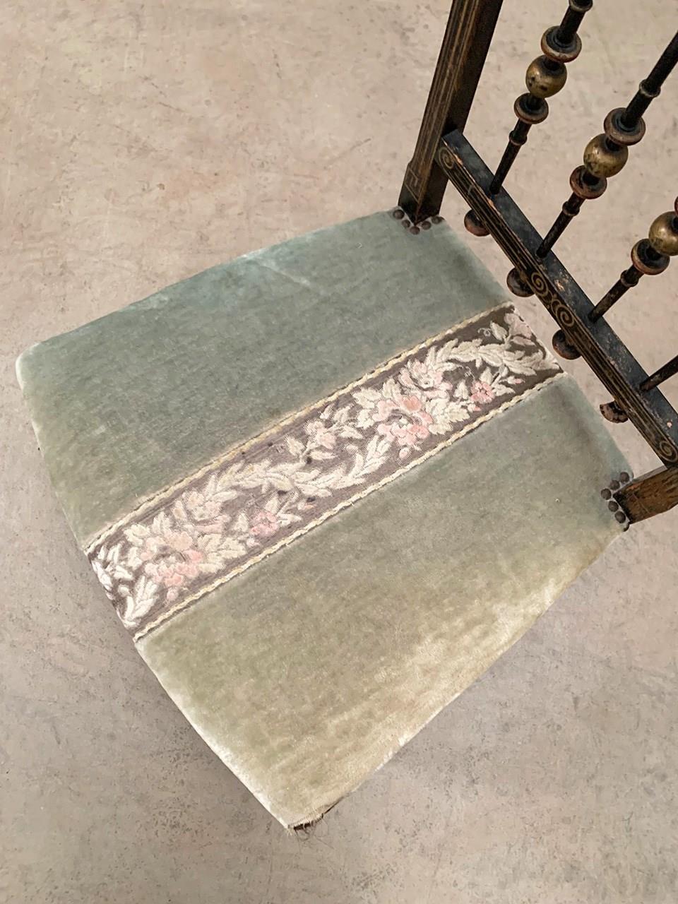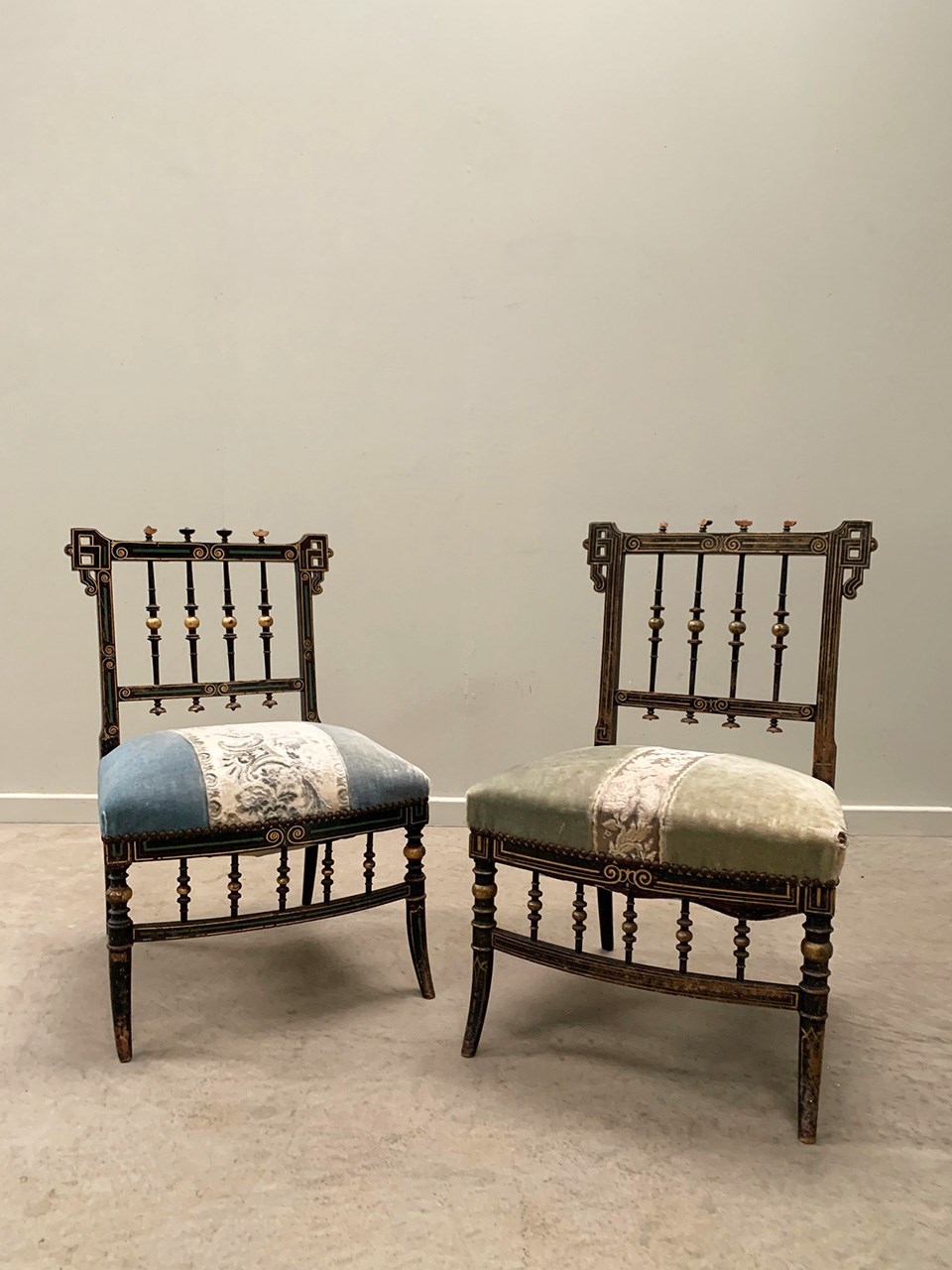 A near identical pair of Napoleon III salon chairs, with an ebonised frame, colourful patterns and gilded detailing throughout, and sabre legs. The colours are slightly faded on one of the chairs (right). Sourced from Nevers, Loire Valley.