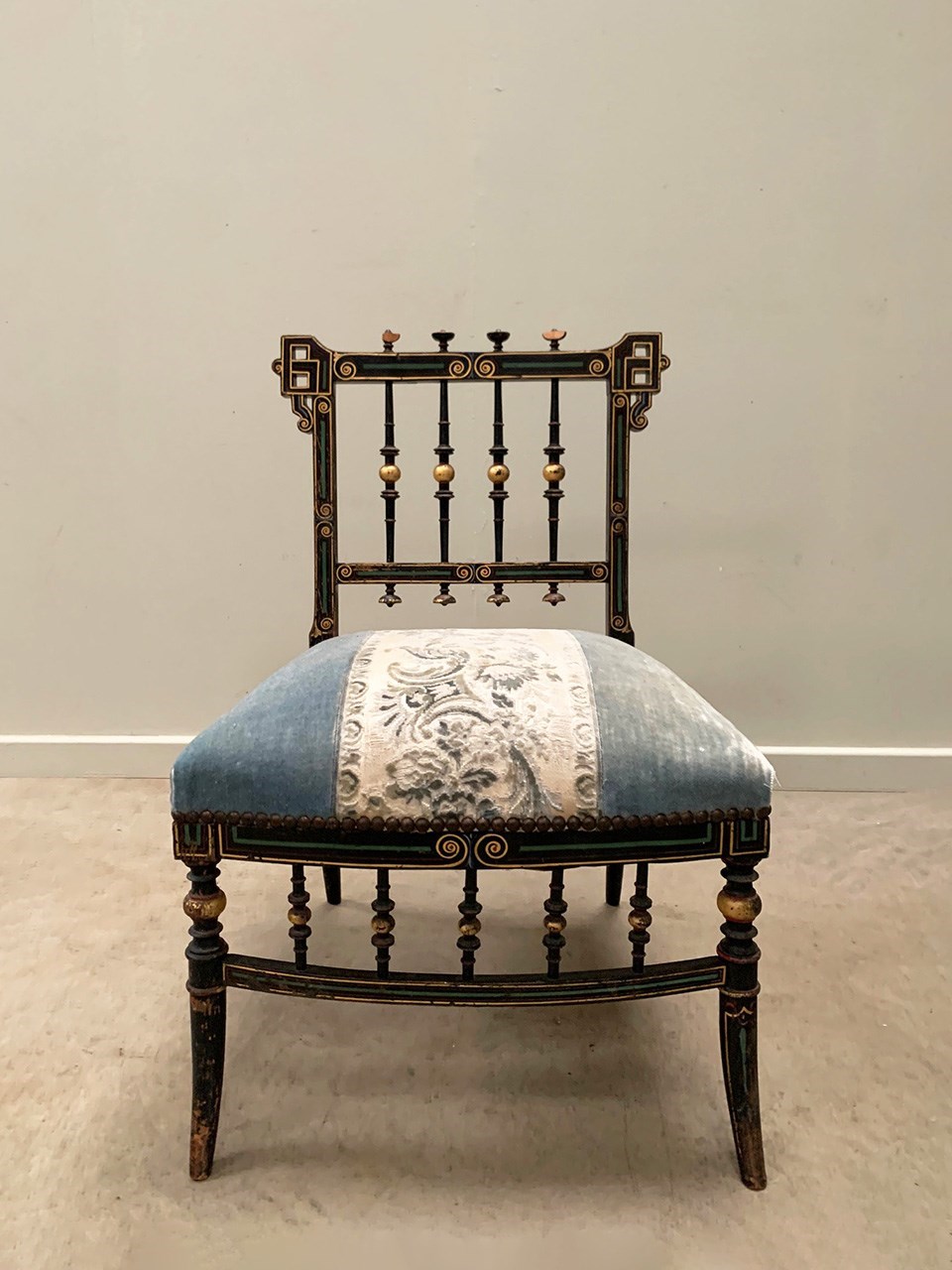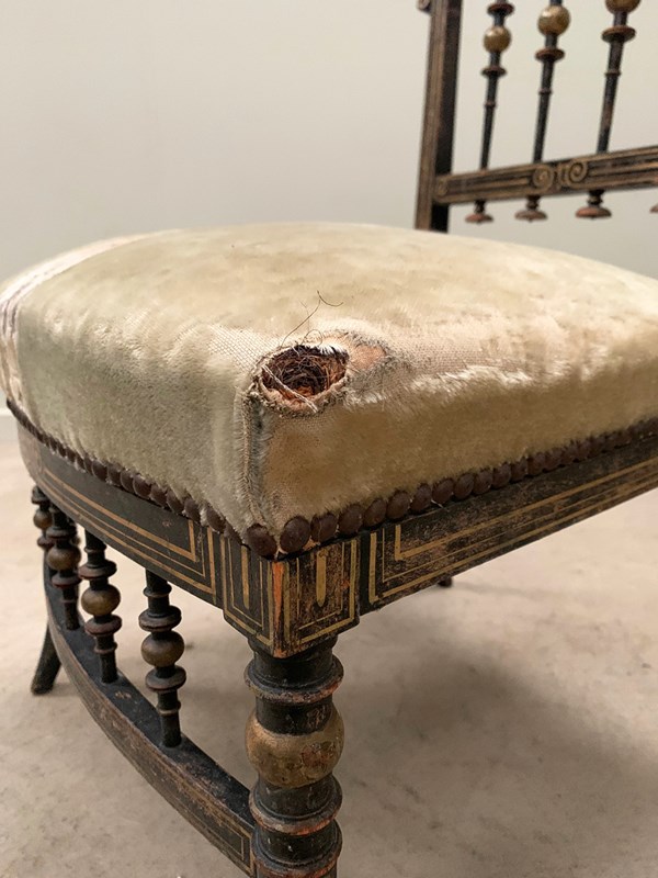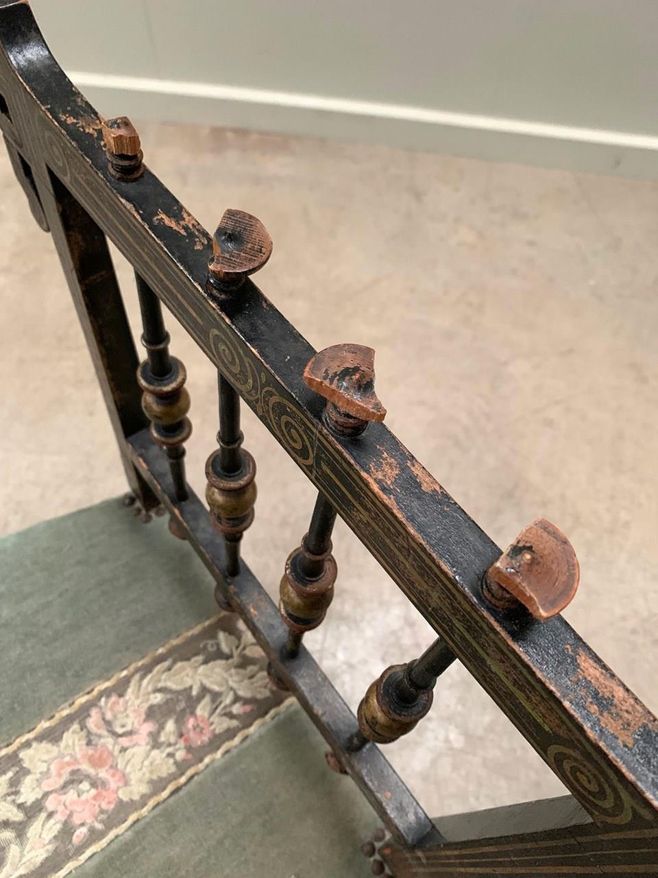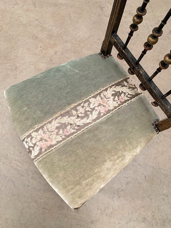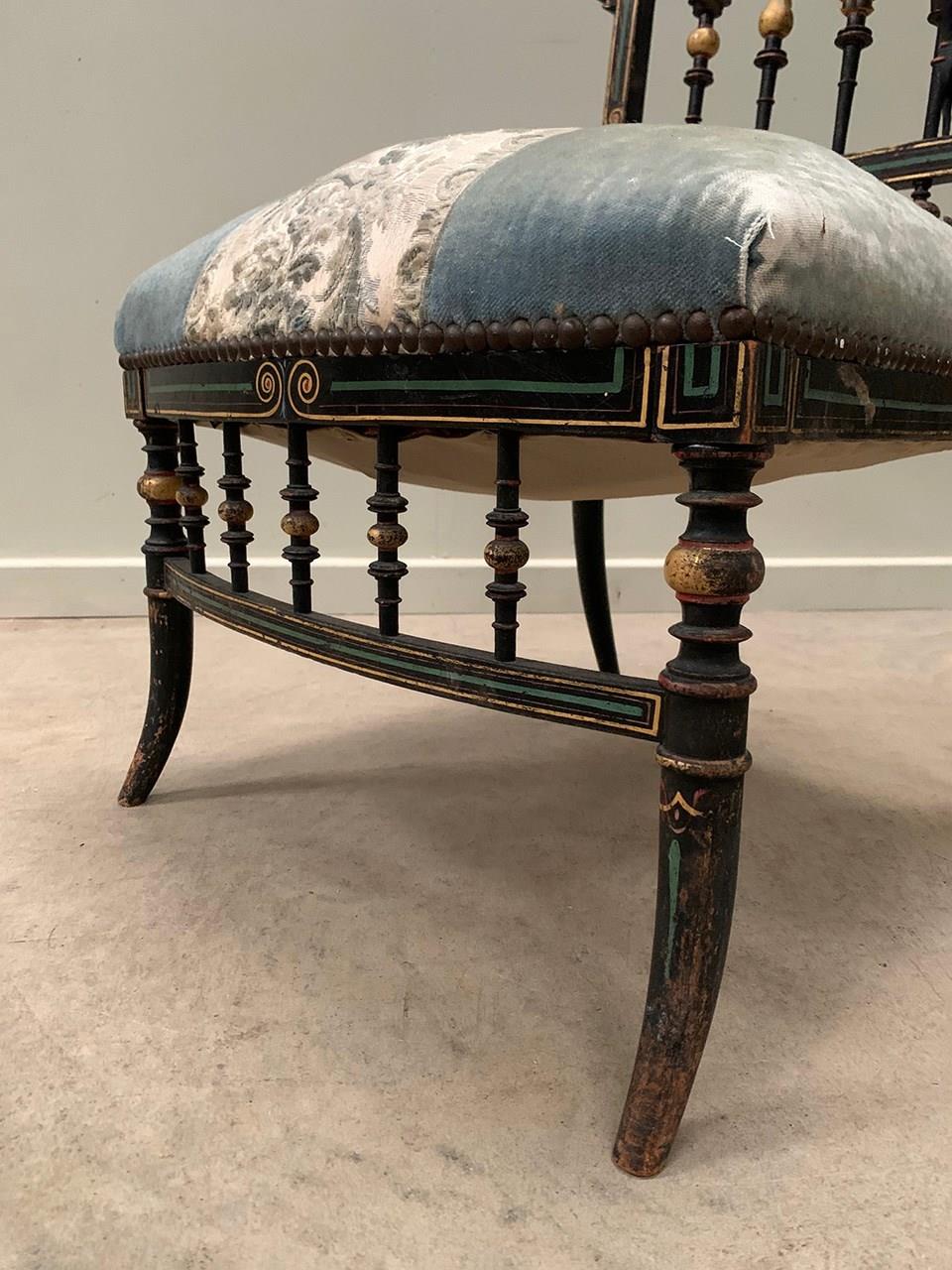 A near identical pair of Napoleon III salon chairs, with an ebonised frame, colourful patterns and gilded detailing throughout, and sabre legs. The colours are slightly faded on one of the chairs (right). Sourced from Nevers, Loire Valley.