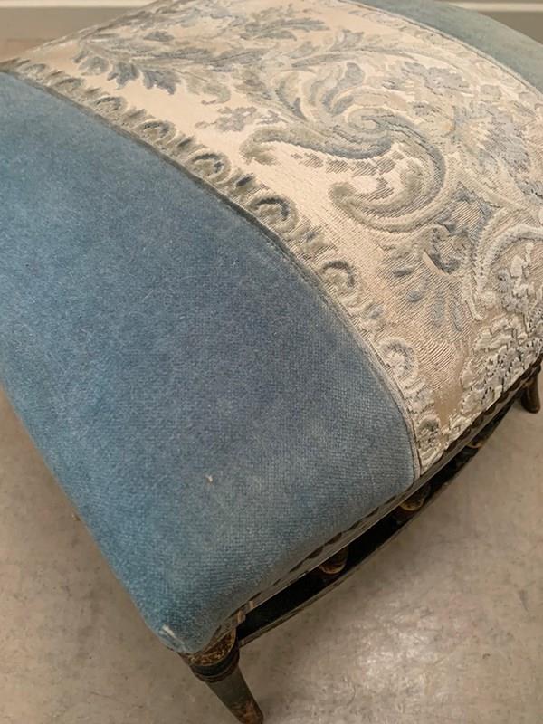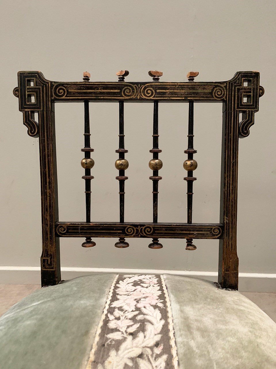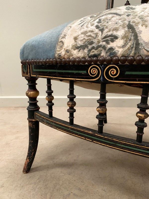 With sprung seats, the upholstery is lightly worn in places, but remains usable. We can quote to re-upholster, as well as replace the finials; please ask.