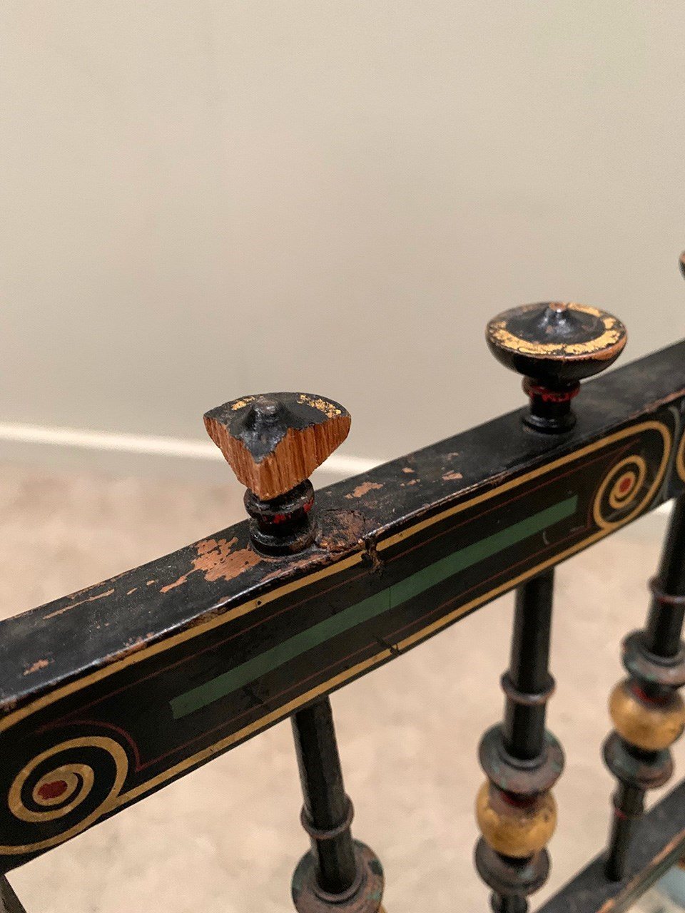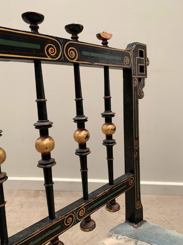 Each chair has four finials fixed to the top edge of the backrest, however there is visible damage. All other spindles are complete and in very good condition.