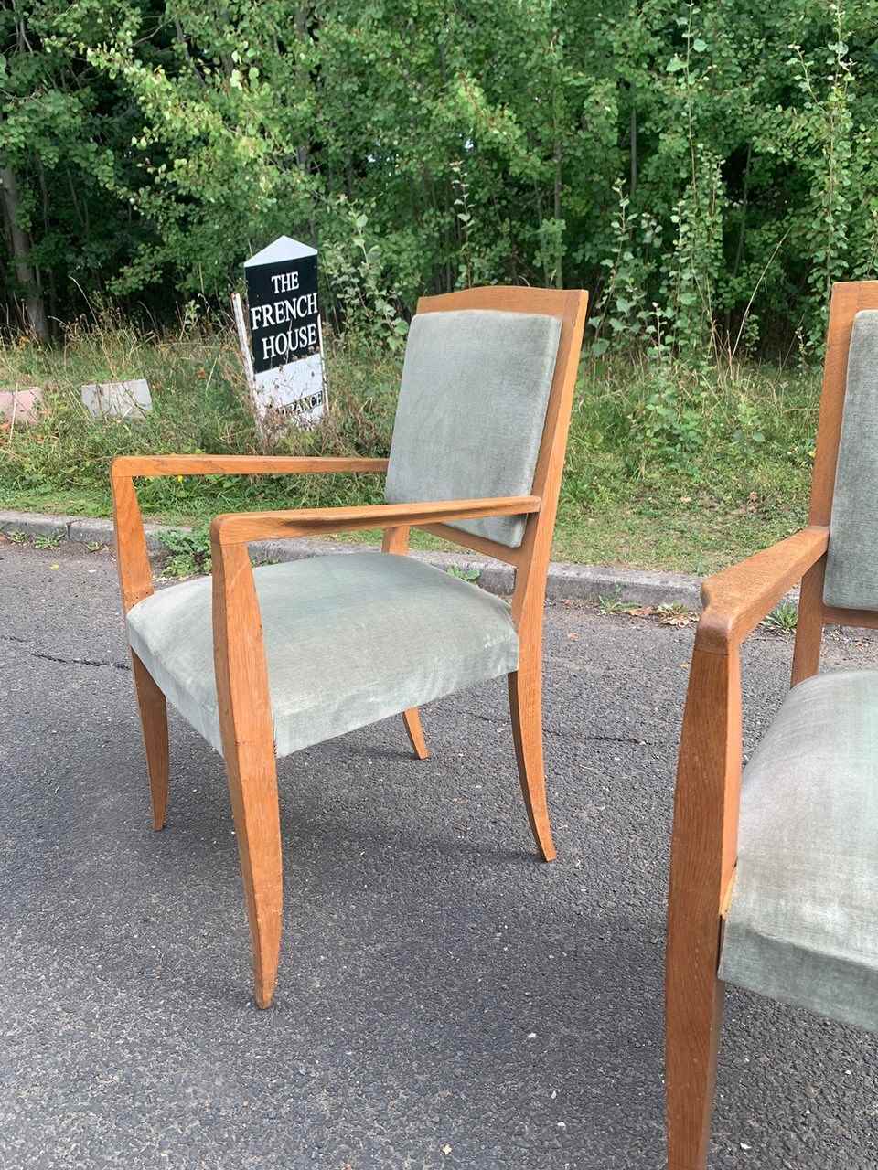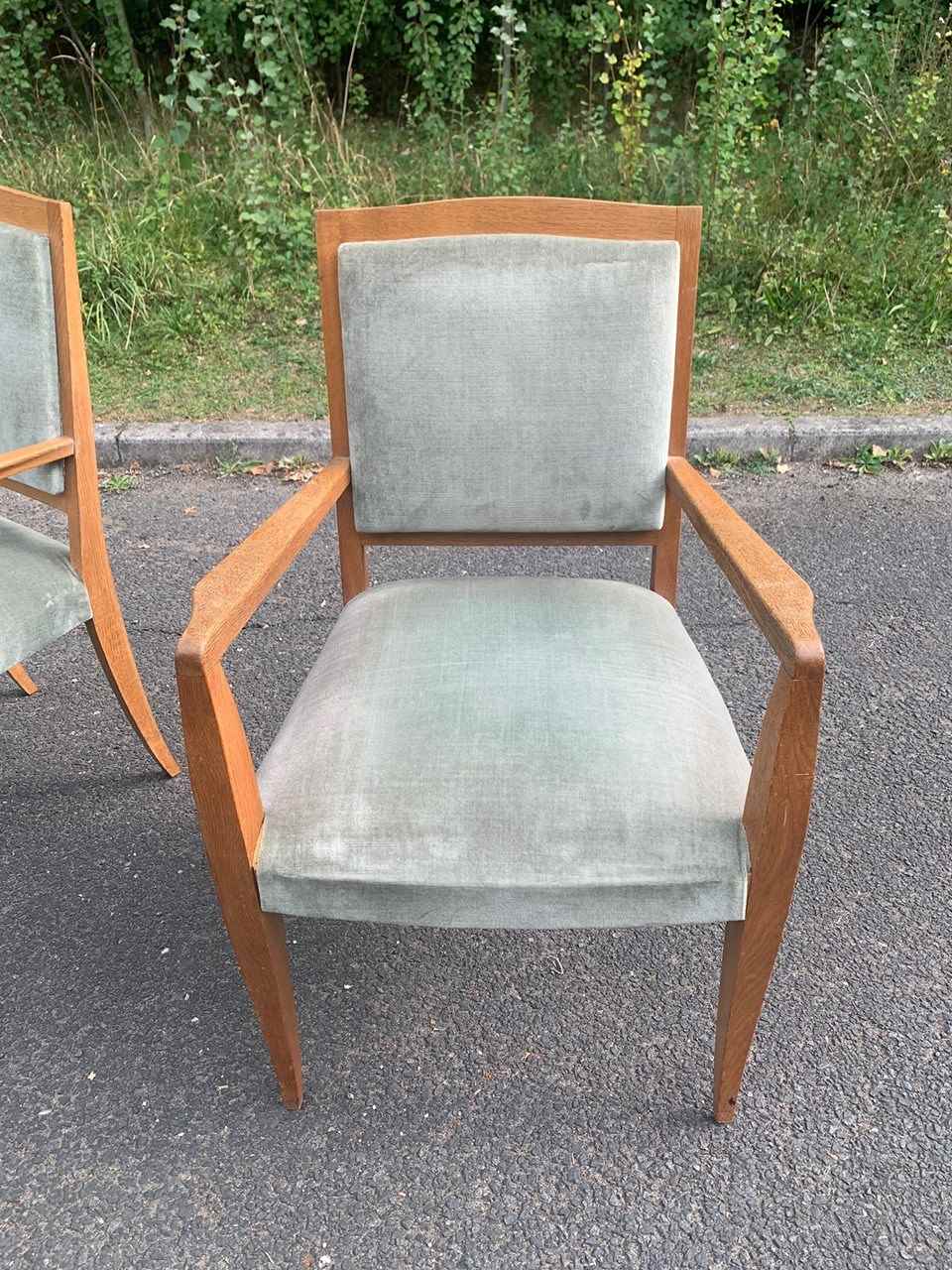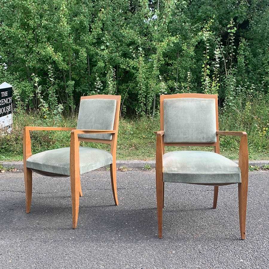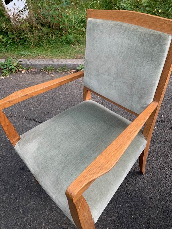 1960's generously sized upholstered chairs with light oak coloured frames and finished in a light green velvet style fabric.
