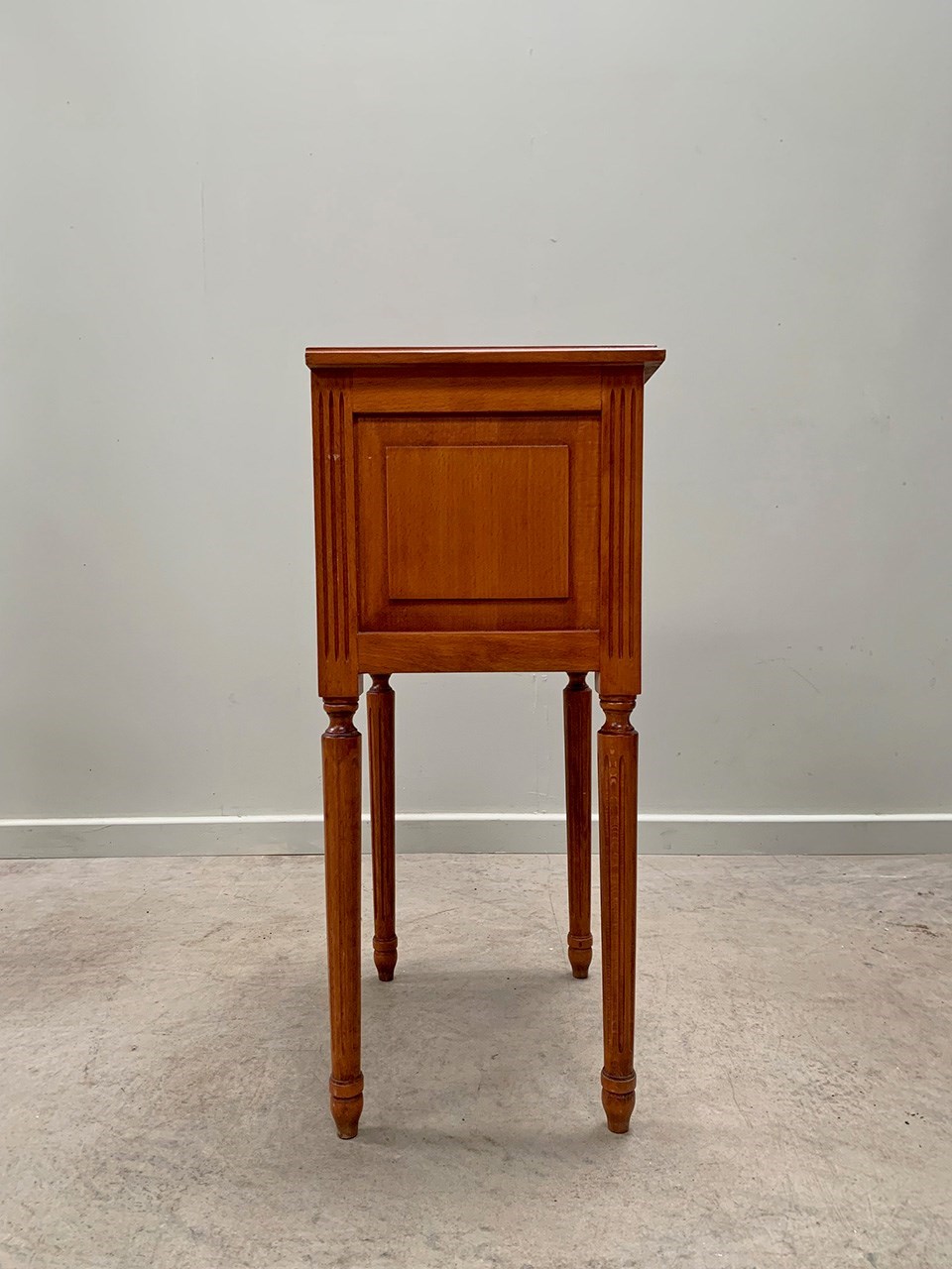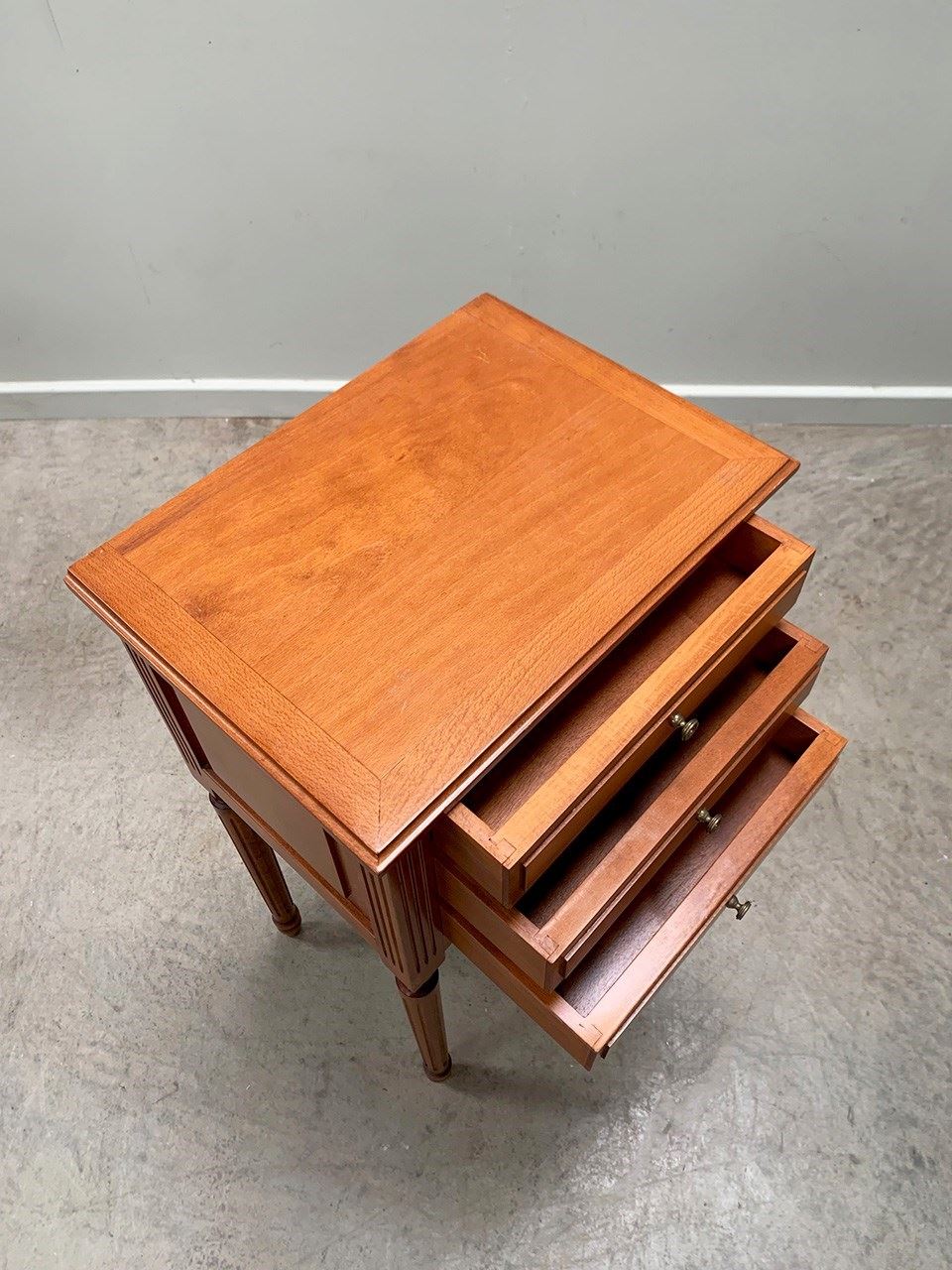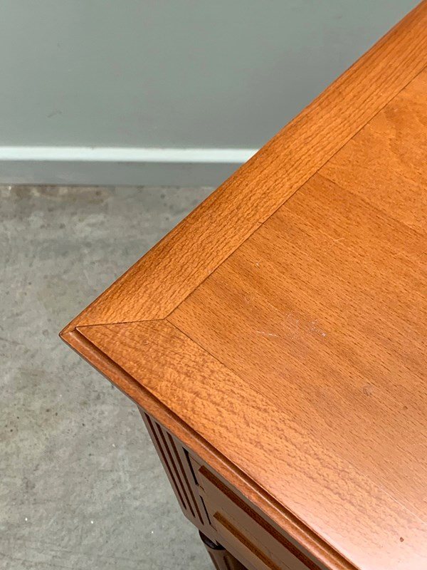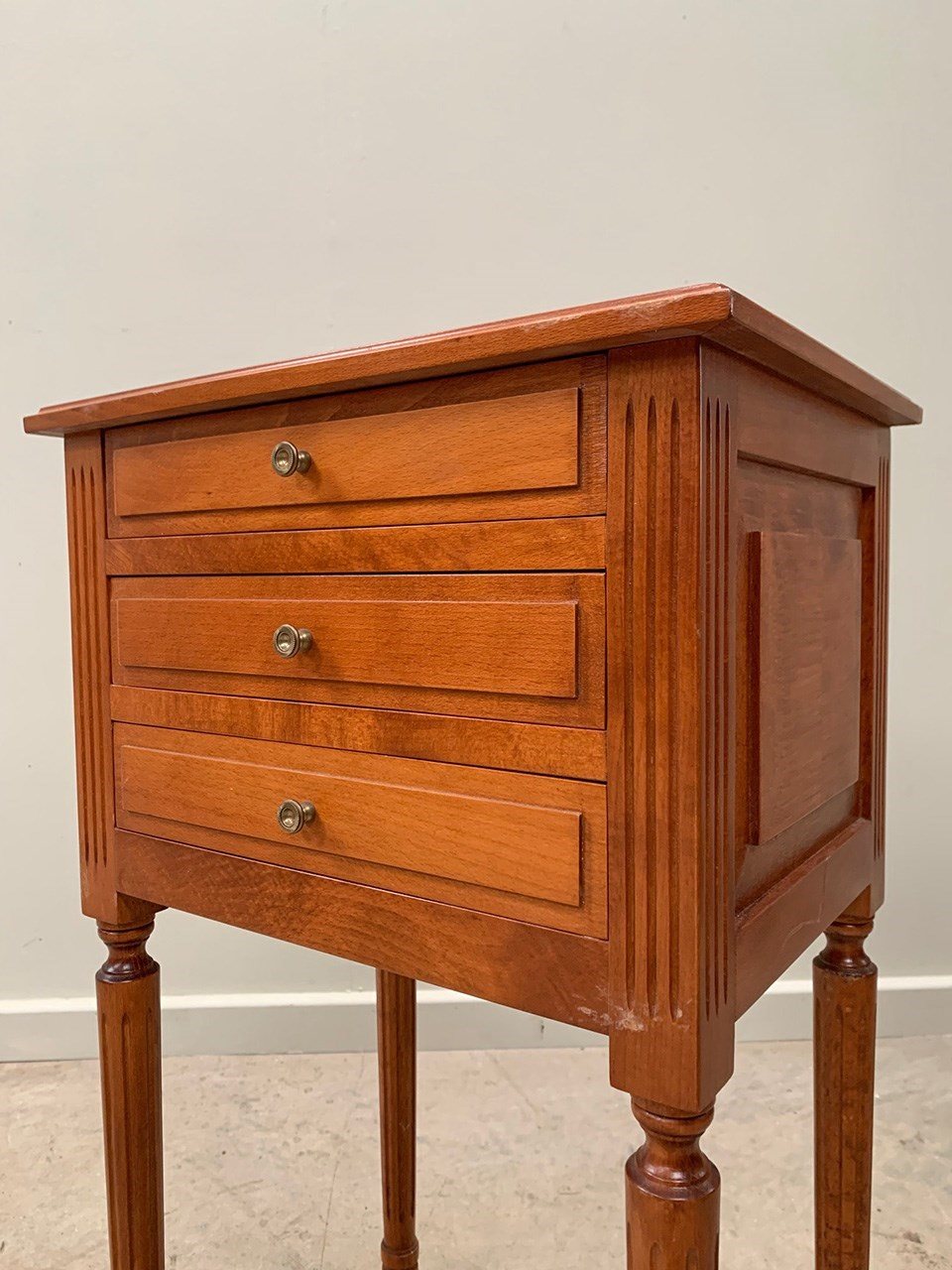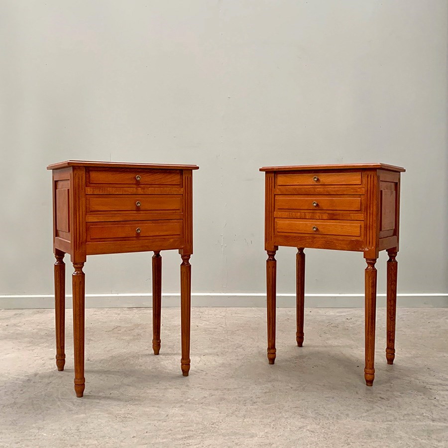 Neat pair of bedsides each with three drawers and on fluted legs.