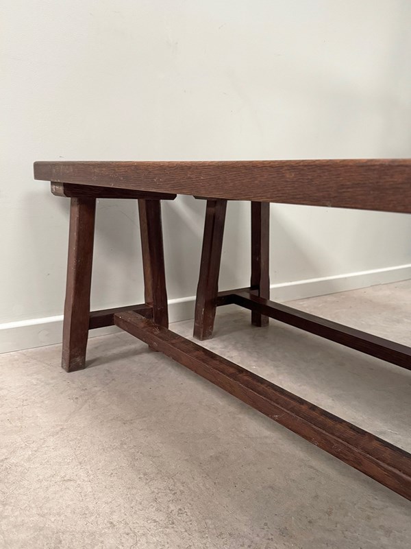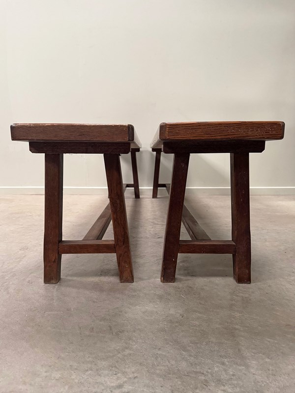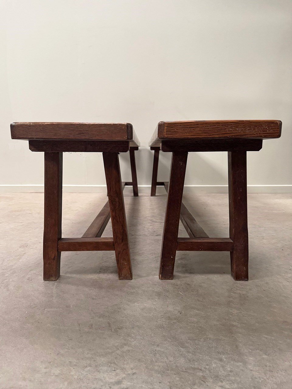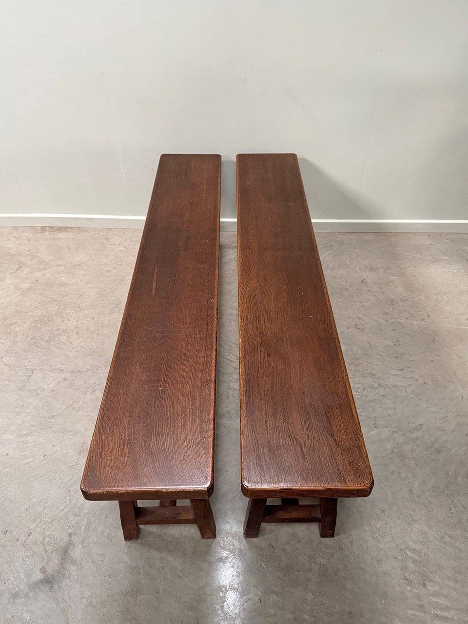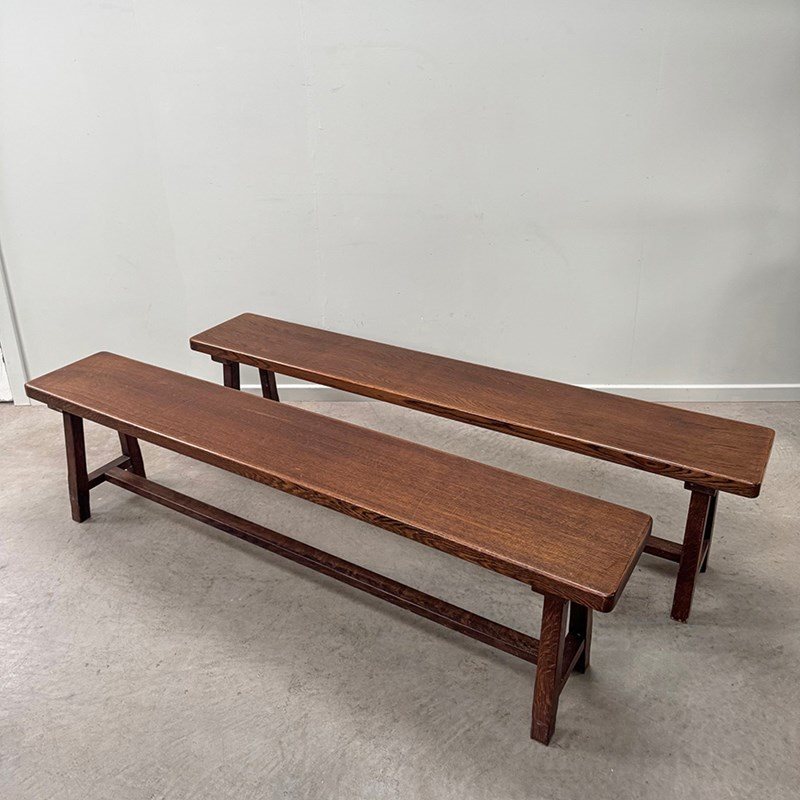 Two solid and generously sized oak benches which are heavy and are in sturdy condition.