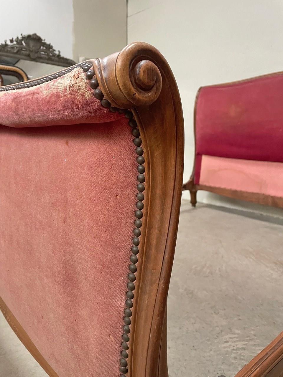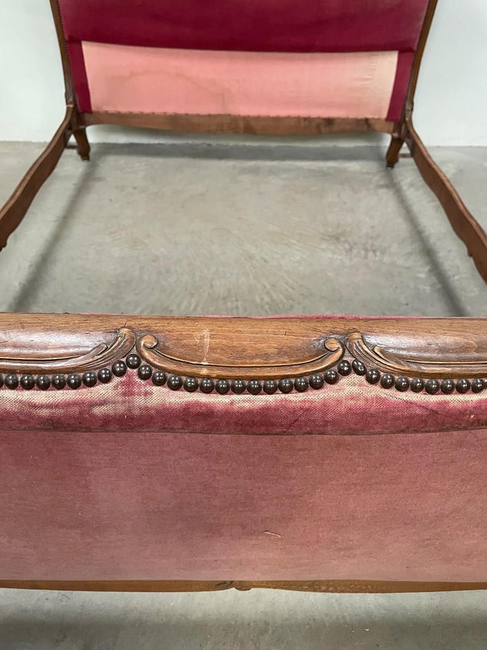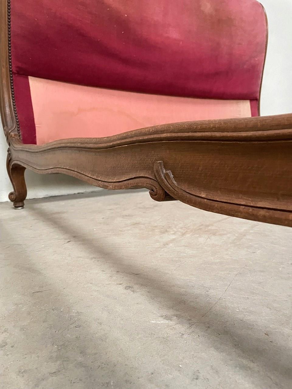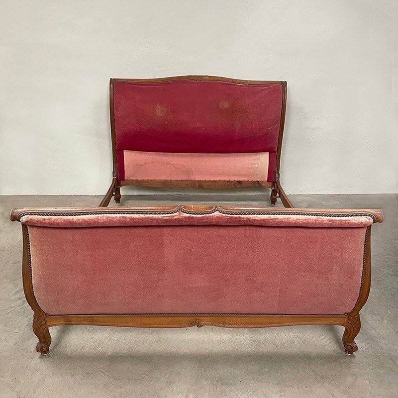 With a scrolled back headboard and footboard, this elegant bed has been upholstered in a pink velvet fabric and now requires re-upholstery.