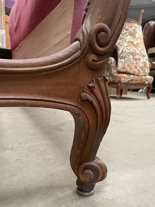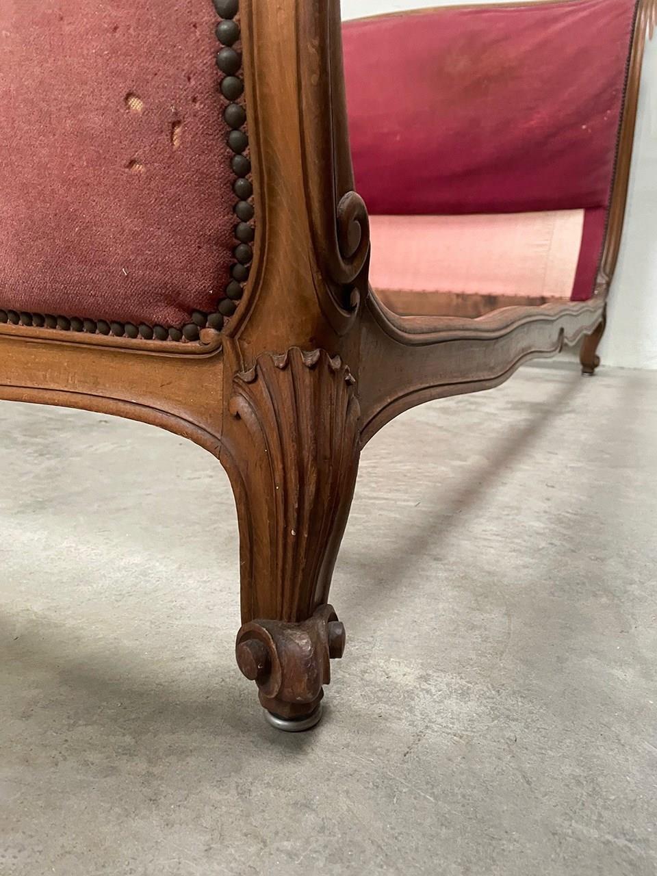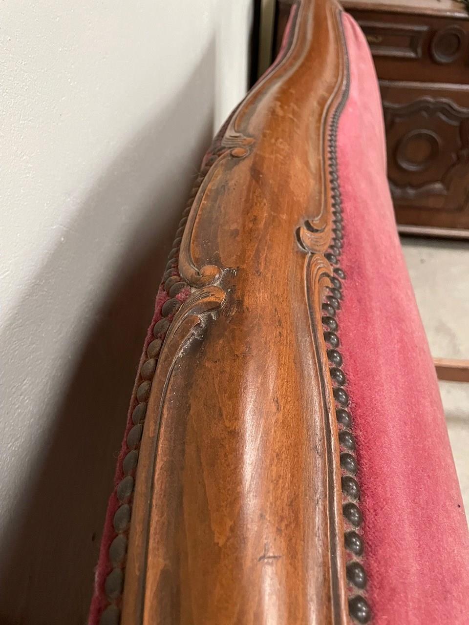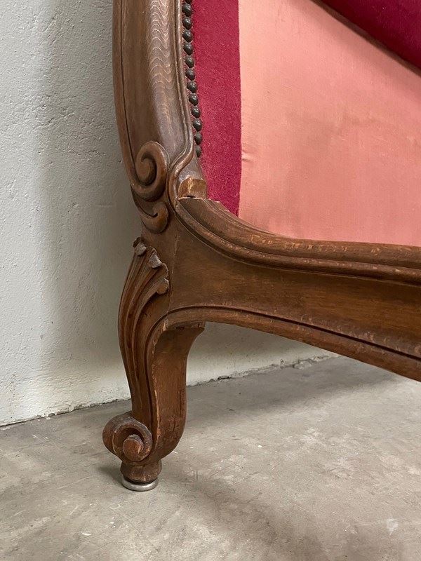 With a scrolled back headboard and footboard, this elegant bed has been upholstered in a pink velvet fabric and now requires re-upholstery.
