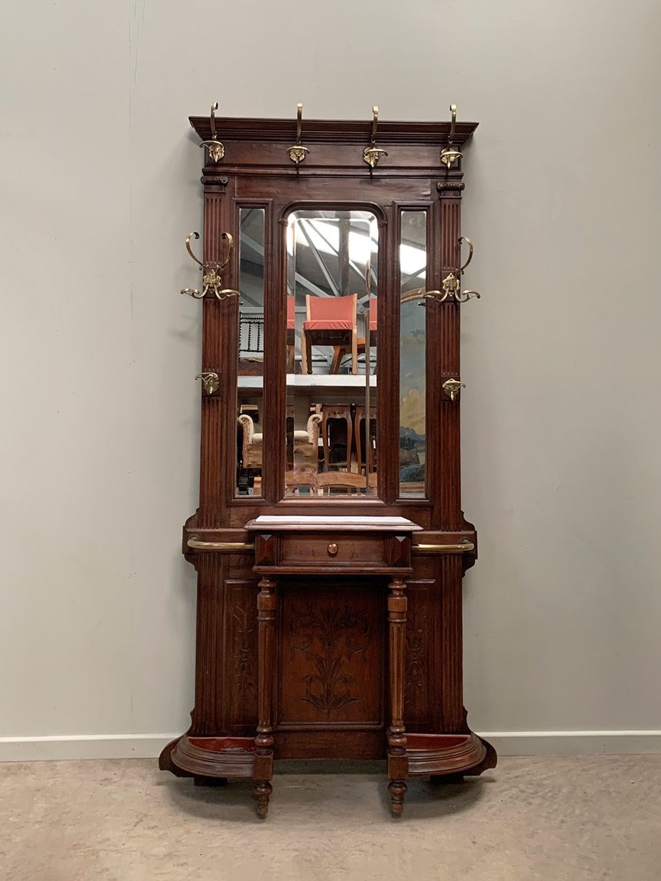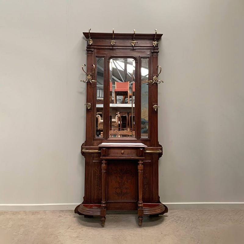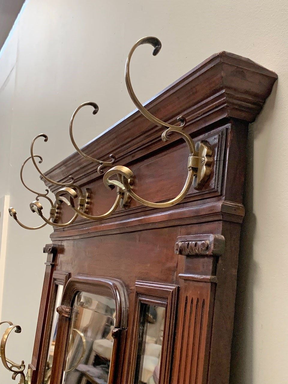 Grand scale 19th century mahogany hall stand with a mirrored back and 8 ornate brass hooks.